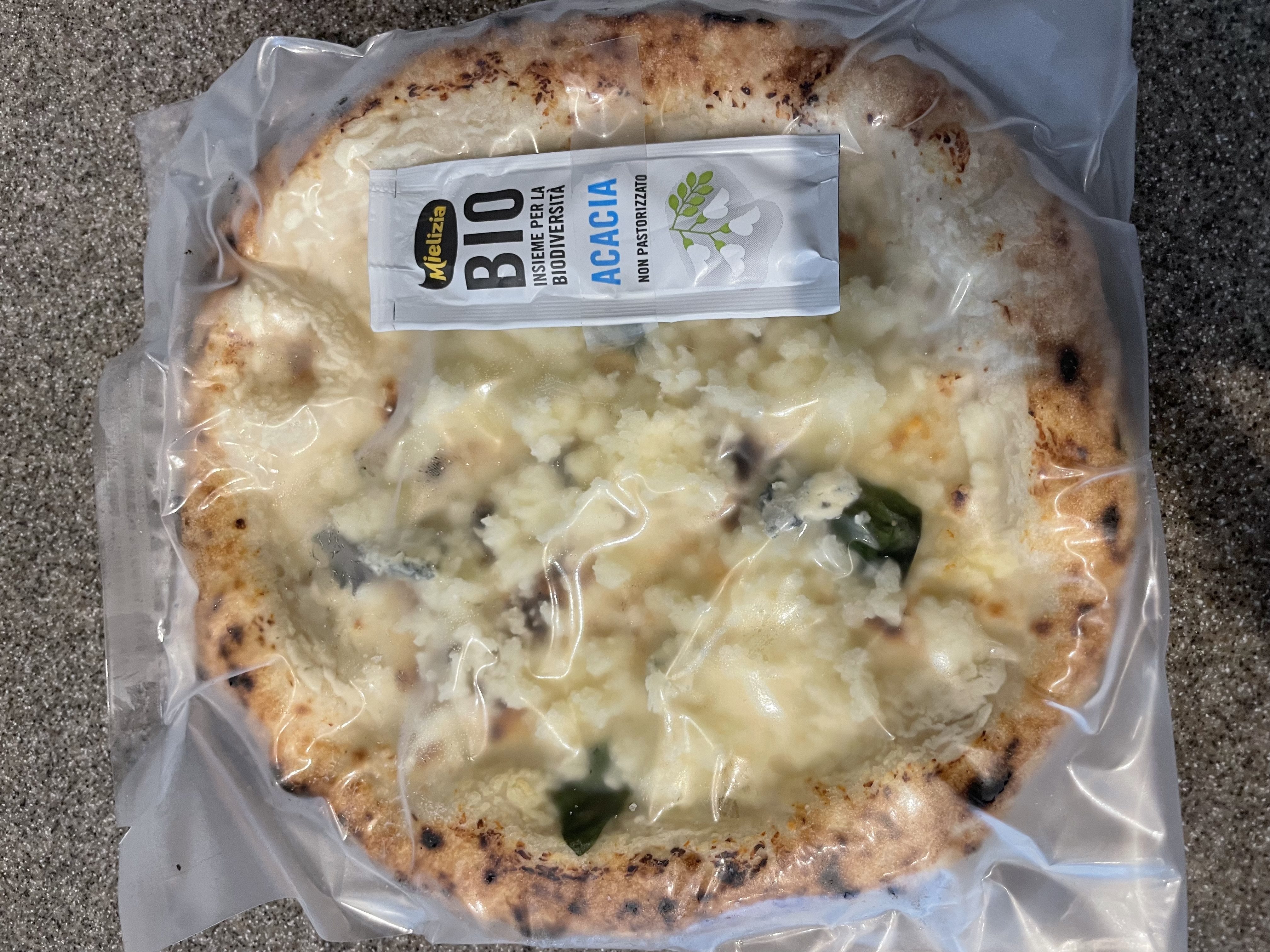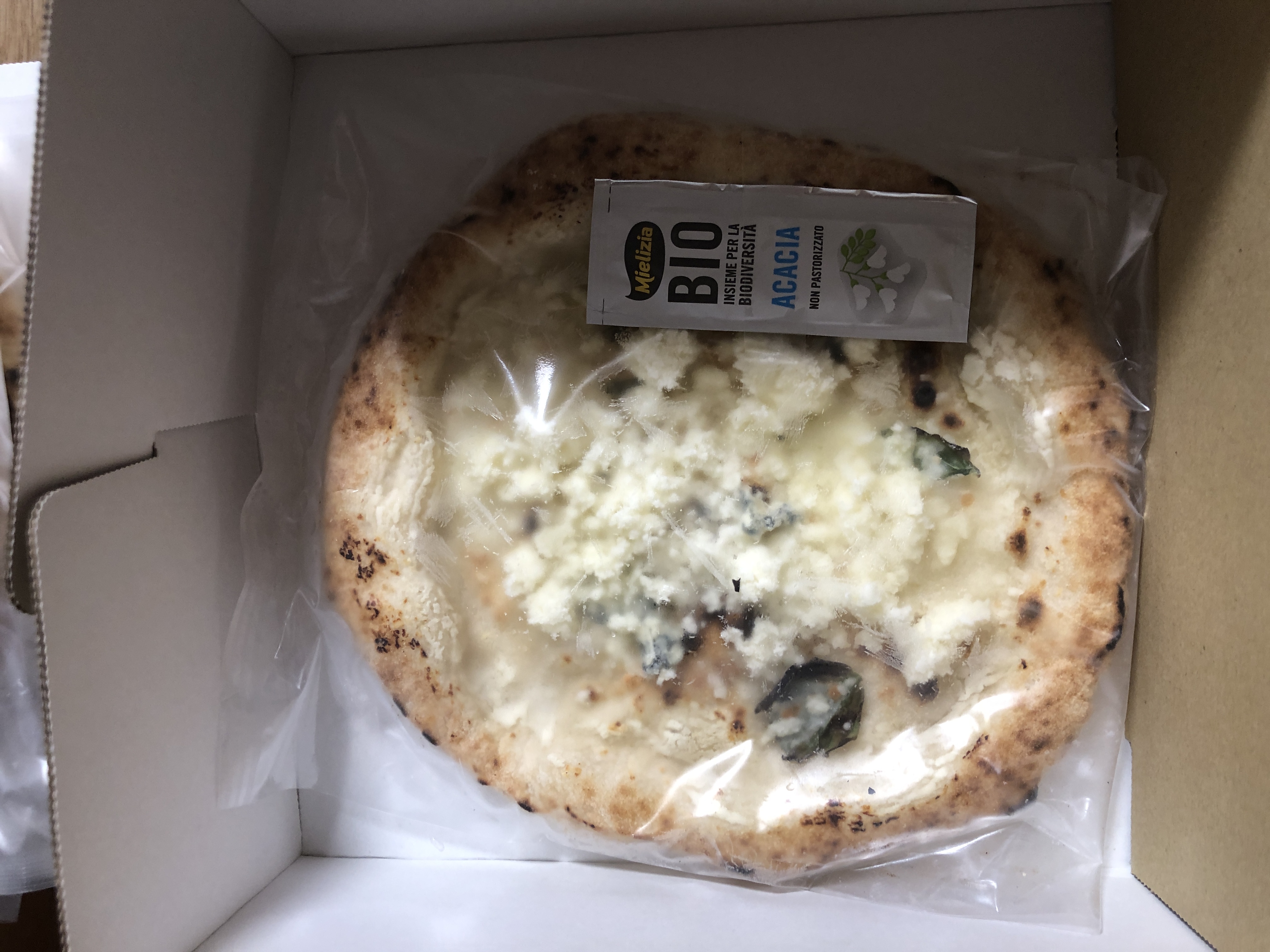 ★クアトロフォルマッジ 「4種のチーズ」という意味を持つデザートピザ。アカシアの有機ハチミツが付いているのが嬉しい~。まずはそのままいただくと、組み合わされたチーズの旨味と塩気を感じます。これはチーズ好きにはたまらない!ゴルゴンゾーラは不使用なのでクセはなく、ここは好みが分かれるところ。LUCA BUONOさんのは万人受けするタイプですね。ハチミツをかけると、塩気×甘さで「甘じょっぱい」魅力が炸裂しますよ。チーズのクリーミーさが引き立ち、もうひと口もうひと口と止まらない!このデサートで〆られるなんてピザ好きにはたまりません。