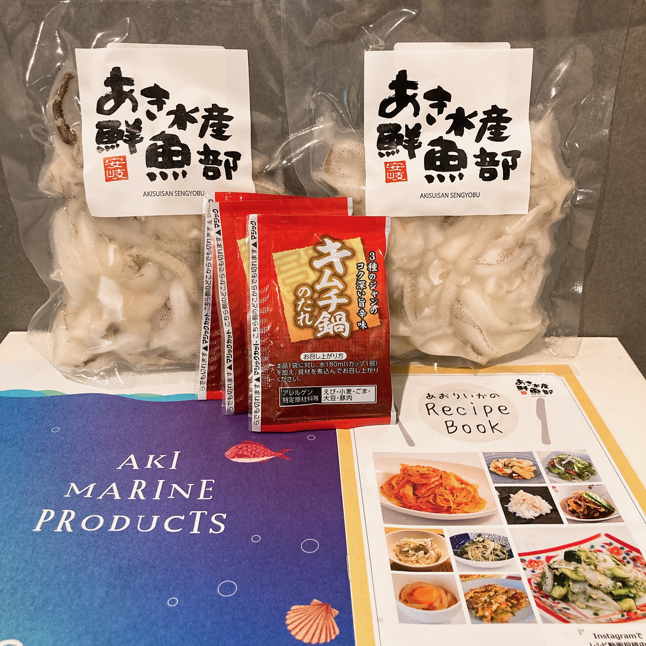 いかゲソのパックのほかに、国産味噌とニンニクやコチュジャンと仕上げた希釈用のキムチ鍋の素が付いてきます。