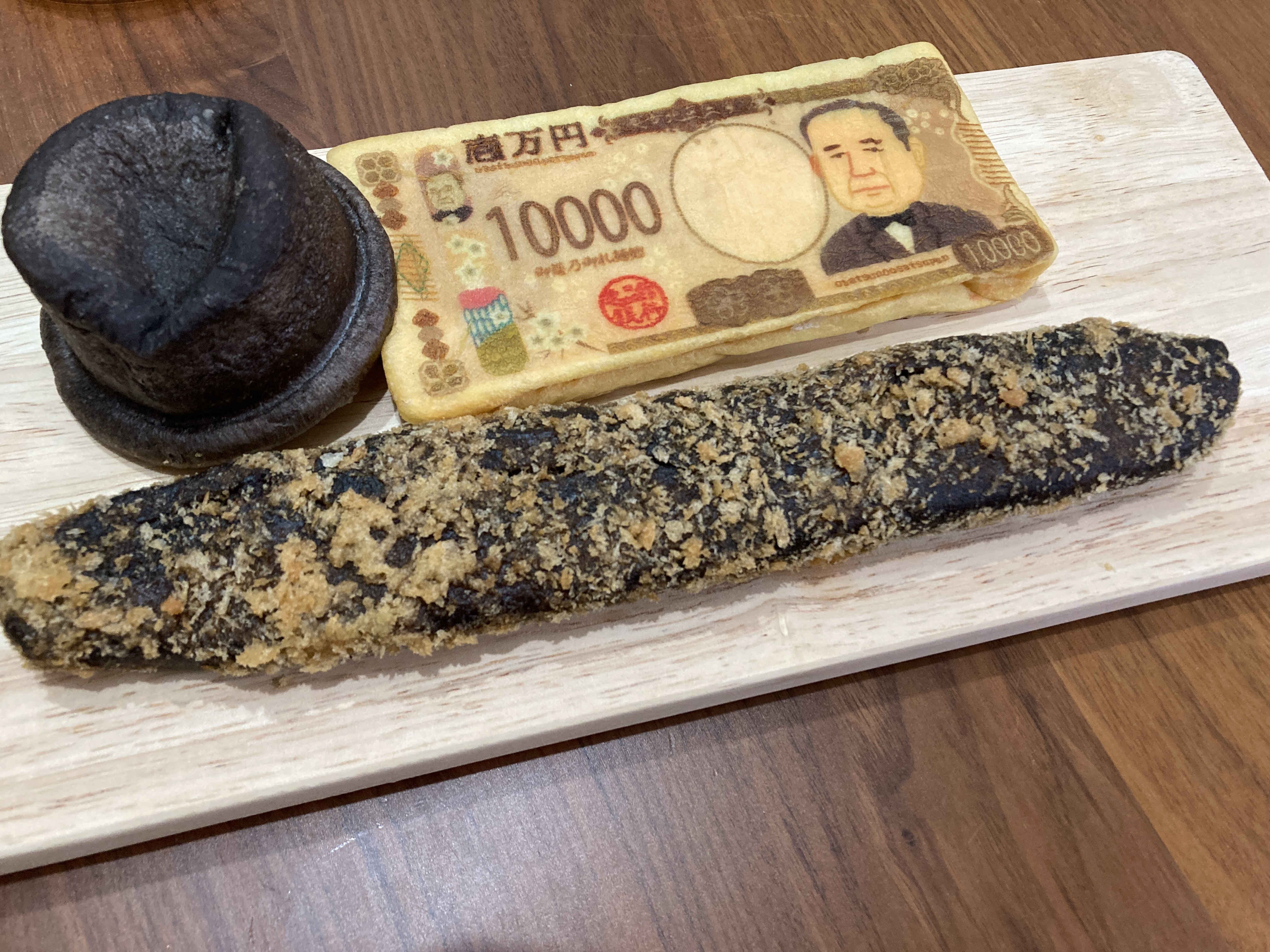 話題性にもなるパンセットです。おさつのお札パン。シルクハットの黒あんパン。素敵(ステッキ)な黒カレーパン。全てユニークなインパクトのある組み合わせです。