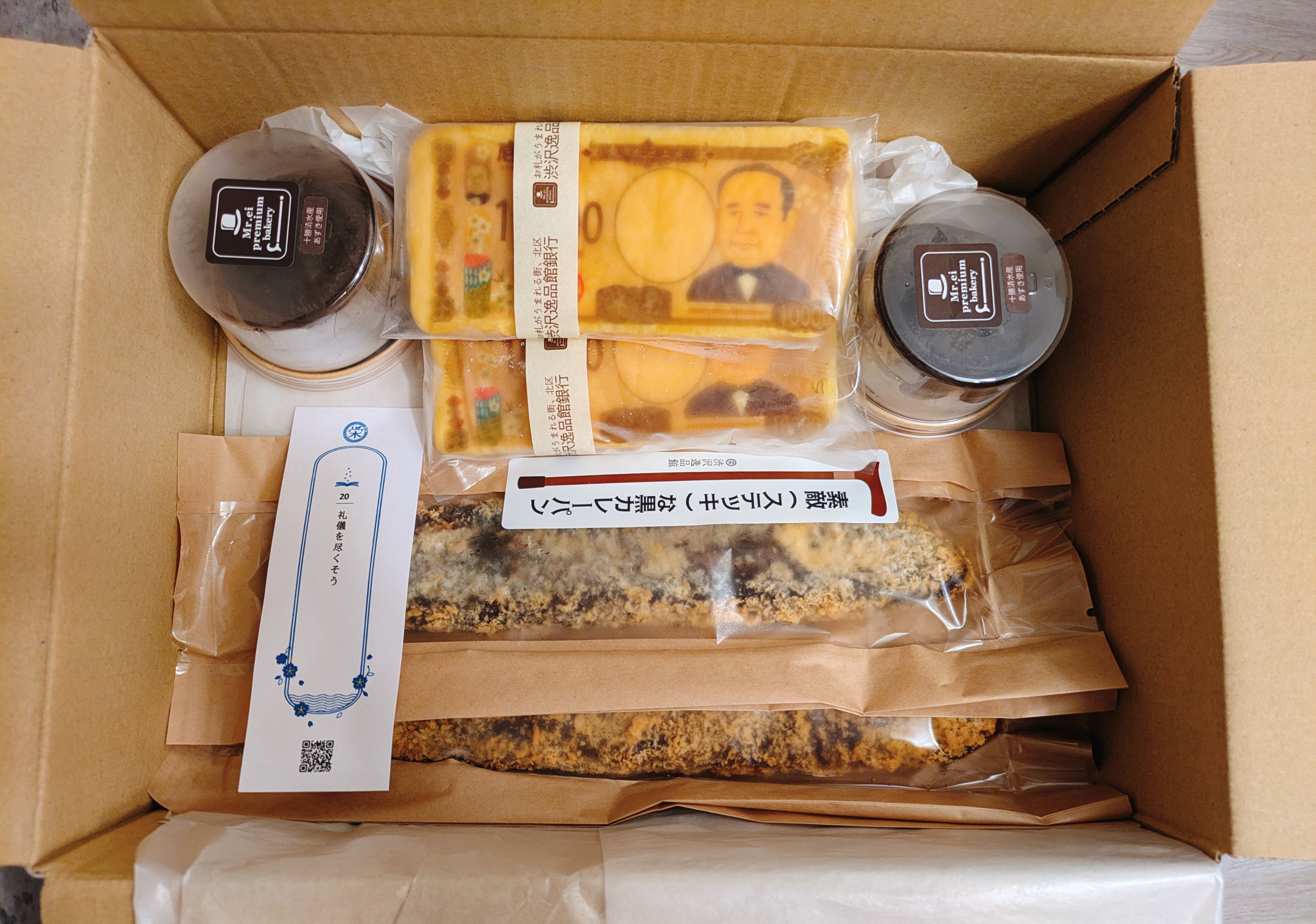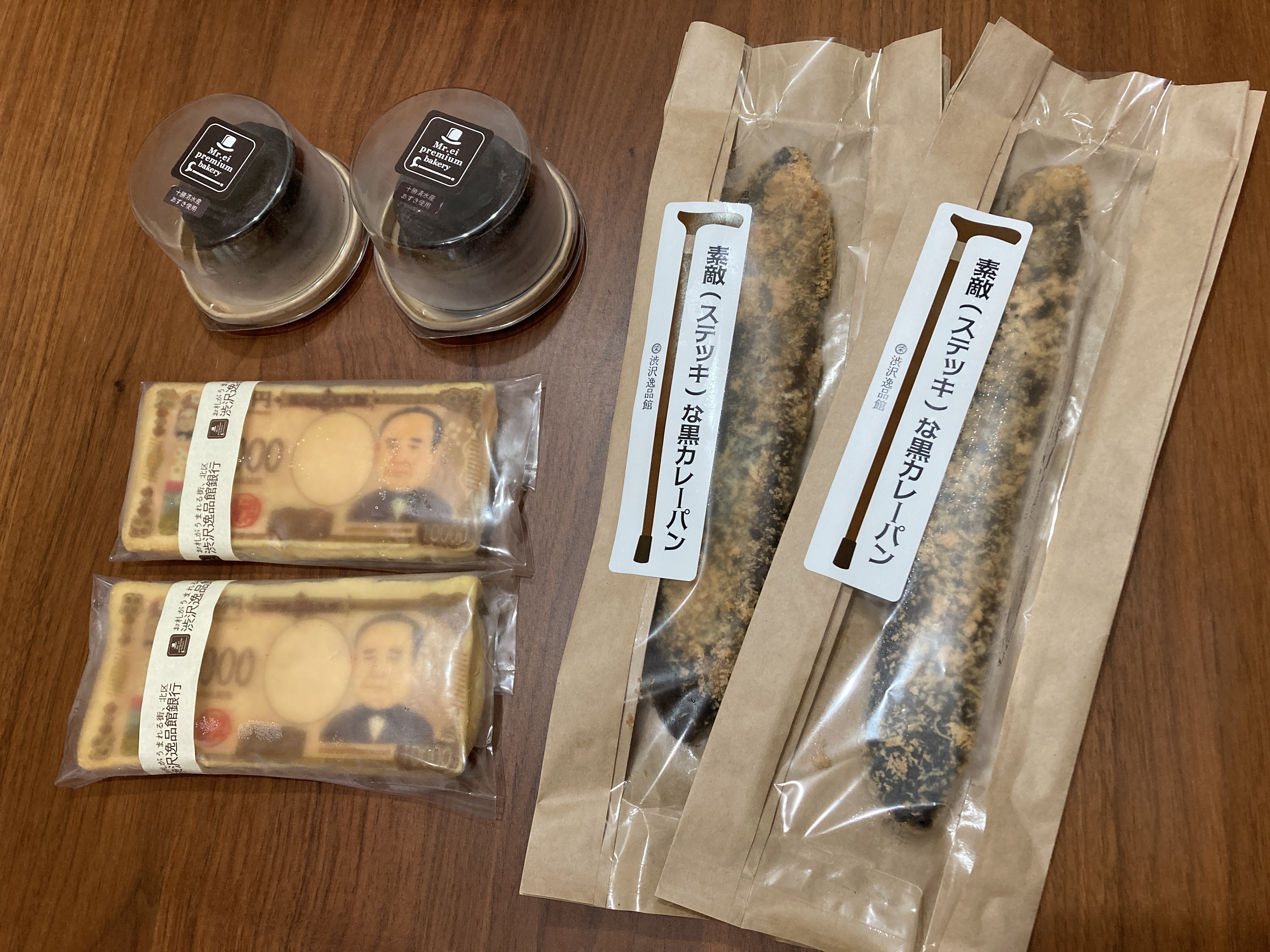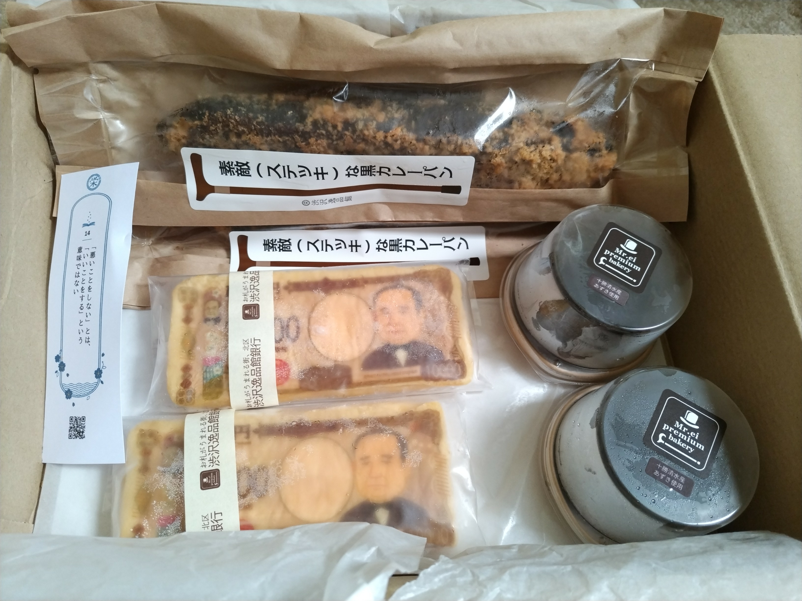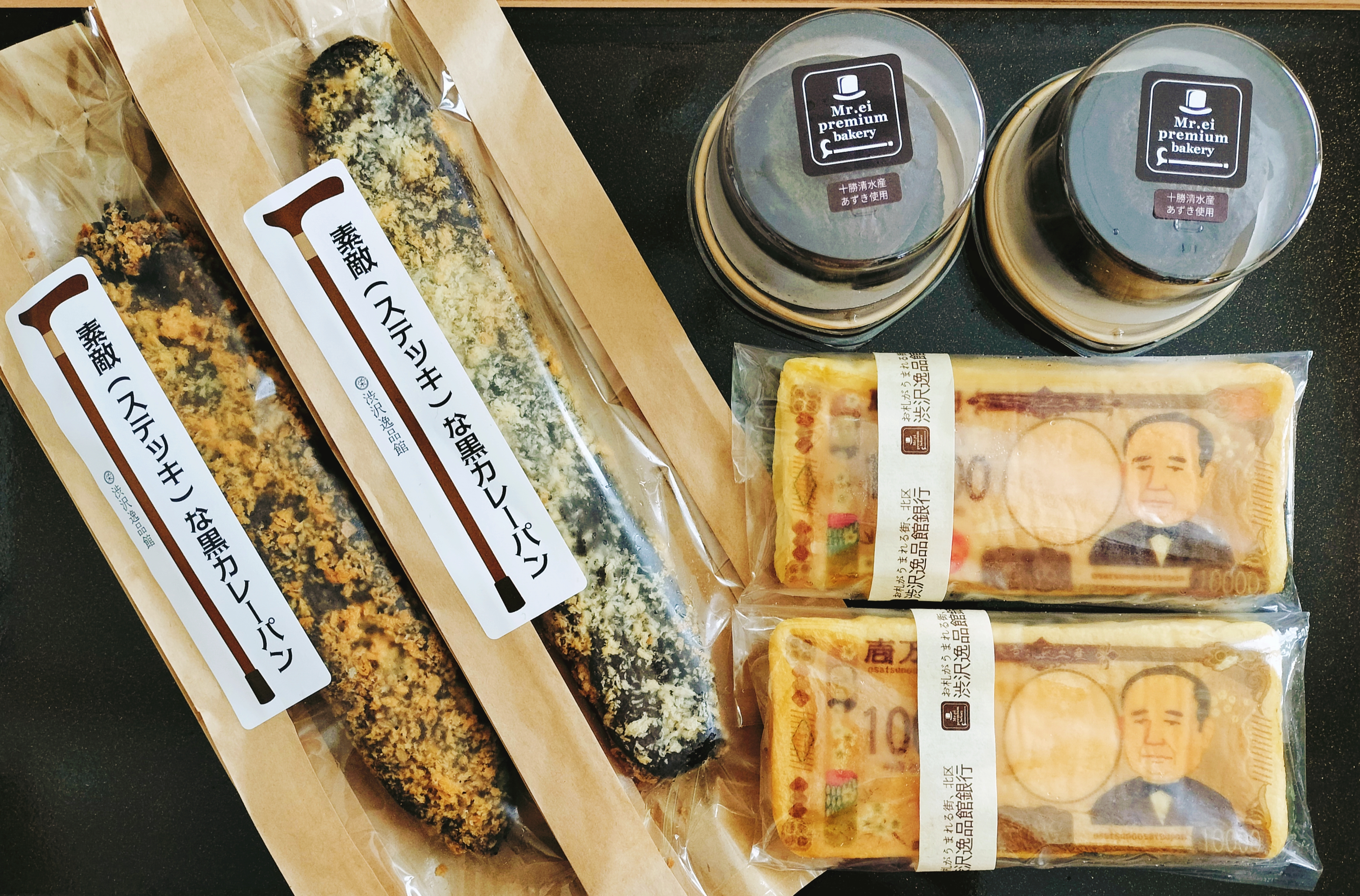 渋沢栄一をイメージした「パン」セットです。紙幣に見立てたイラストが描かれた「おさつのお札パン」。「お札=おさつ=さつまいも」という連想から、自家製焼き芋スイートポテト餡がたっぷり詰まっています。「シルクハットの黒あんぱん」と「素敵な(ステッキな)黒カレーパン」は、渋沢栄一のトレードマークをモチーフに作られたもの。ココア風味の生地の黒あんぱんの中には渋沢栄一ゆかりの地の北海道十勝清水町の小豆と甜菜糖でできたあんこが、カレーパンの中には十勝若牛(ブランド牛)とスパイス感のあるカレーが入っています。異なる味わいのセットなので食べ比べが楽しめます。印象的な見た目でありながら、味にはこだわり感じる商品です。