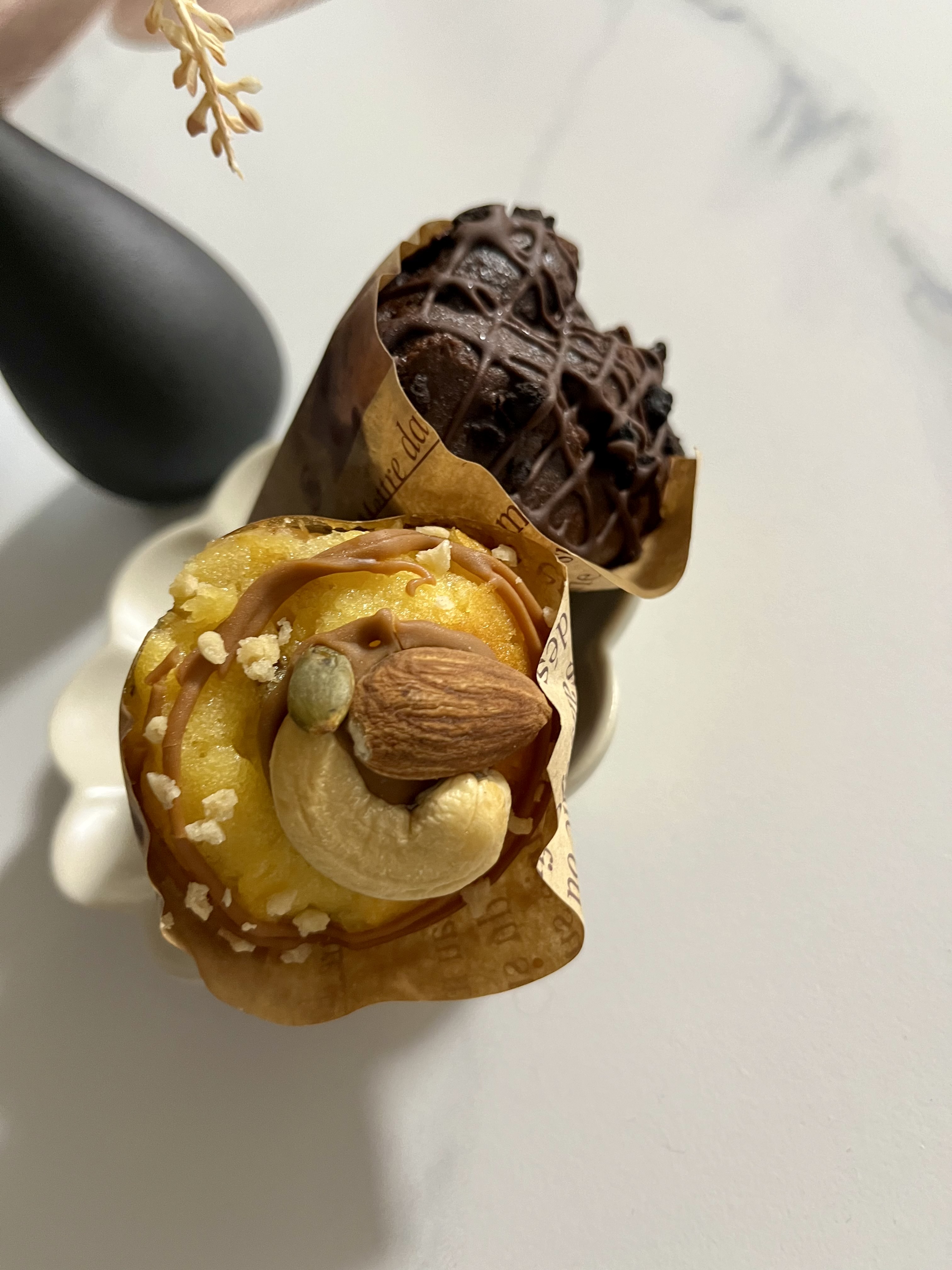 プレーン生地の中にピーナッツキャラメリゼが混ぜ込まれていてキャラメルチョコとナツツ類で,トッピングされ美味しい。キャラメルのやさしい甘さとナツツ類がいいアクセントのマフィン