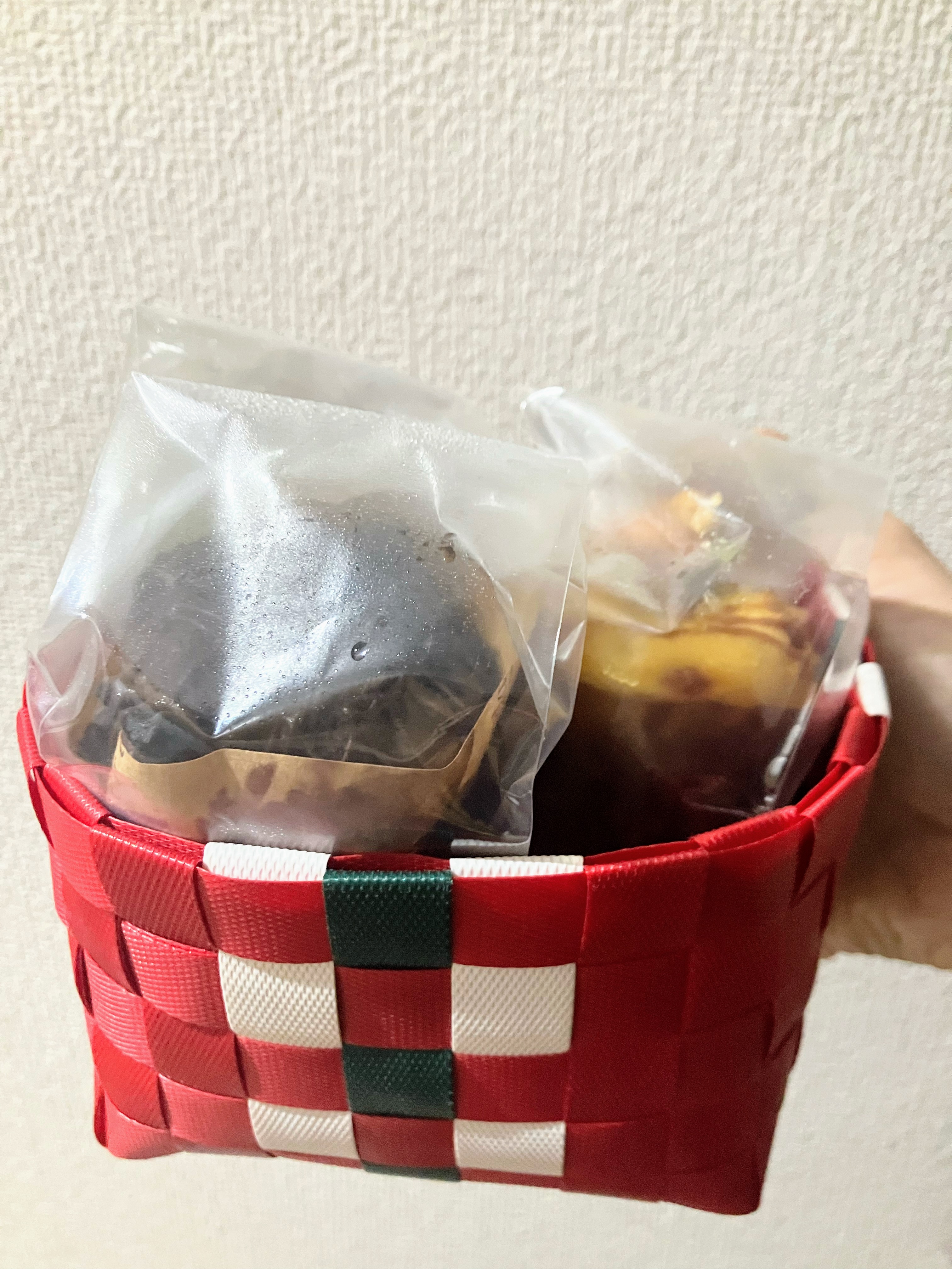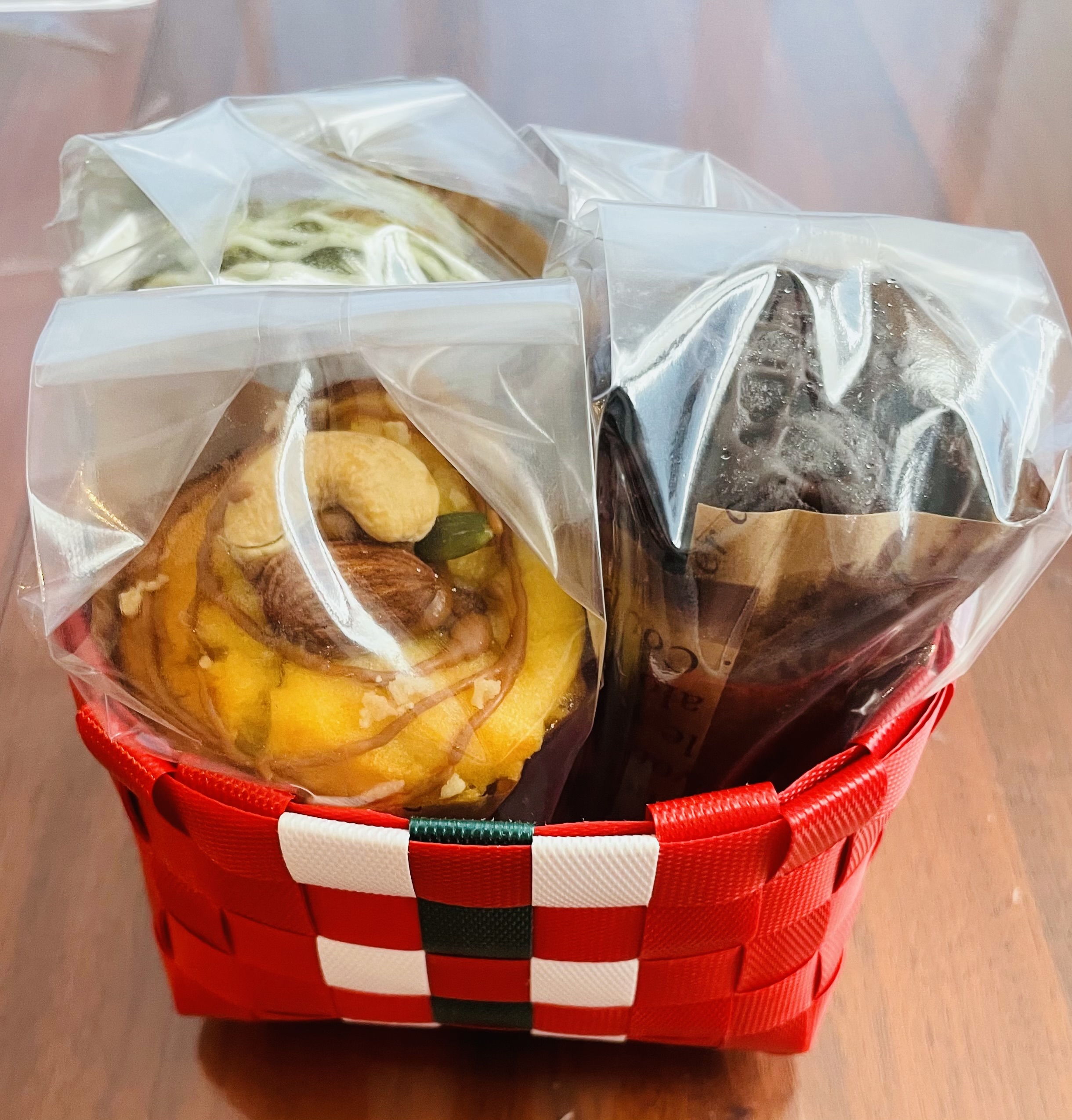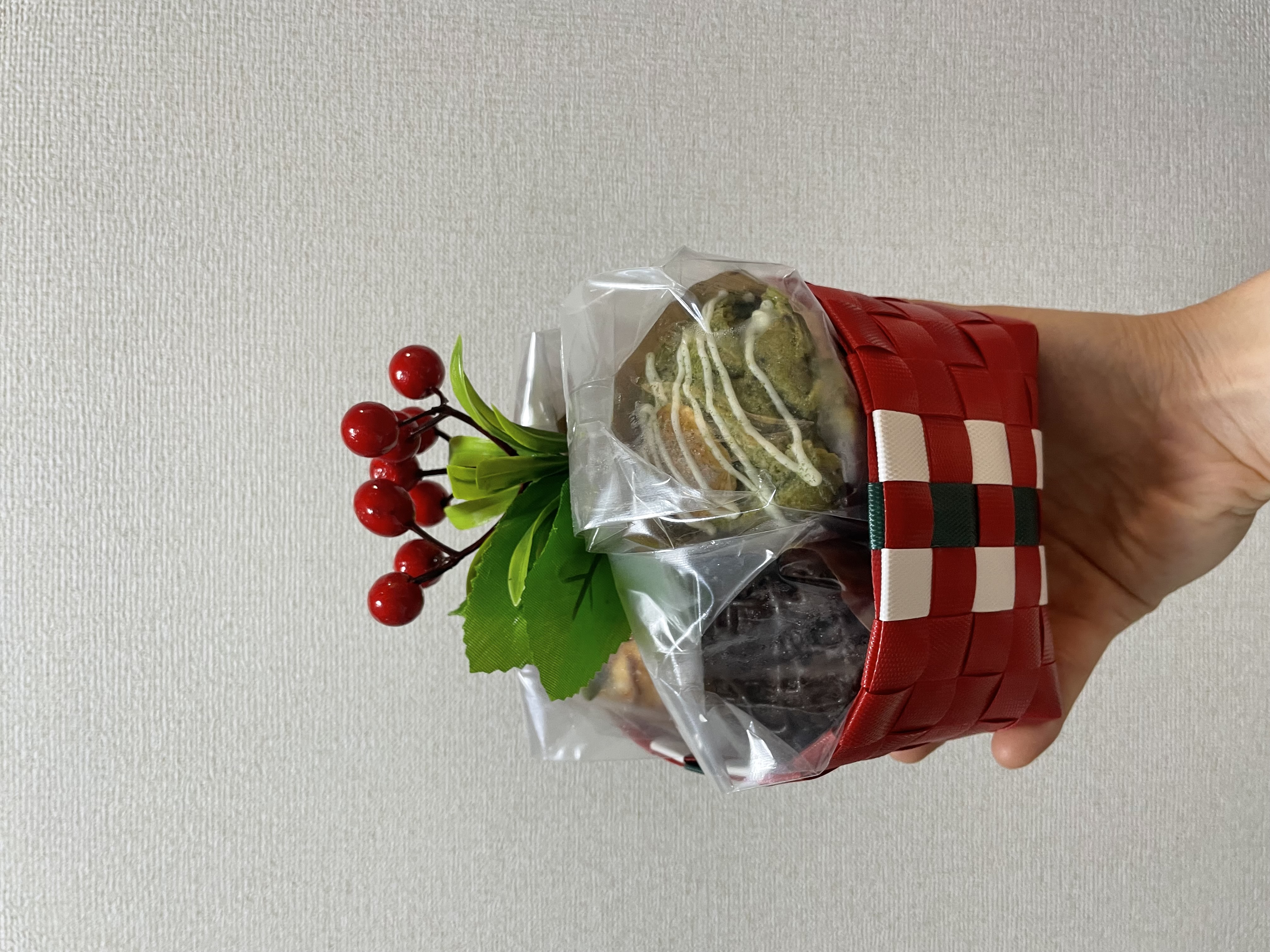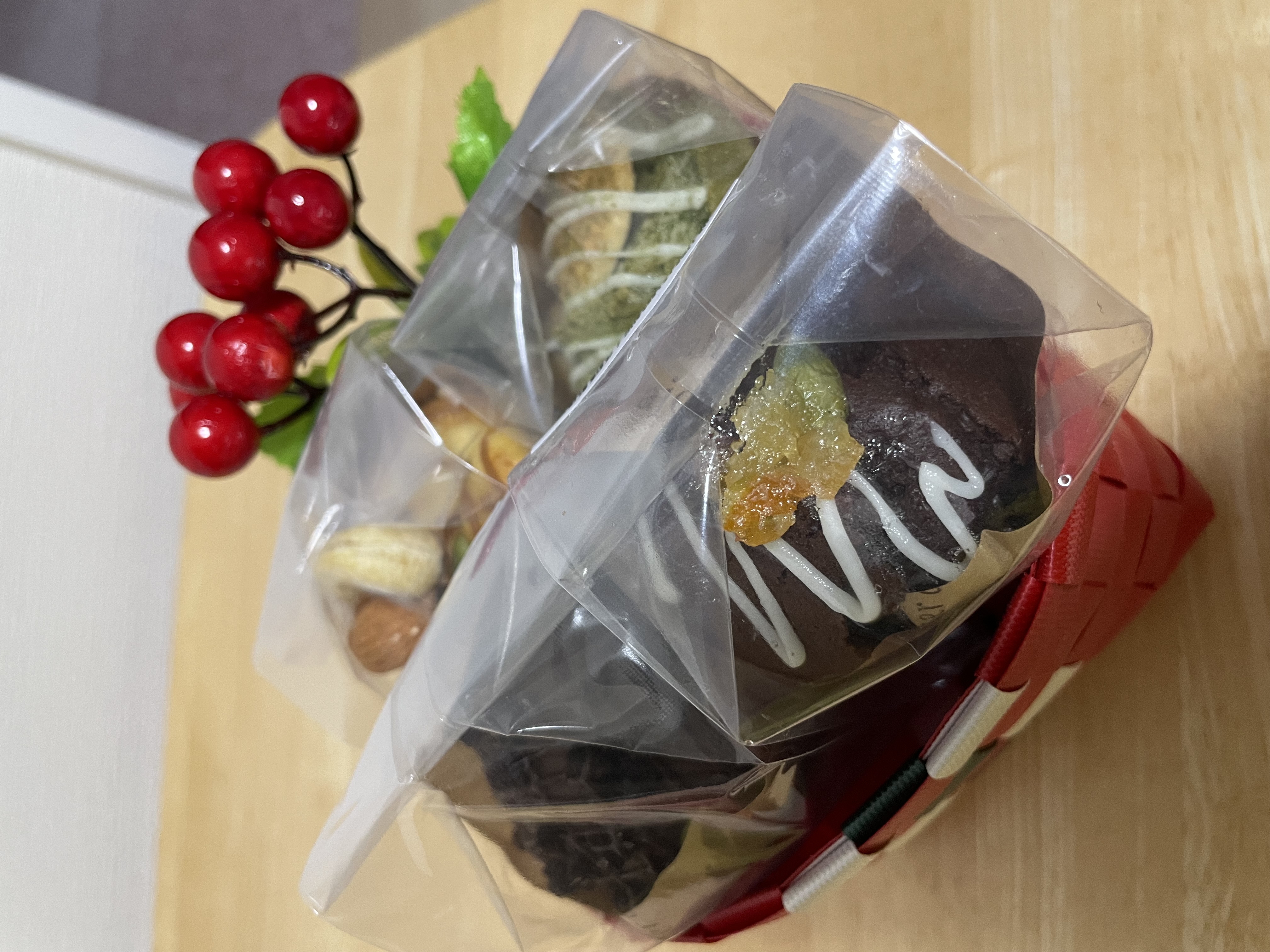 クレープのようにラッピングされた「マフィン」です。片手で食べやすく、しっとりとした食感が特徴で、優しい甘さが幅広い人に好まれます。しっとりとしたココア生地にチョコレートがたっぷり入った「チョコレートチョコレート」、ふわふわのプレーン生地にピーナッツキャラメリゼを混ぜ込んだ「キャラメルナッツ」など4種。異なる味わいをセットで楽しめるので、食べ比べにもぴったりです。赤いかごに花束のように詰められて届くため、贈り物にもおすすめです。