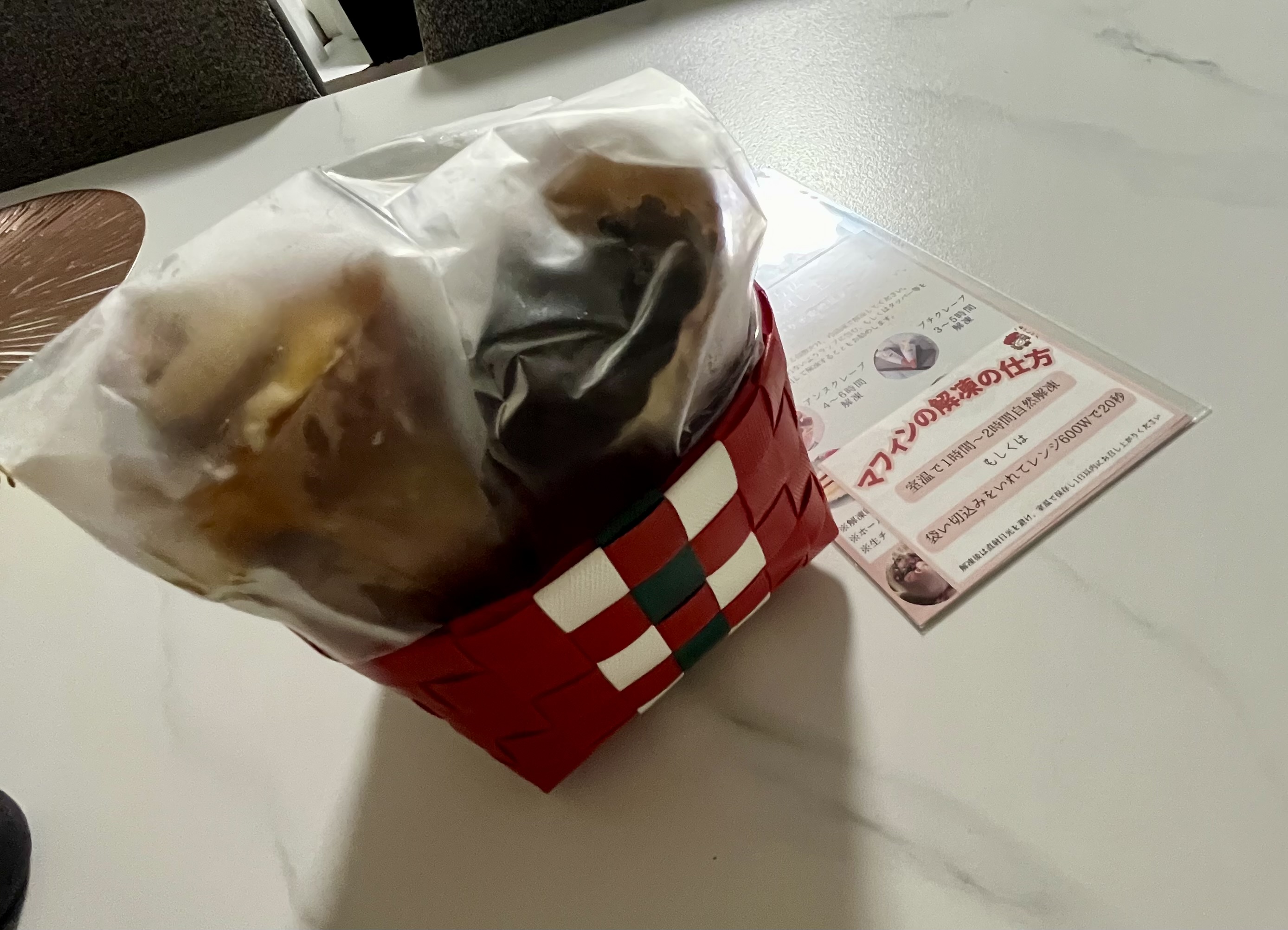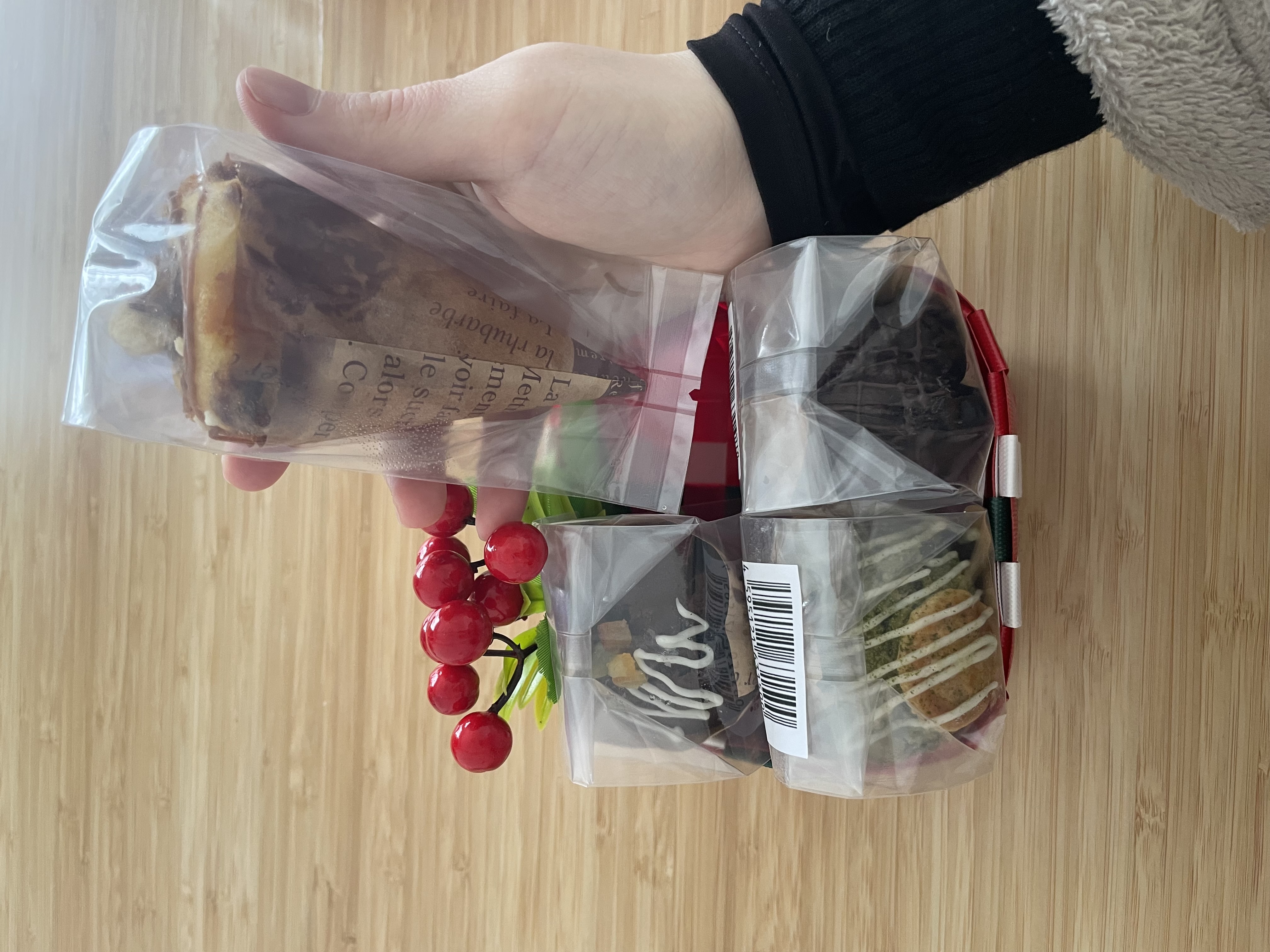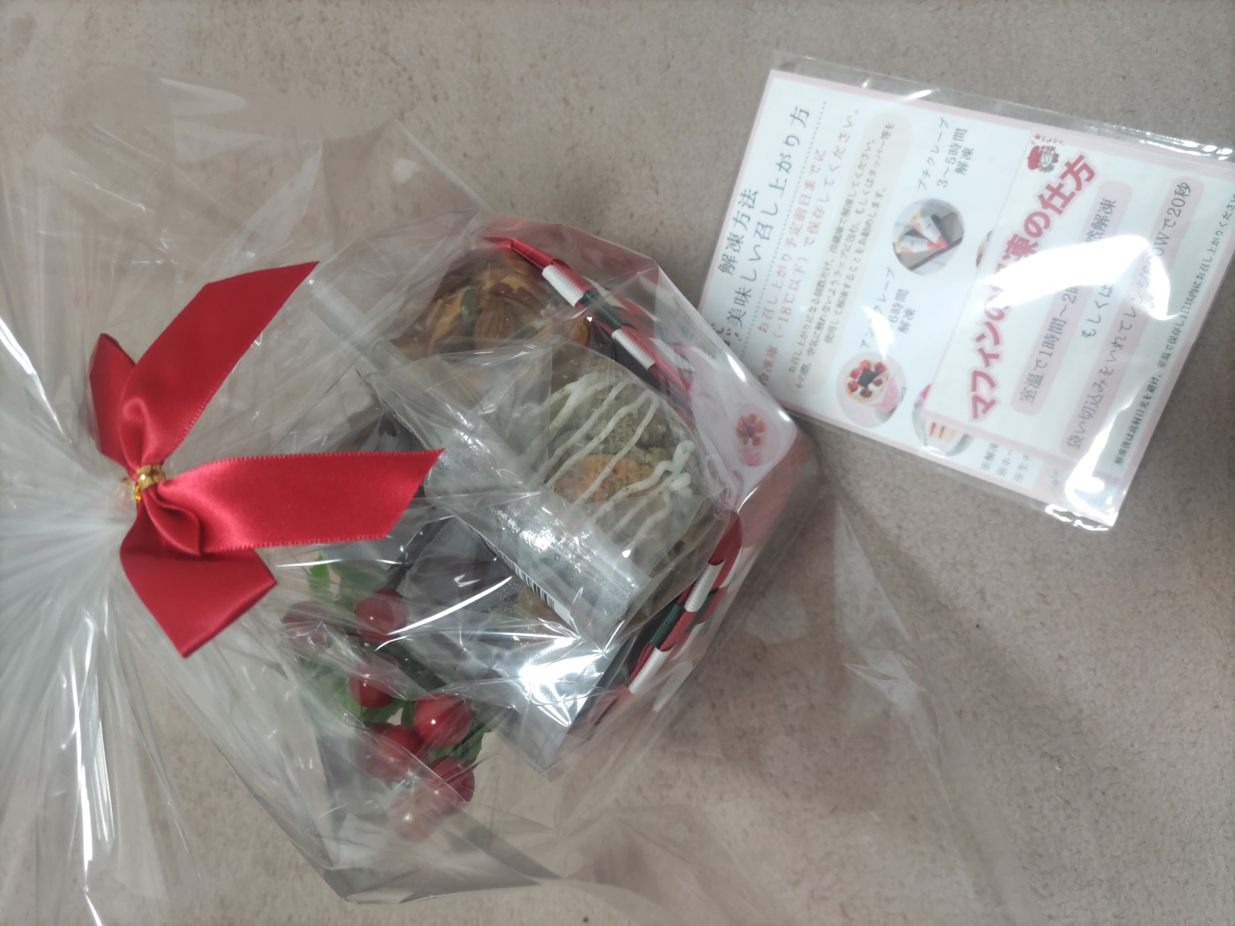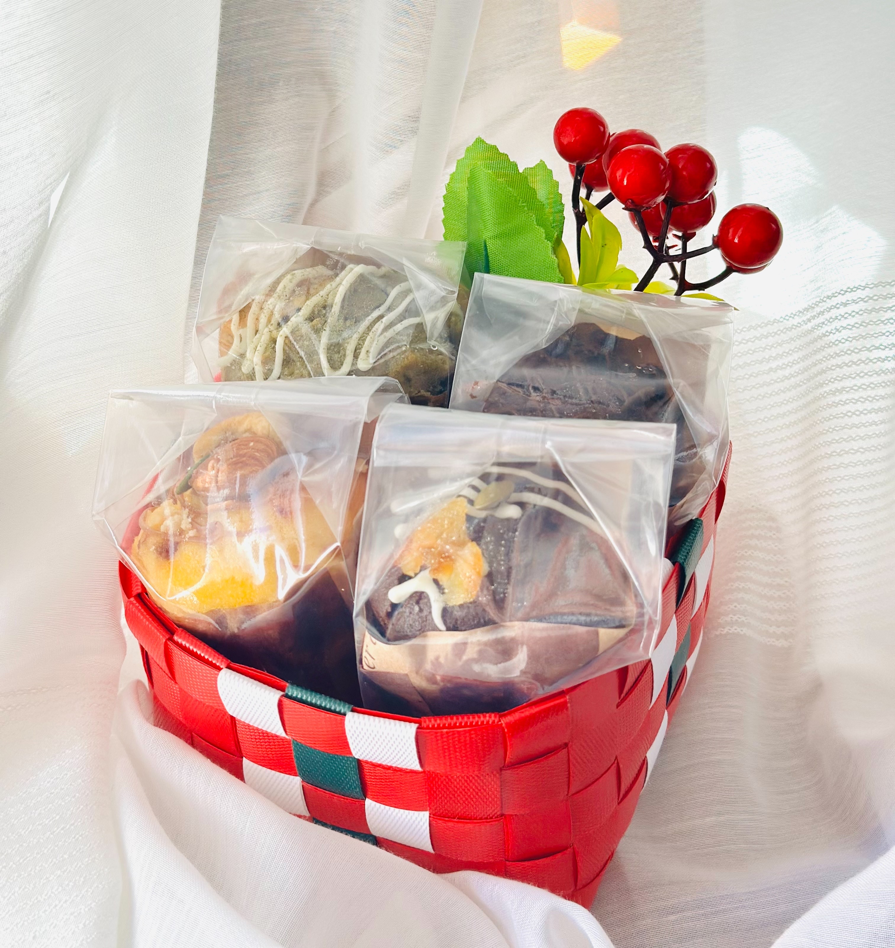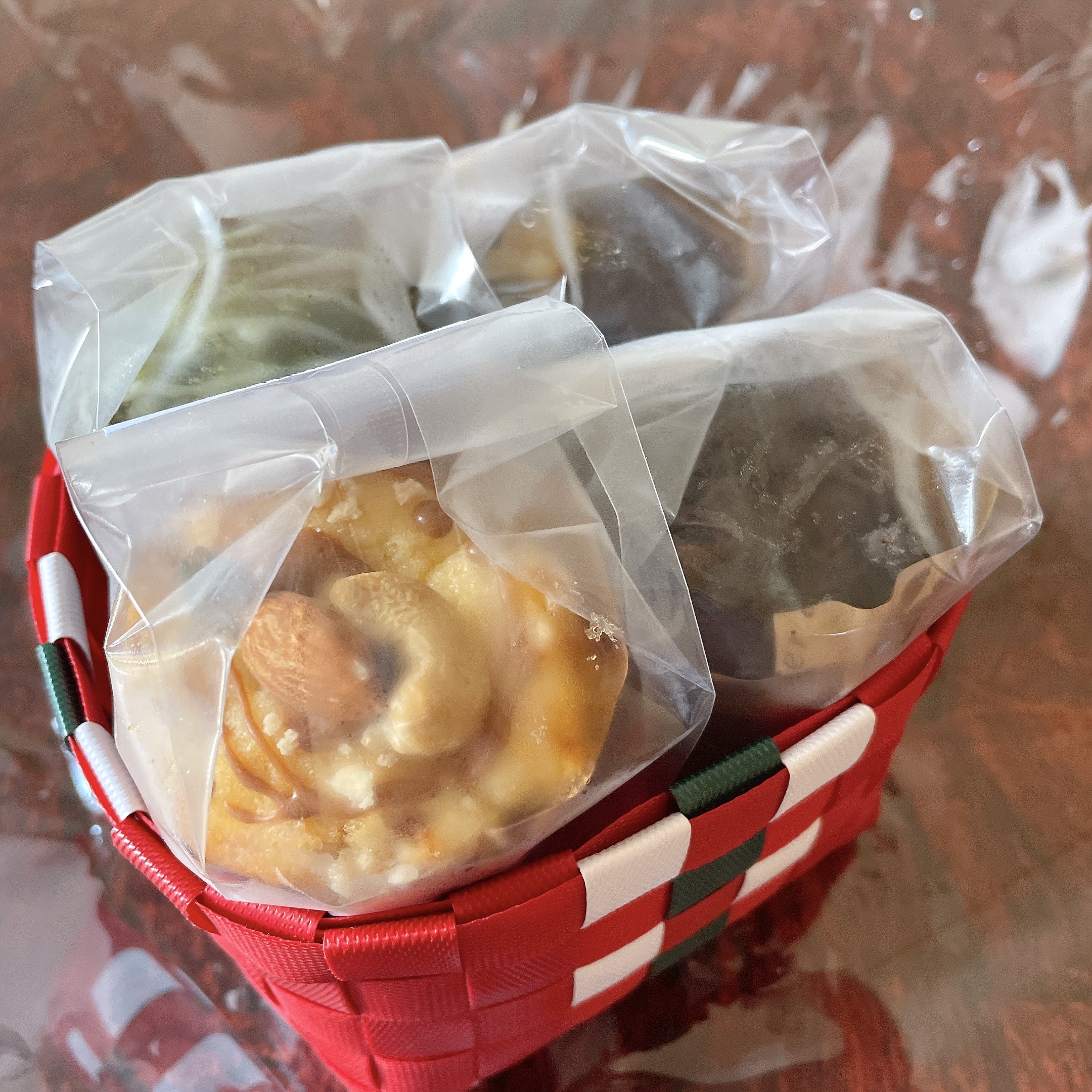 クレープのようにラッピングされた「マフィン」です。片手で食べやすく、しっとりとした食感が特徴で、優しい甘さが幅広い人に好まれます。しっとりとしたココア生地にチョコレートがたっぷり入った「チョコレートチョコレート」、ふわふわのプレーン生地にピーナッツキャラメリゼを混ぜ込んだ「キャラメルナッツ」など4種。異なる味わいをセットで楽しめるので、食べ比べにもぴったりです。赤いかごに花束のように詰められて届くため、贈り物にもおすすめです。