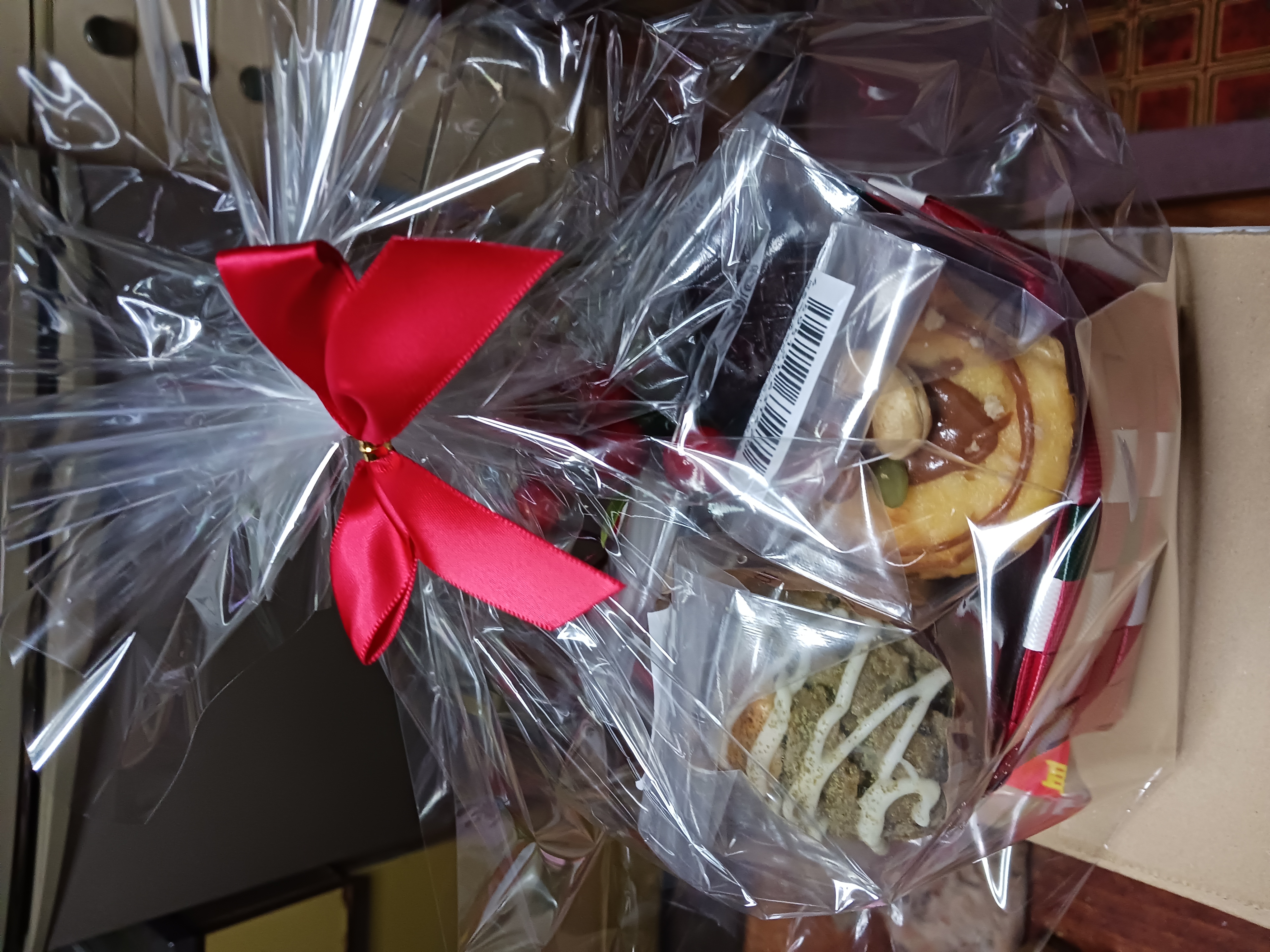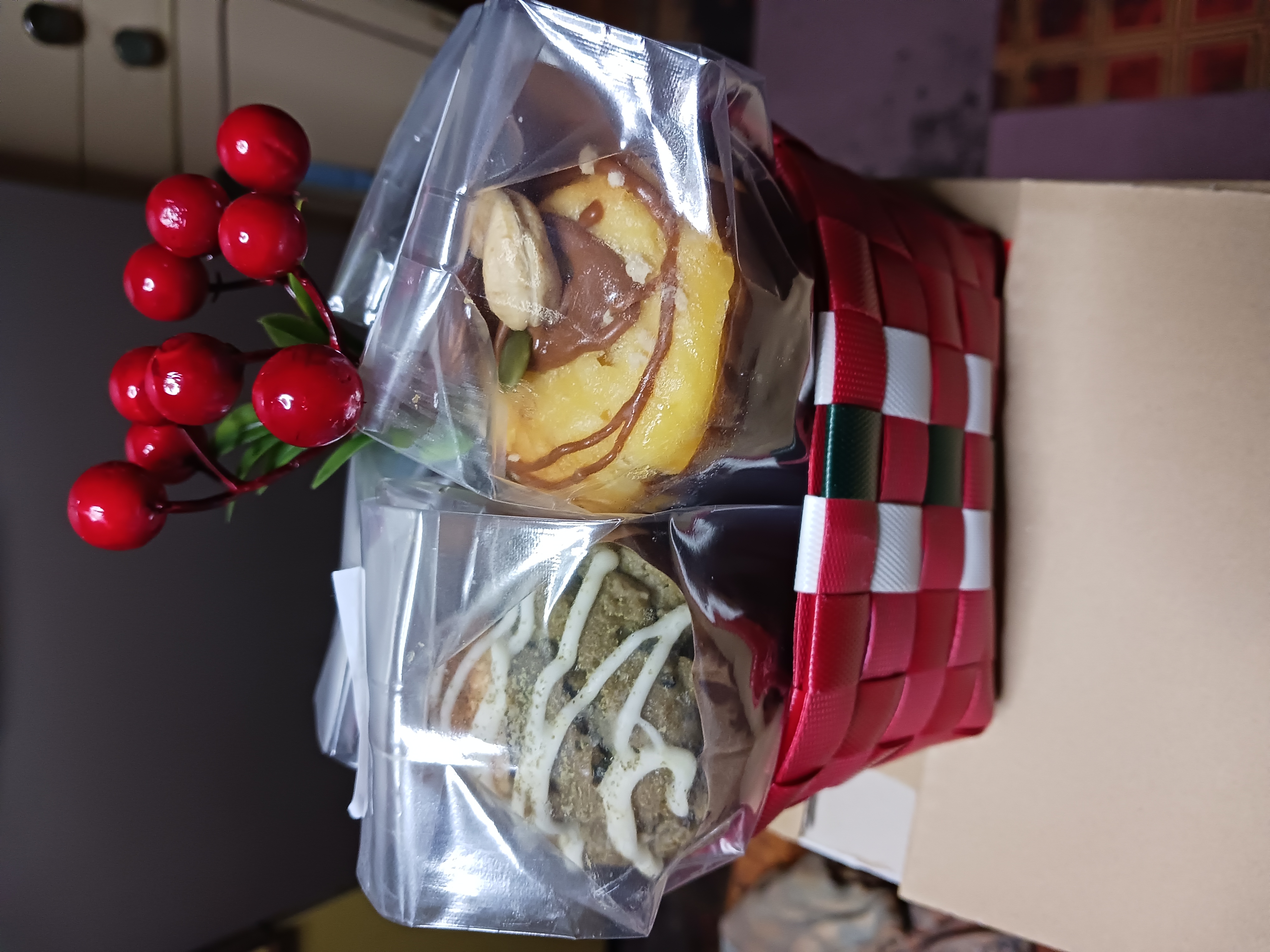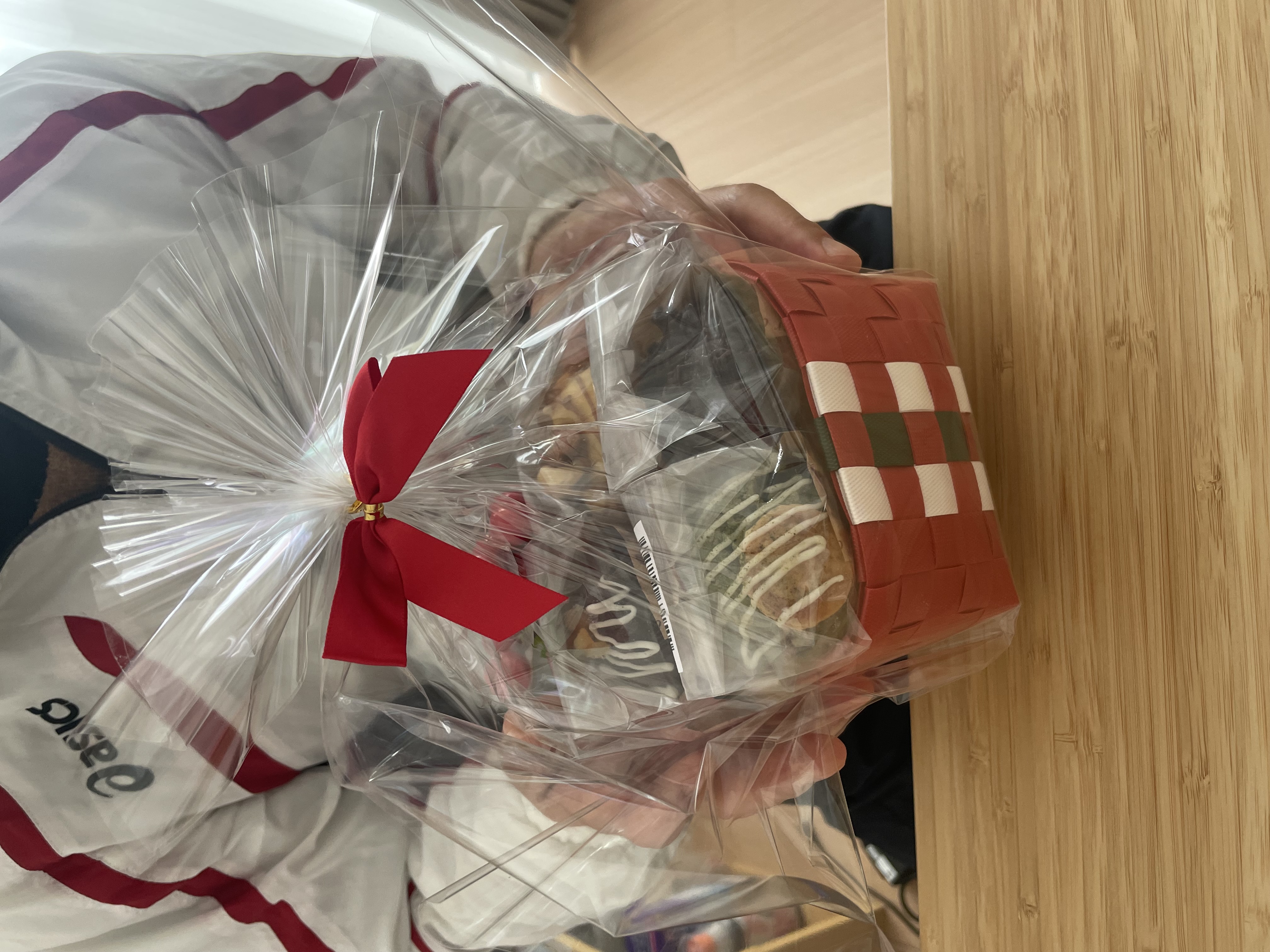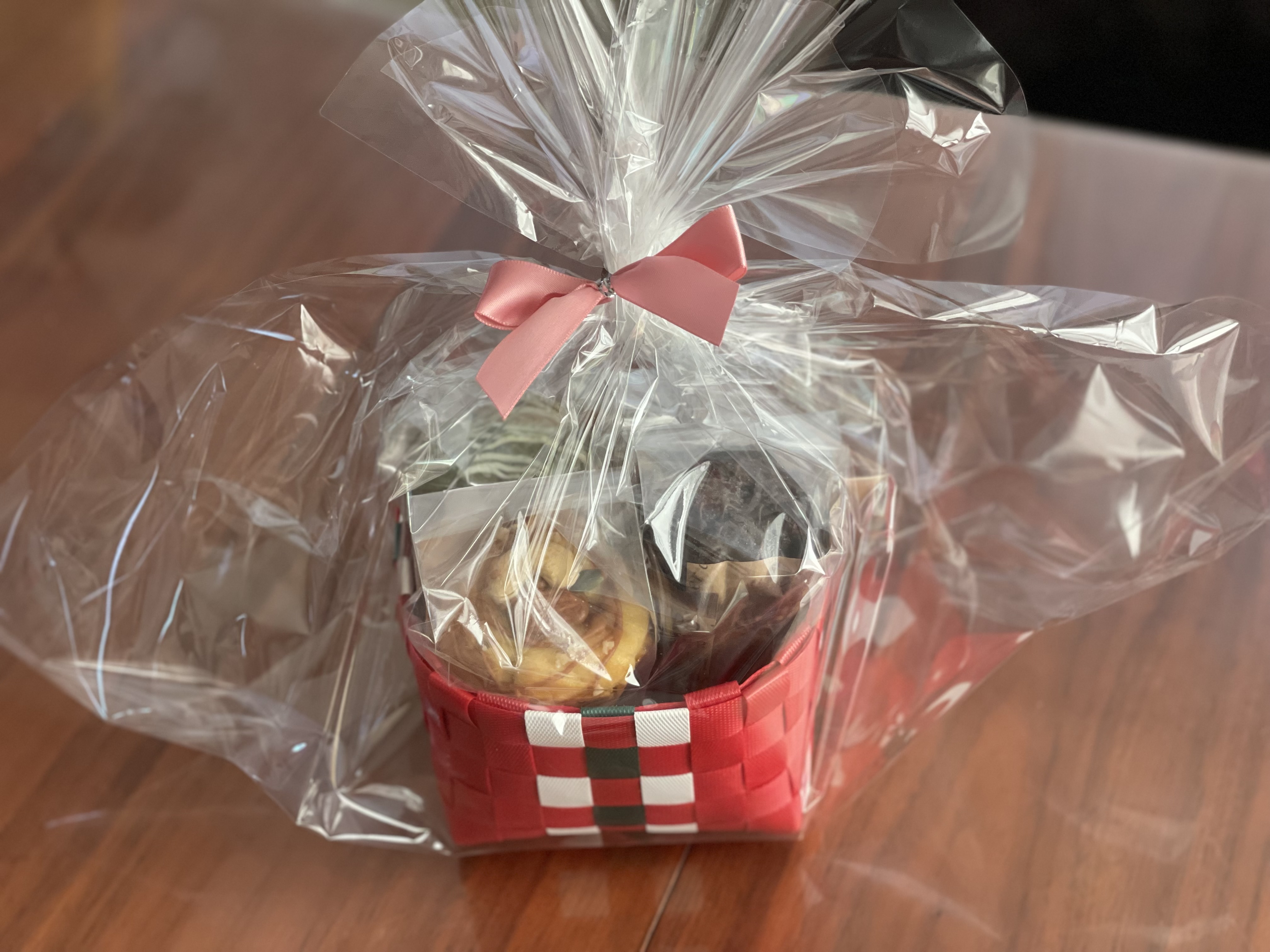 クレープのようにラッピングされた「マフィン」です。片手で食べやすく、しっとりとした食感が特徴で、優しい甘さが幅広い人に好まれます。しっとりとしたココア生地にチョコレートがたっぷり入った「チョコレートチョコレート」、ふわふわのプレーン生地にピーナッツキャラメリゼを混ぜ込んだ「キャラメルナッツ」など4種。異なる味わいをセットで楽しめるので、食べ比べにもぴったりです。赤いかごに花束のように詰められて届くため、贈り物にもおすすめです。