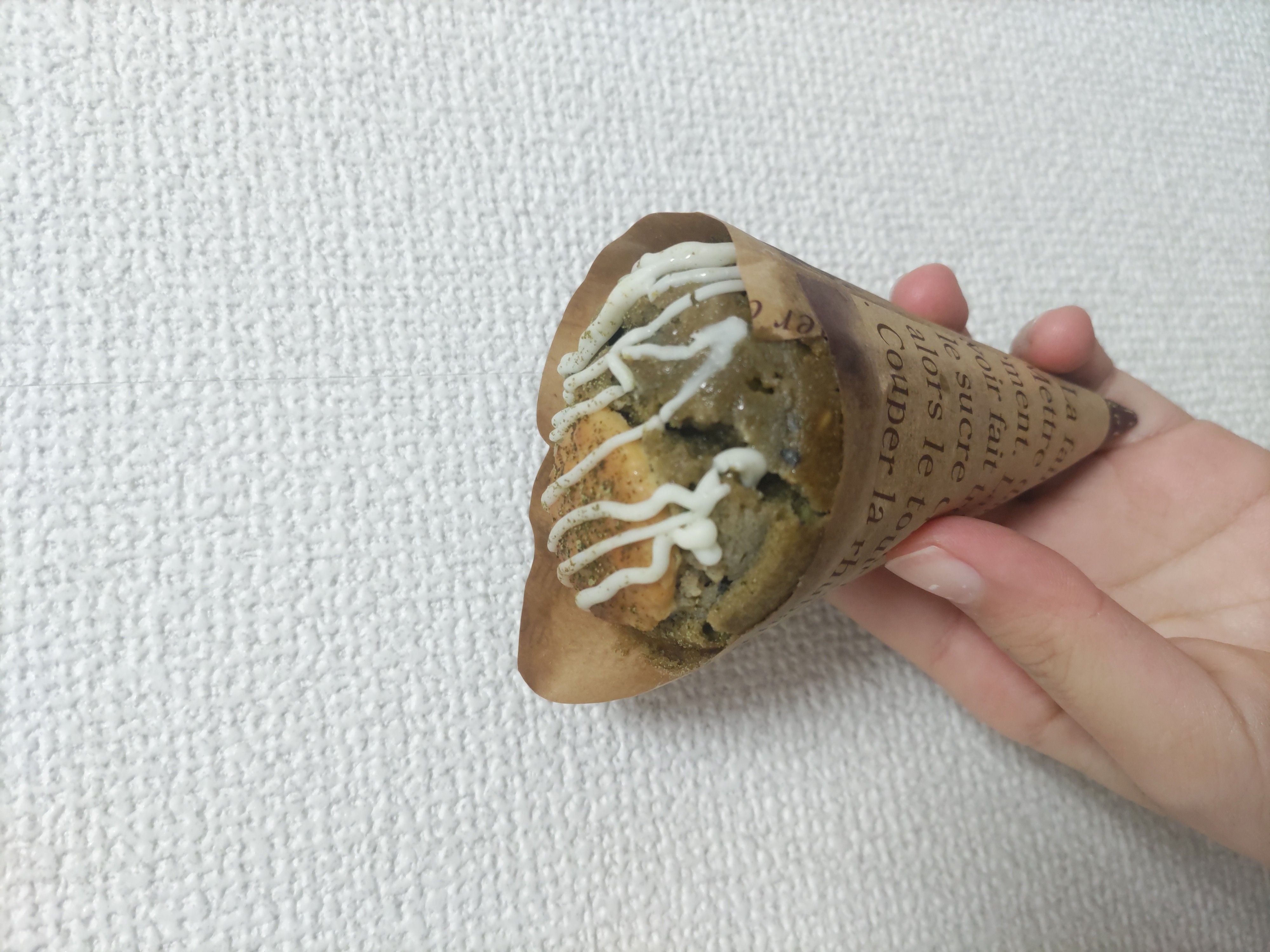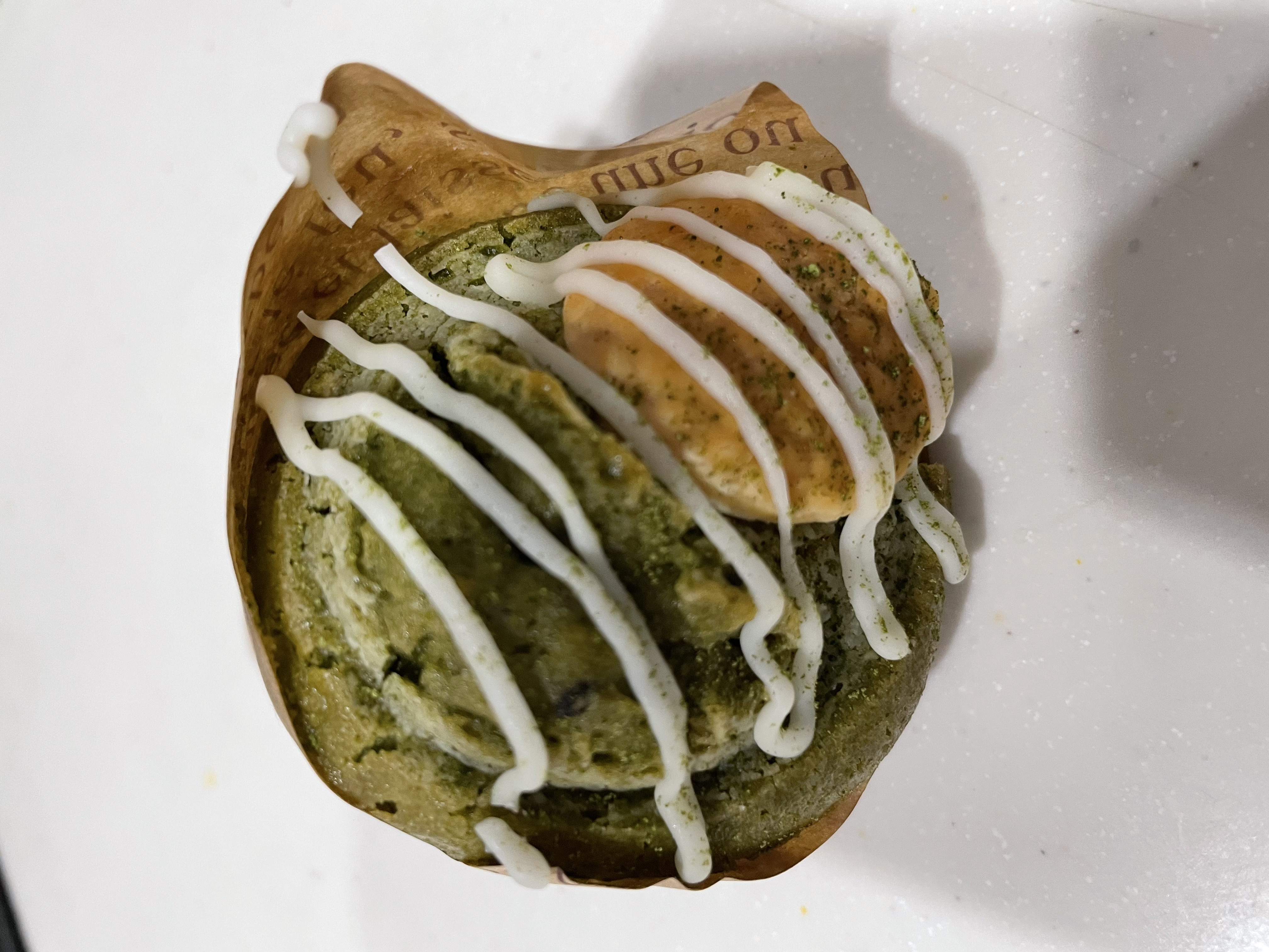 宇治抹茶を使用した生地にごまも少々混ぜ込まれていて抹茶のほろ苦さとホワイトチョコの甘さがピッタリ合って美味しい。思ったより抹茶の味もしっかり感じられるマフィン