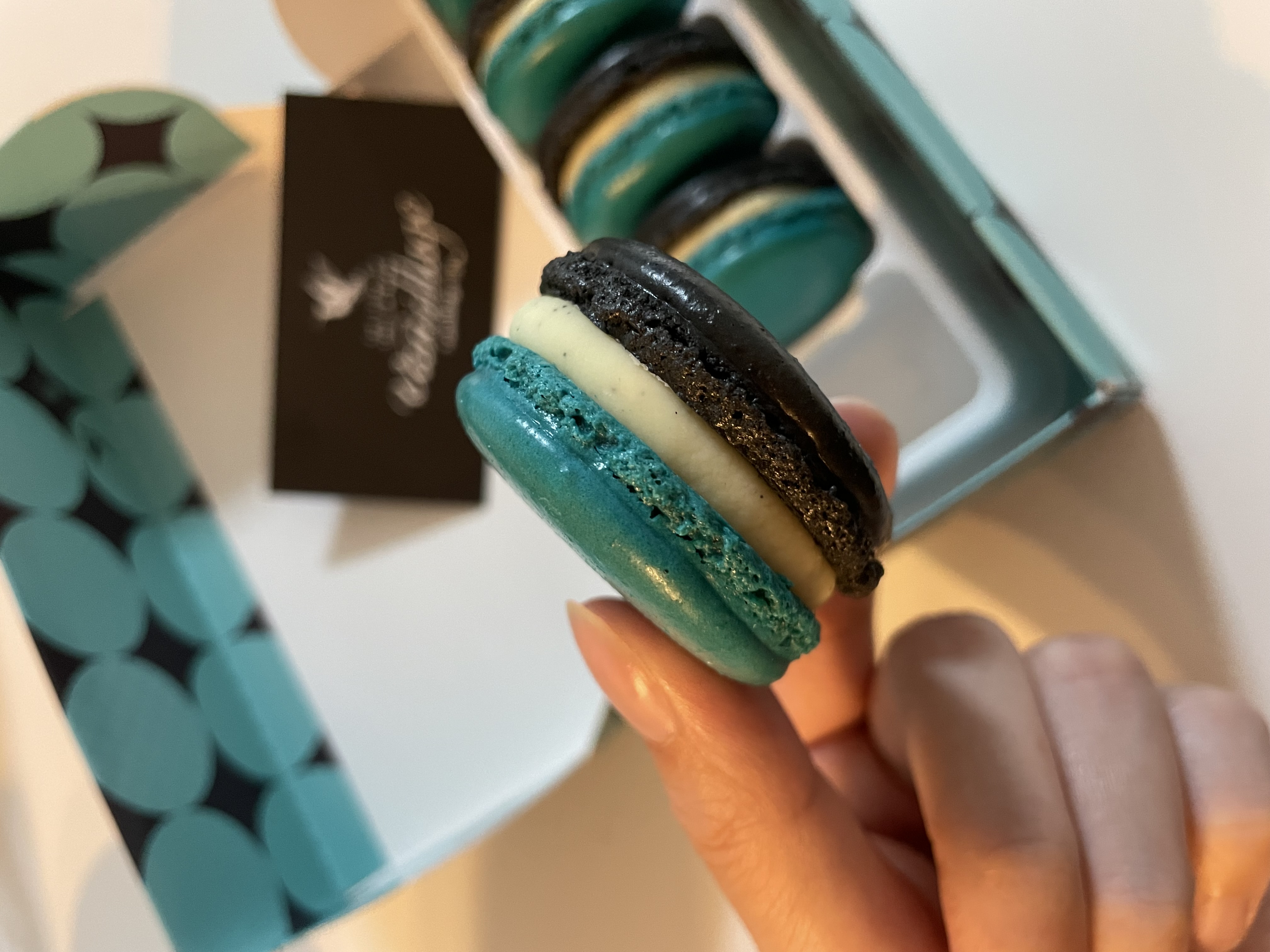 パッケージの可愛らしさに、青と黒カラーのインパクト、マカロンのおいしさ。