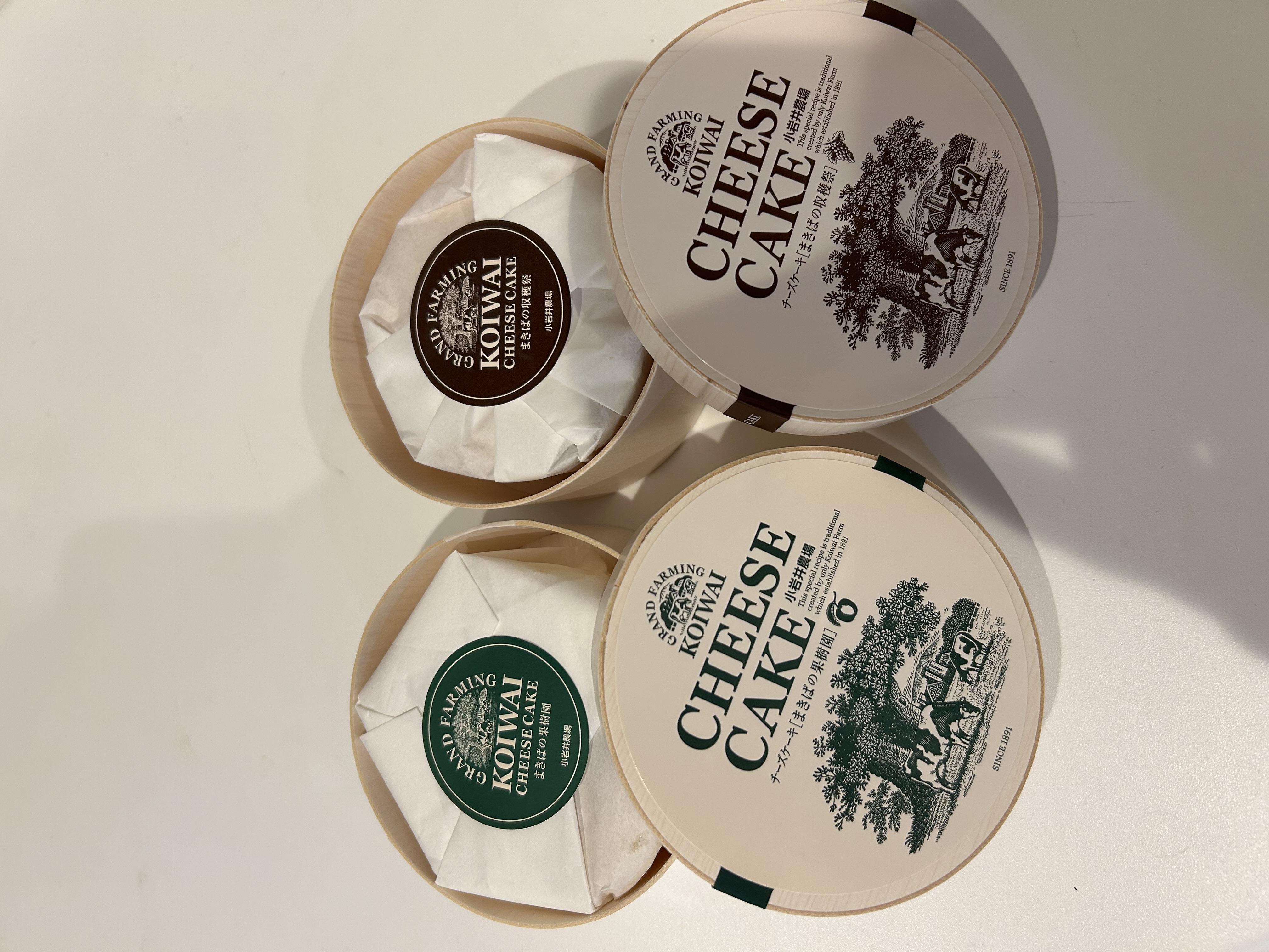 丸い木箱に入っている様が、まるでナチュラルチーズのようで印象的な「まきばの果樹園」と「まきばの収穫祭」を2個ピッタリ収まる専用の化粧箱。