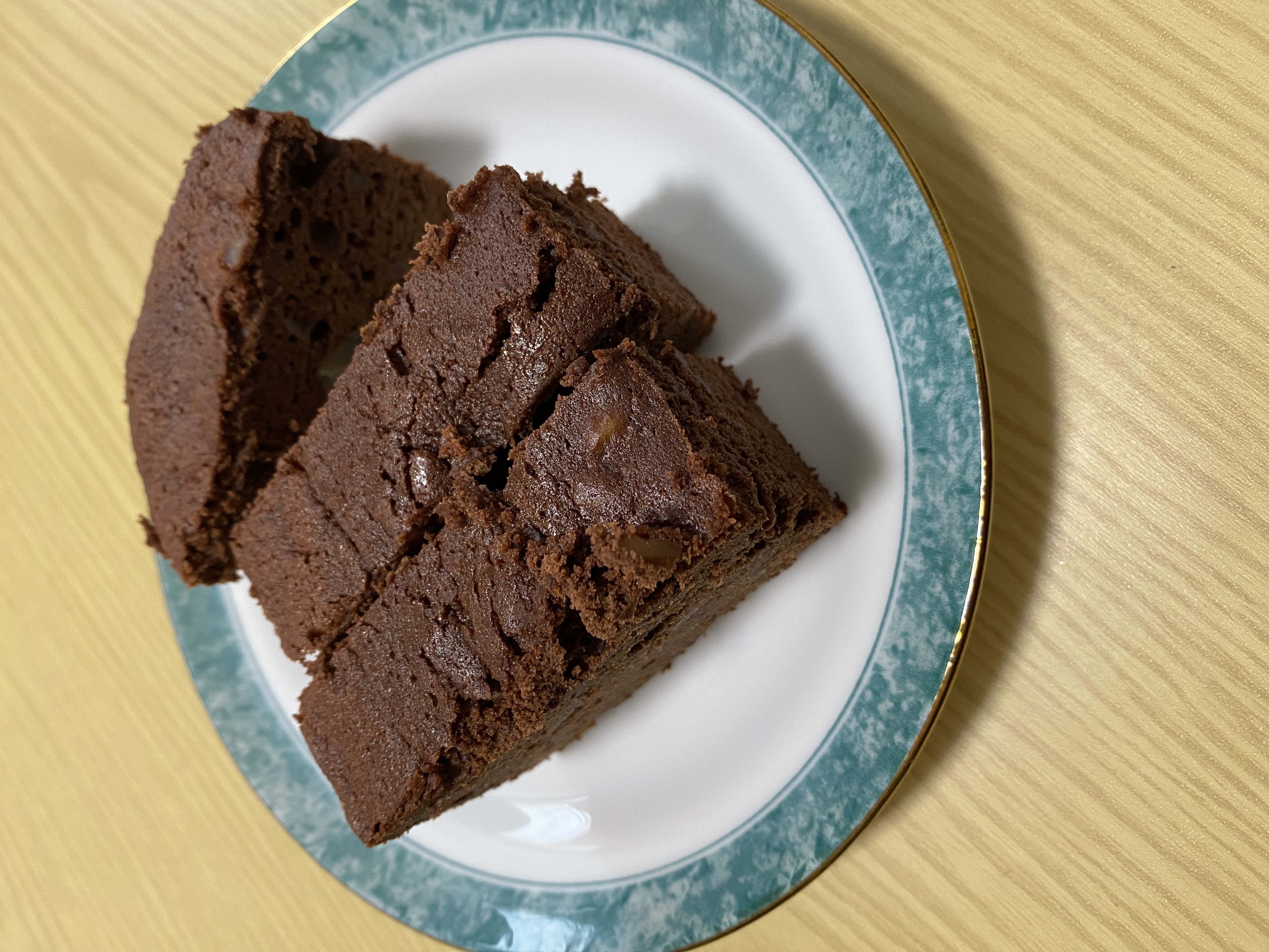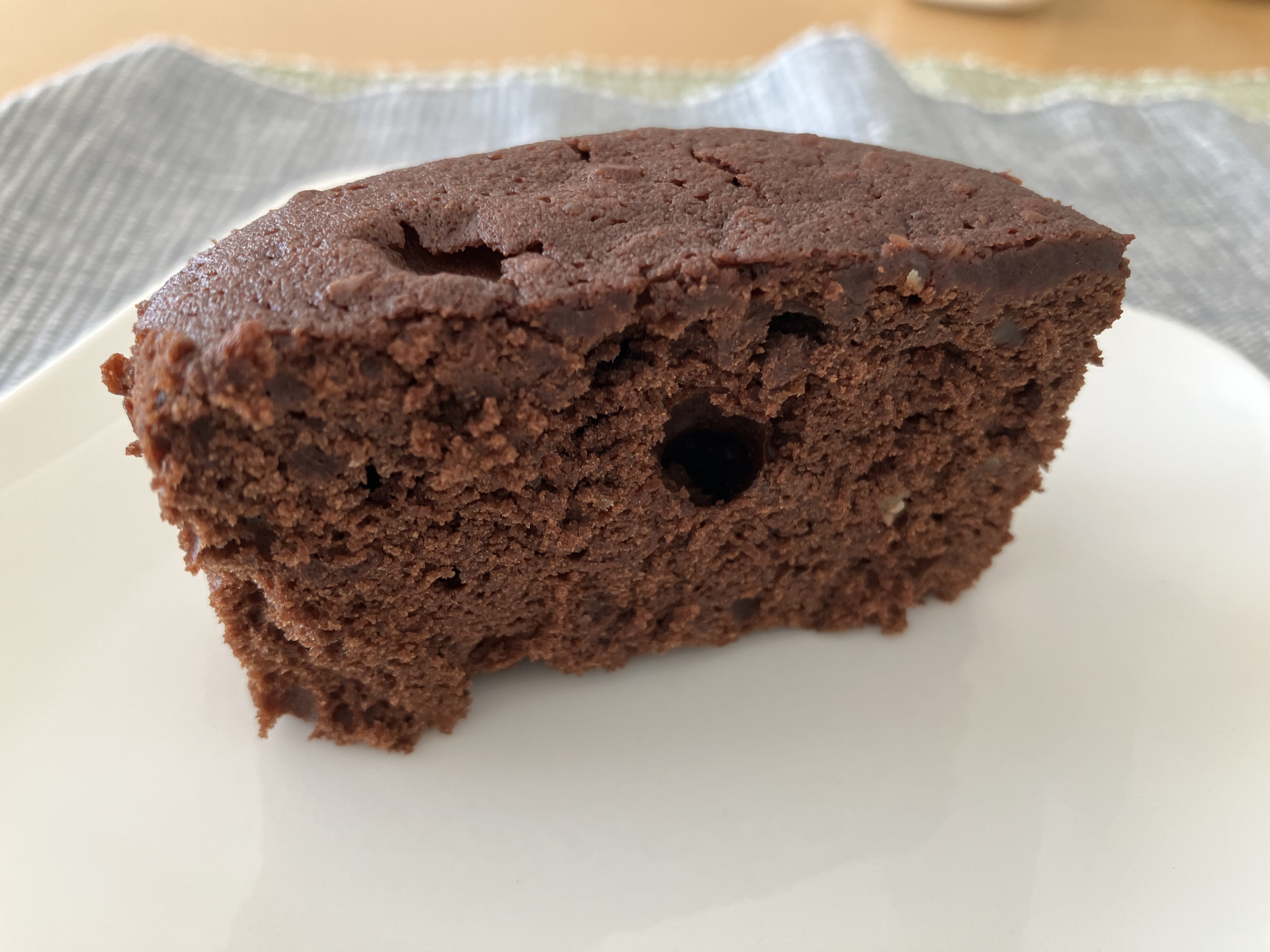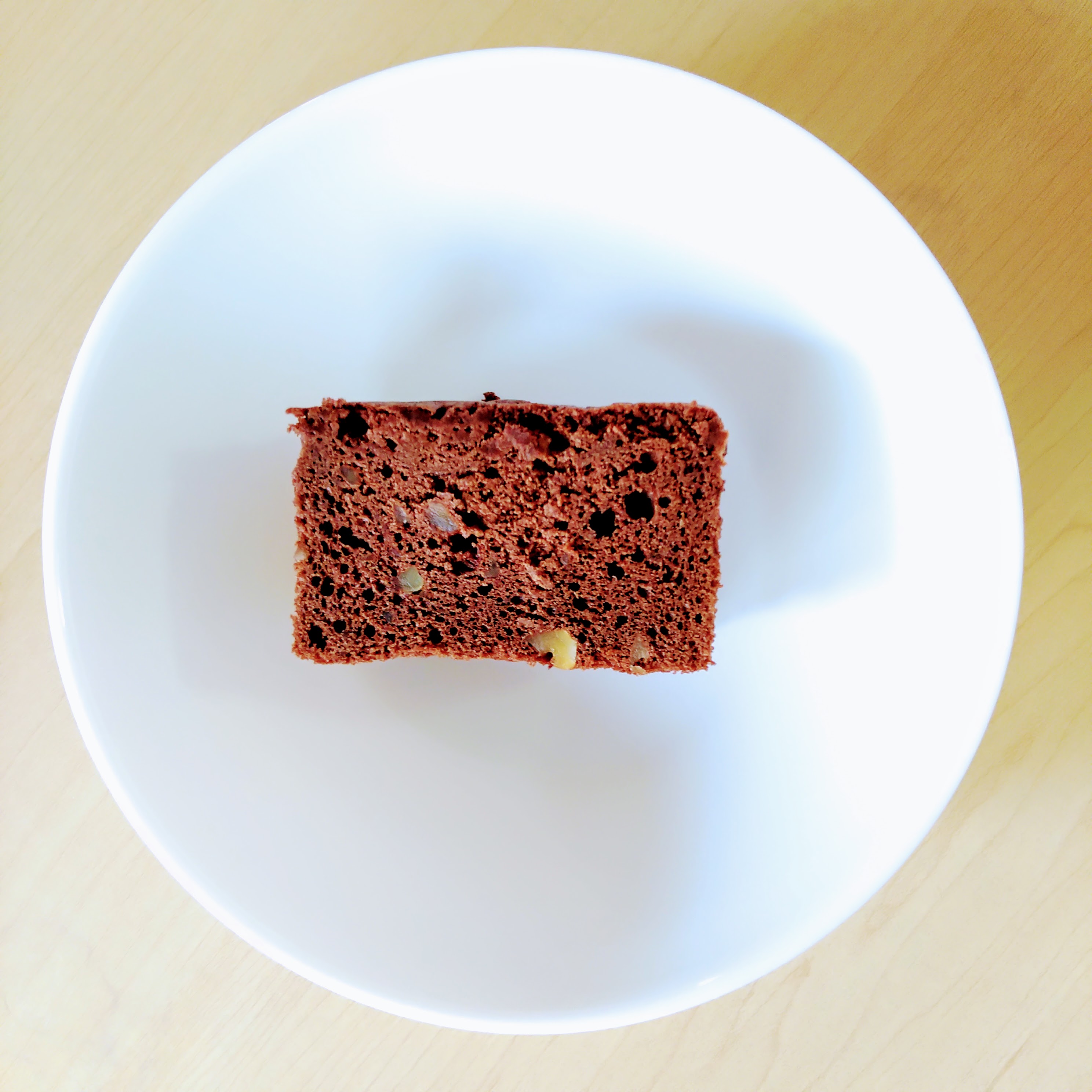 一口目、口の中に入れた瞬間に、開封時以上のチョコレートの香りと、口の中のケーキのほろほろ感、食感のアクセントになるクルミの食感が包んでくれます。甘さは優しく、食感も思ったより軽いので6等分して一切れ食べたのですがもっと食べたくなってしまいました。生クリーム、チョコレート、バターと原料だけ見れば「思いかな?」と感じてしまうのに王道ガトーショコラの魔力は恐ろしいです…。あっさり一切れ完食して、お供のお茶で余韻を味わっていました。