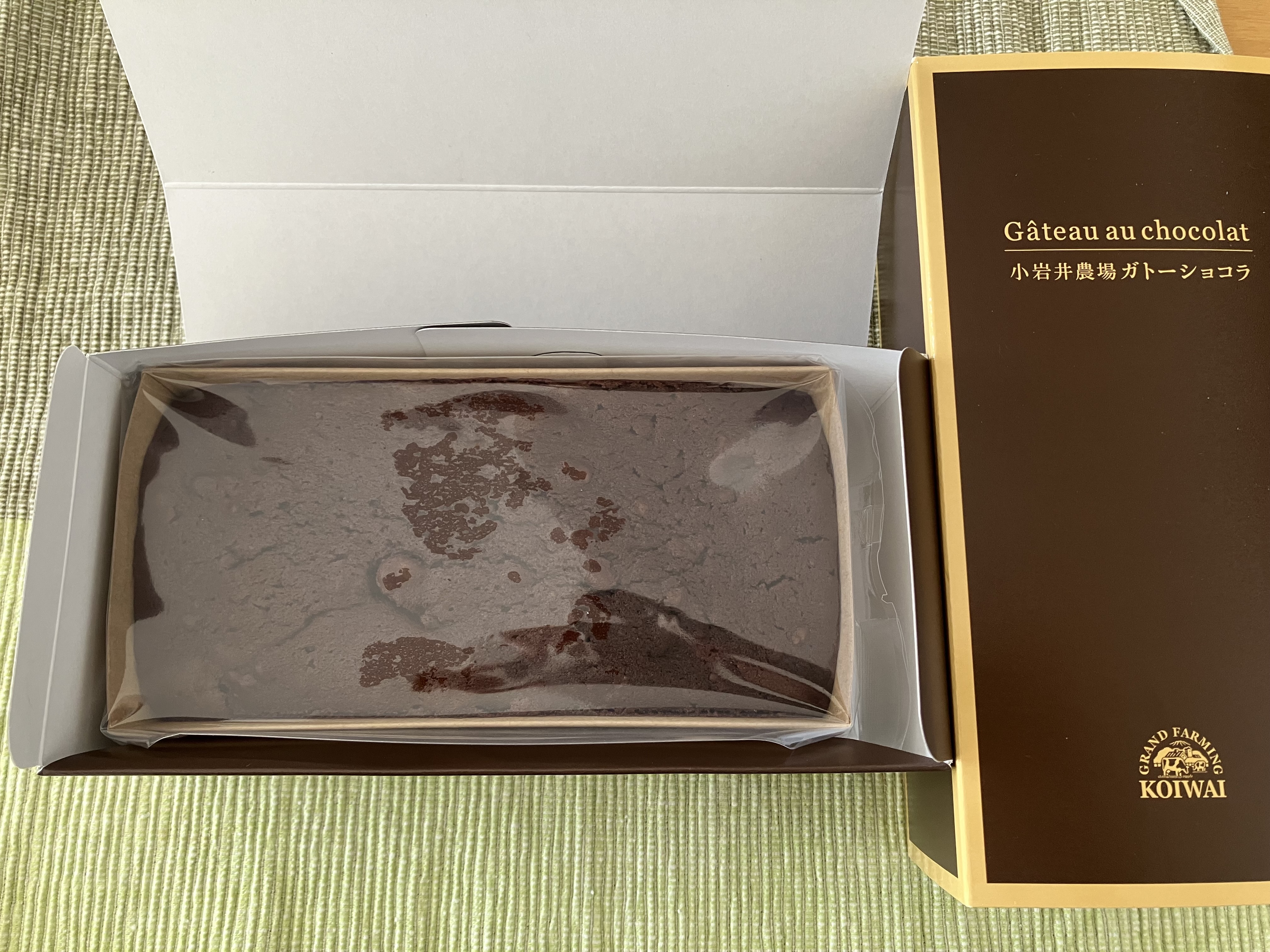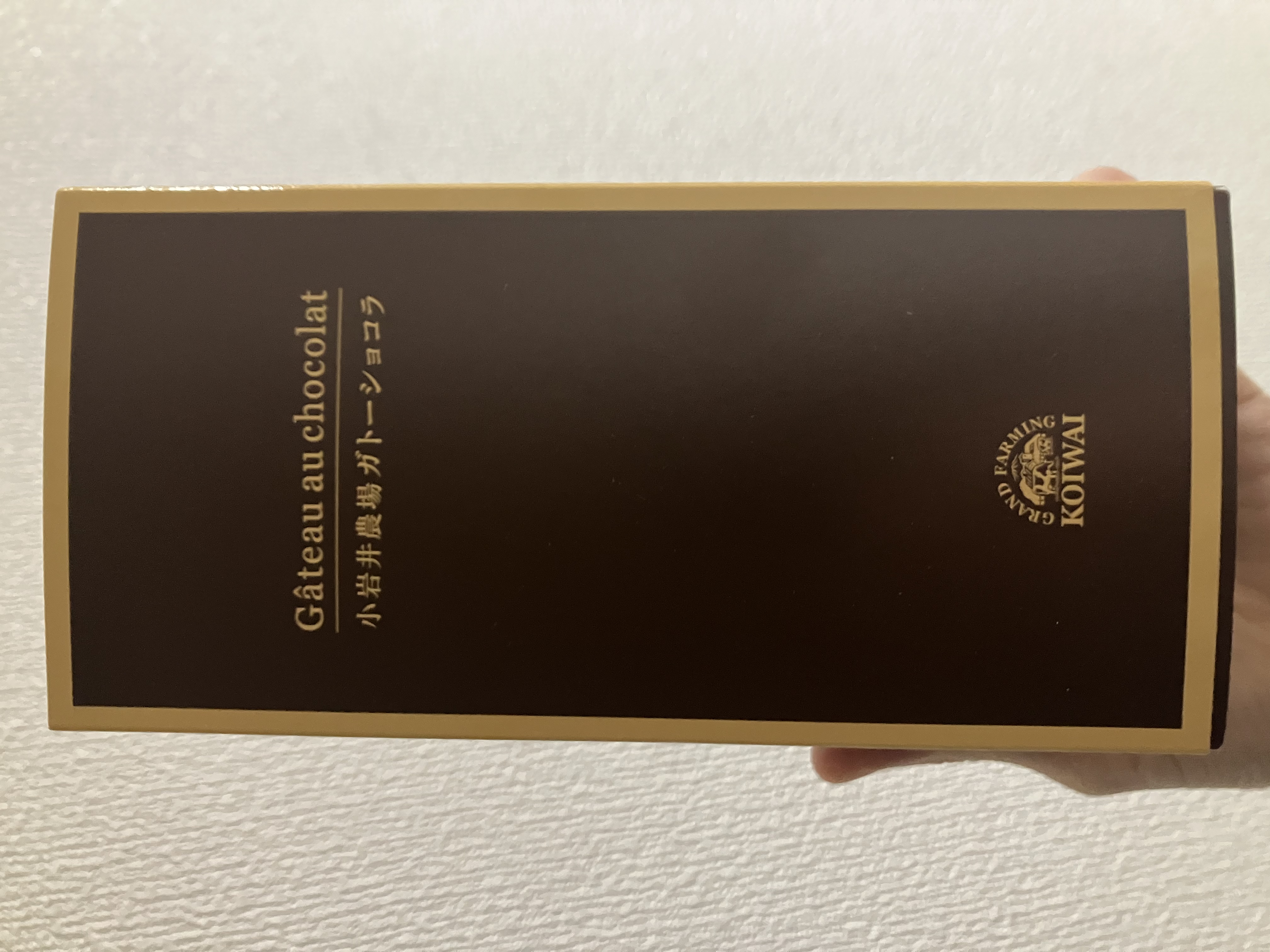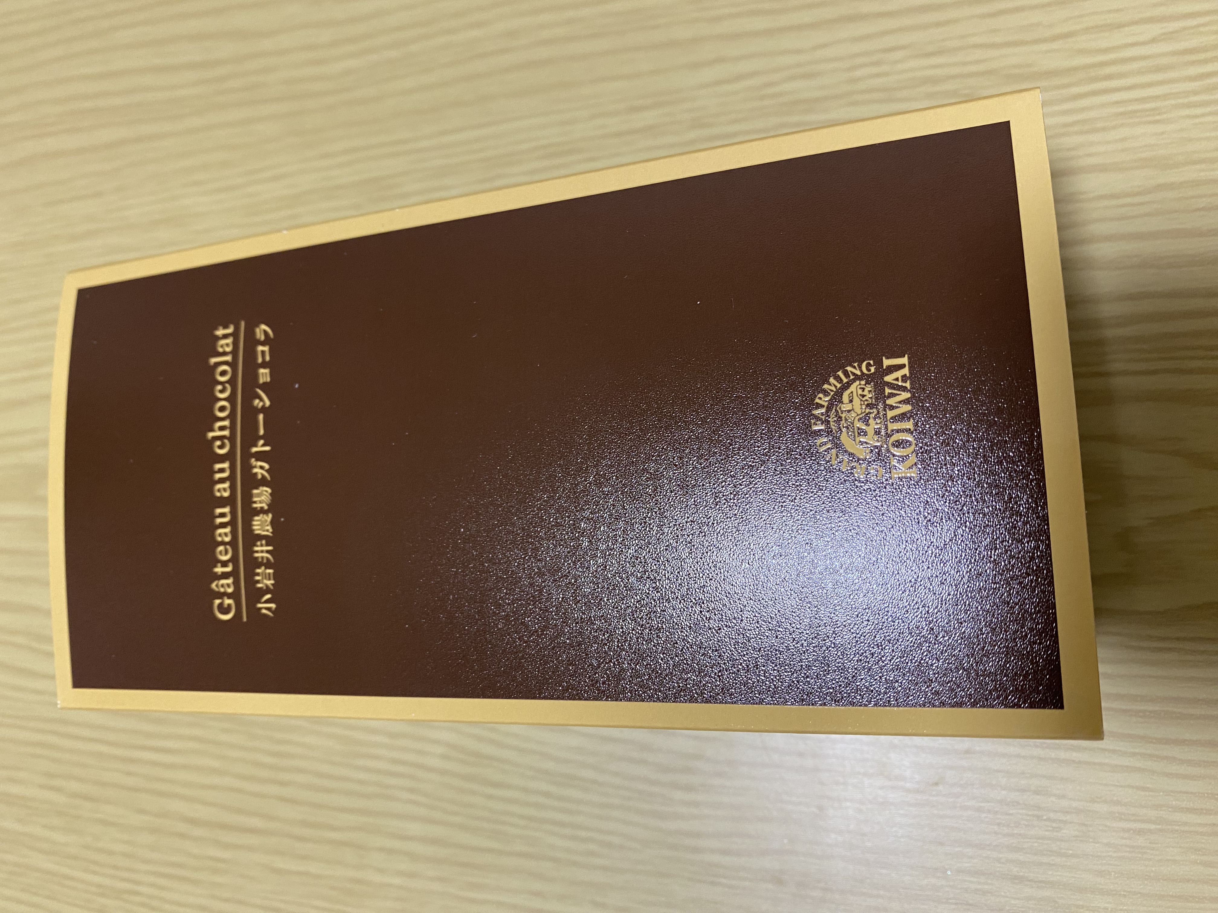 梱包は段ボール箱と梱包材、そして本体の箱。開けるのに全くストレスがありません。ワクワクしてツヤのある本体の箱を眺めることができました。本体の箱はその中のガトーショコラをそのまま箱にしたかのような濃い茶色に金色のラインと文字。これだけでも一目で良いものだと分かるのですから小岩井さんはすごいと思います。箱の裏には原材料表示がありますがこれもシンプルで、なんと12種類、ガトーショコラを作るのに必要な材料だけです。それでも1ヶ月以上日持ちするのですから手土産にもぴったりです。