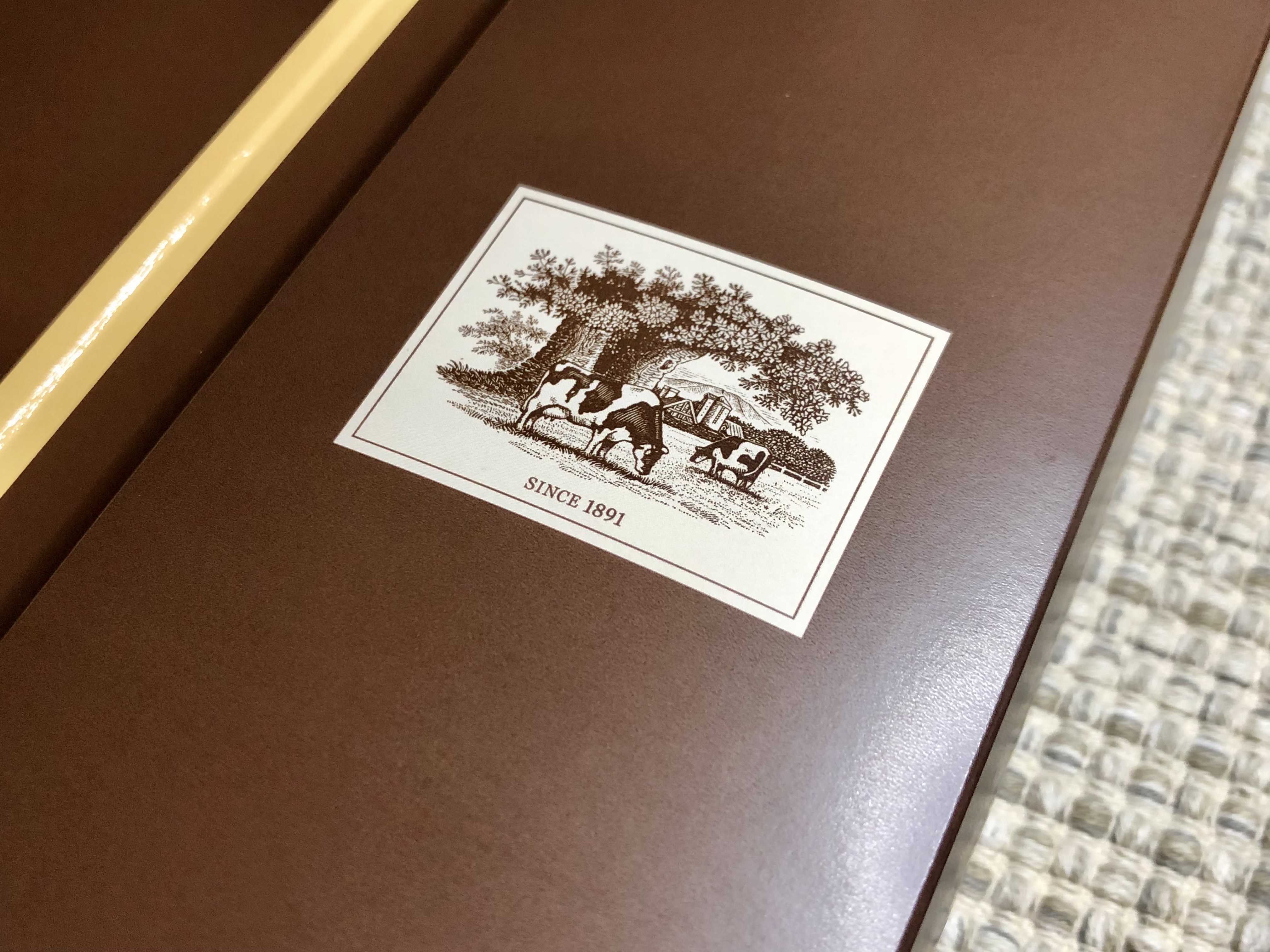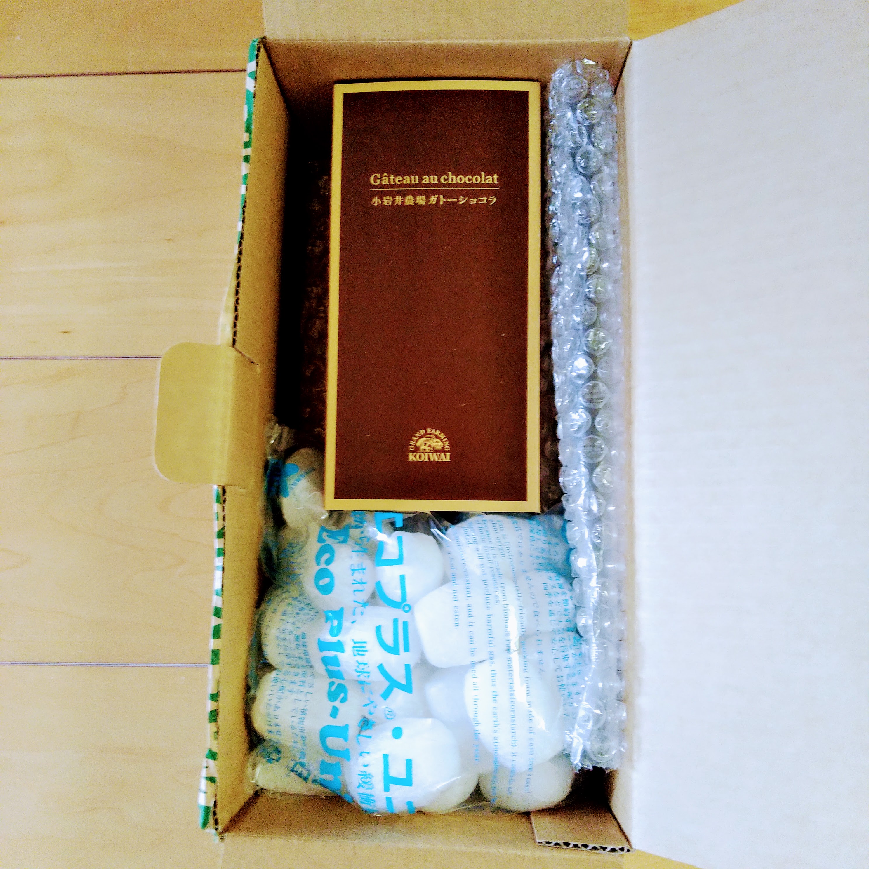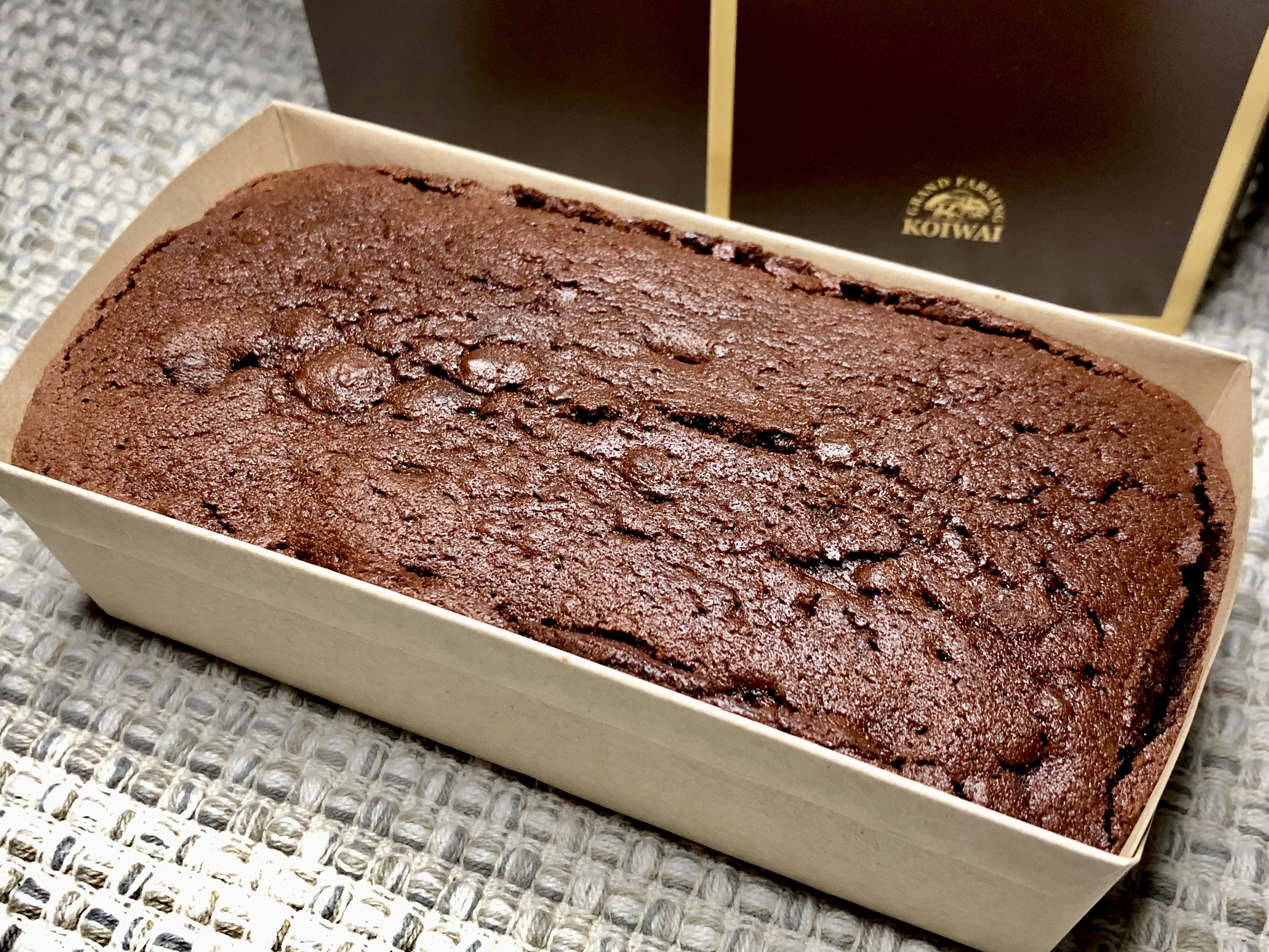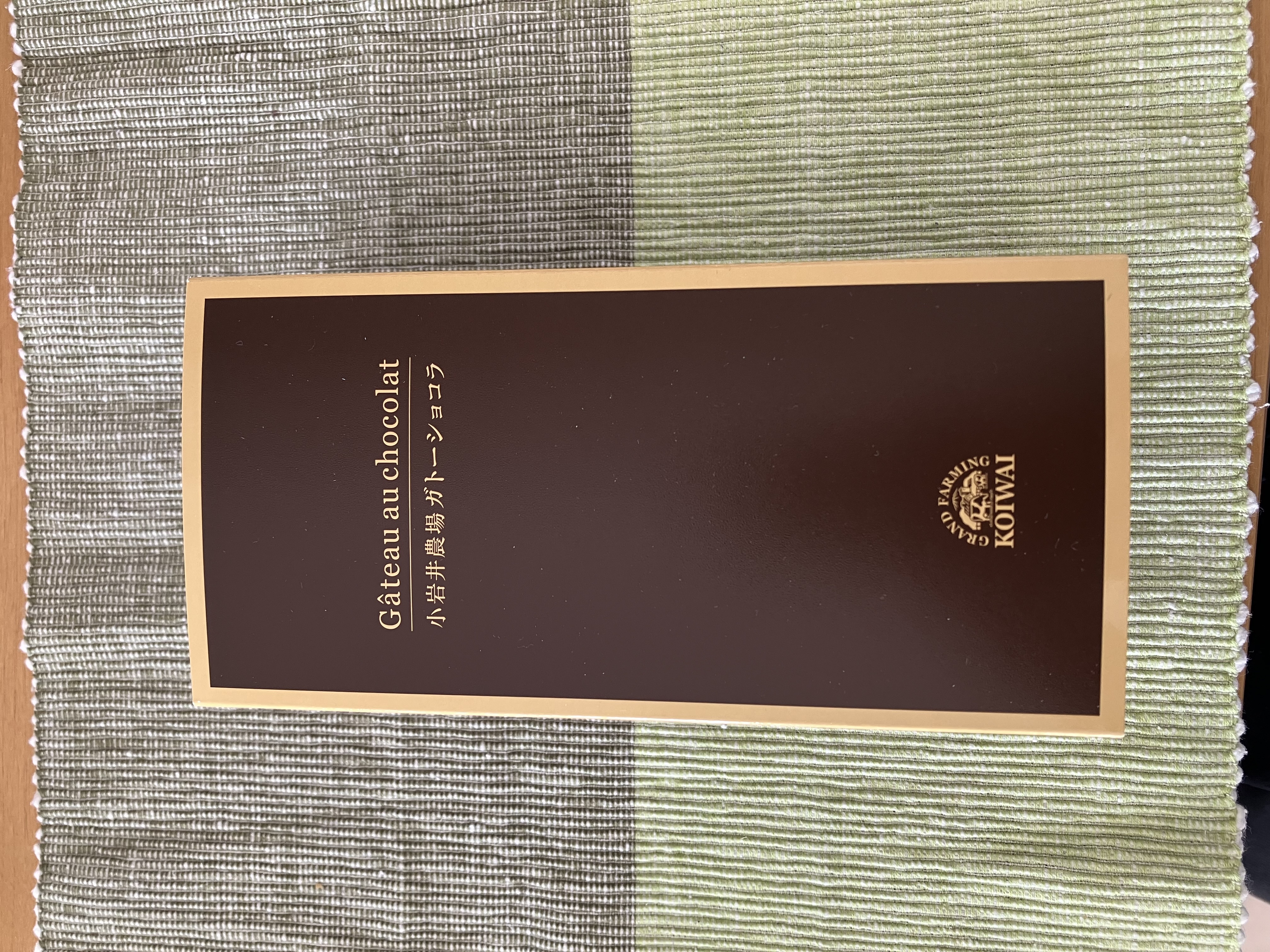梱包は段ボール箱と梱包材、そして本体の箱。開けるのに全くストレスがありません。ワクワクしてツヤのある本体の箱を眺めることができました。本体の箱はその中のガトーショコラをそのまま箱にしたかのような濃い茶色に金色のラインと文字。これだけでも一目で良いものだと分かるのですから小岩井さんはすごいと思います。箱の裏には原材料表示がありますがこれもシンプルで、なんと12種類、ガトーショコラを作るのに必要な材料だけです。それでも1ヶ月以上日持ちするのですから手土産にもぴったりです。