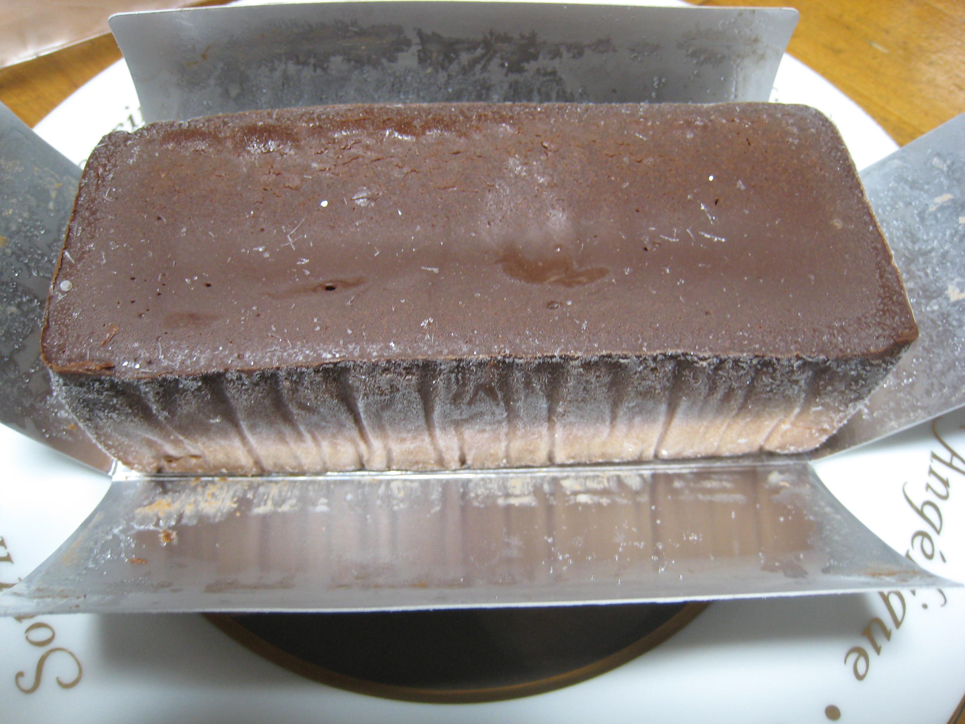 ずっしりと重いテリーヌショコラが鎮座。密封された厚手の透明な袋入り。周囲・底にも厚紙があり切りやすい。