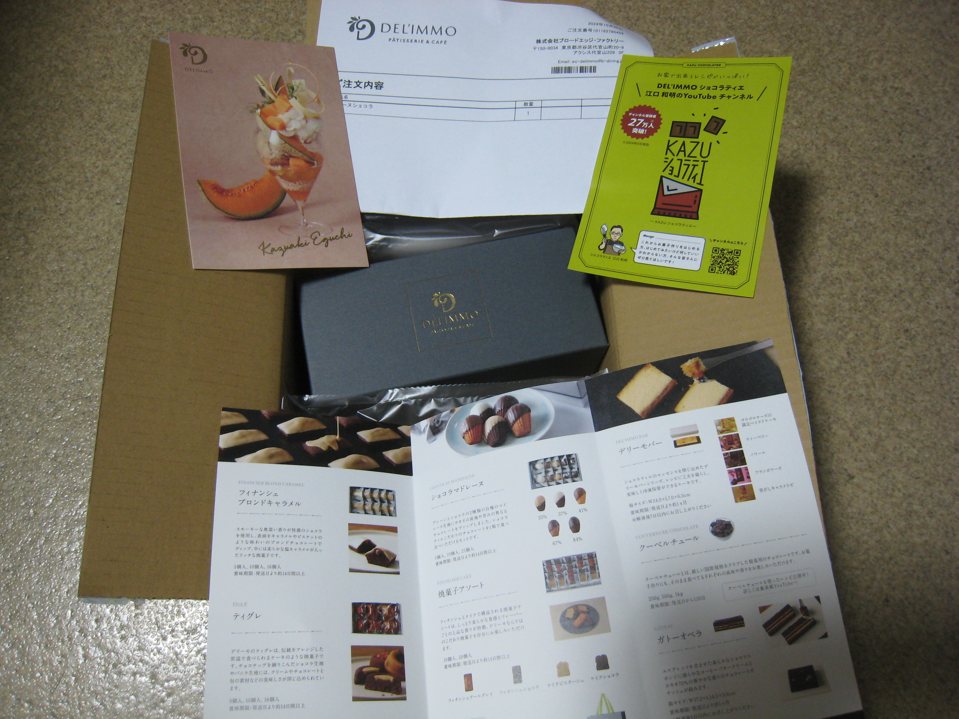 「クール便・冷凍」にて無事に受け取りました。白いダンボール、濃いグレーのボックスに金のロゴが洗練されています。中は意外な黄緑色が目を引き、男性にも贈りやすい渋さと素敵な色の組合わせ。