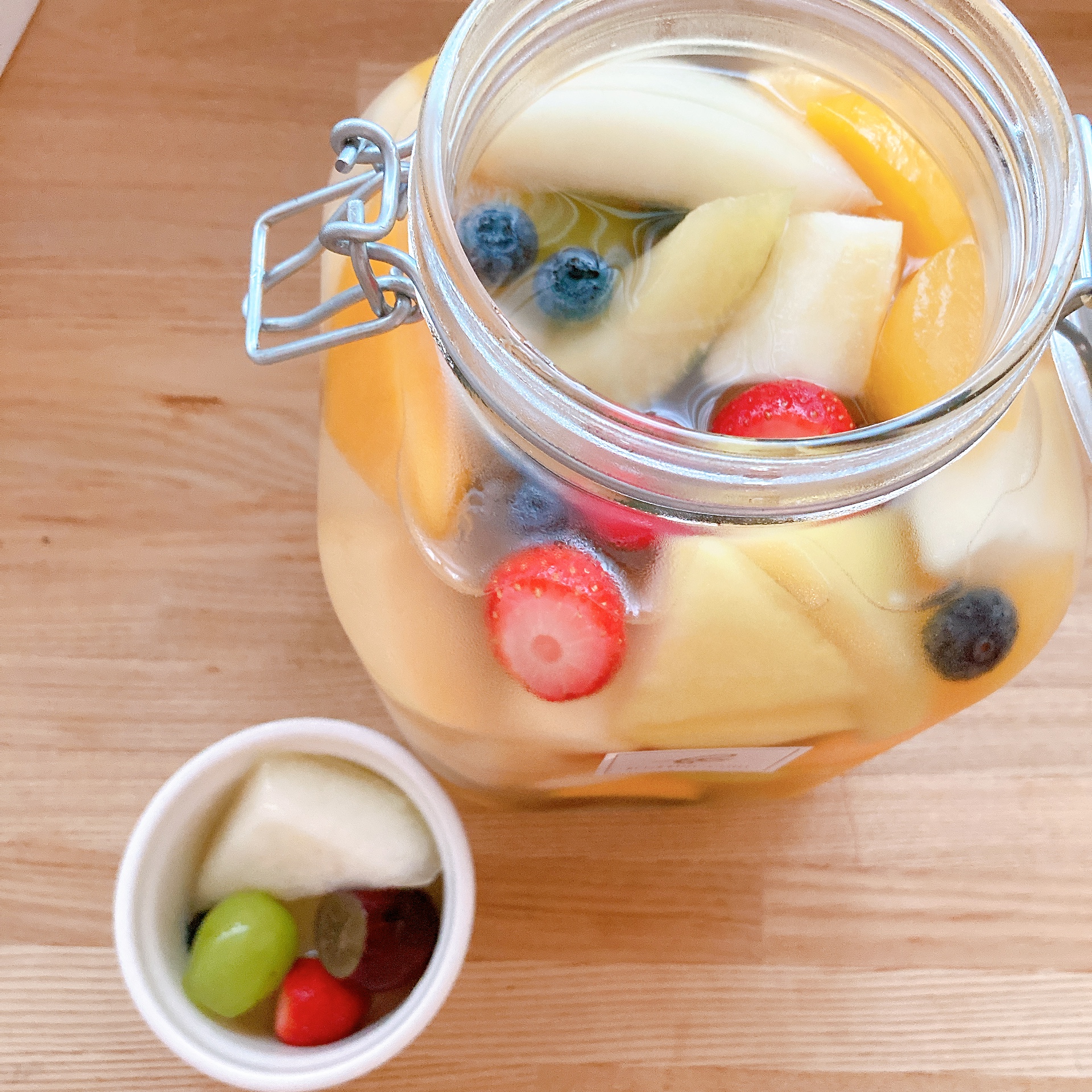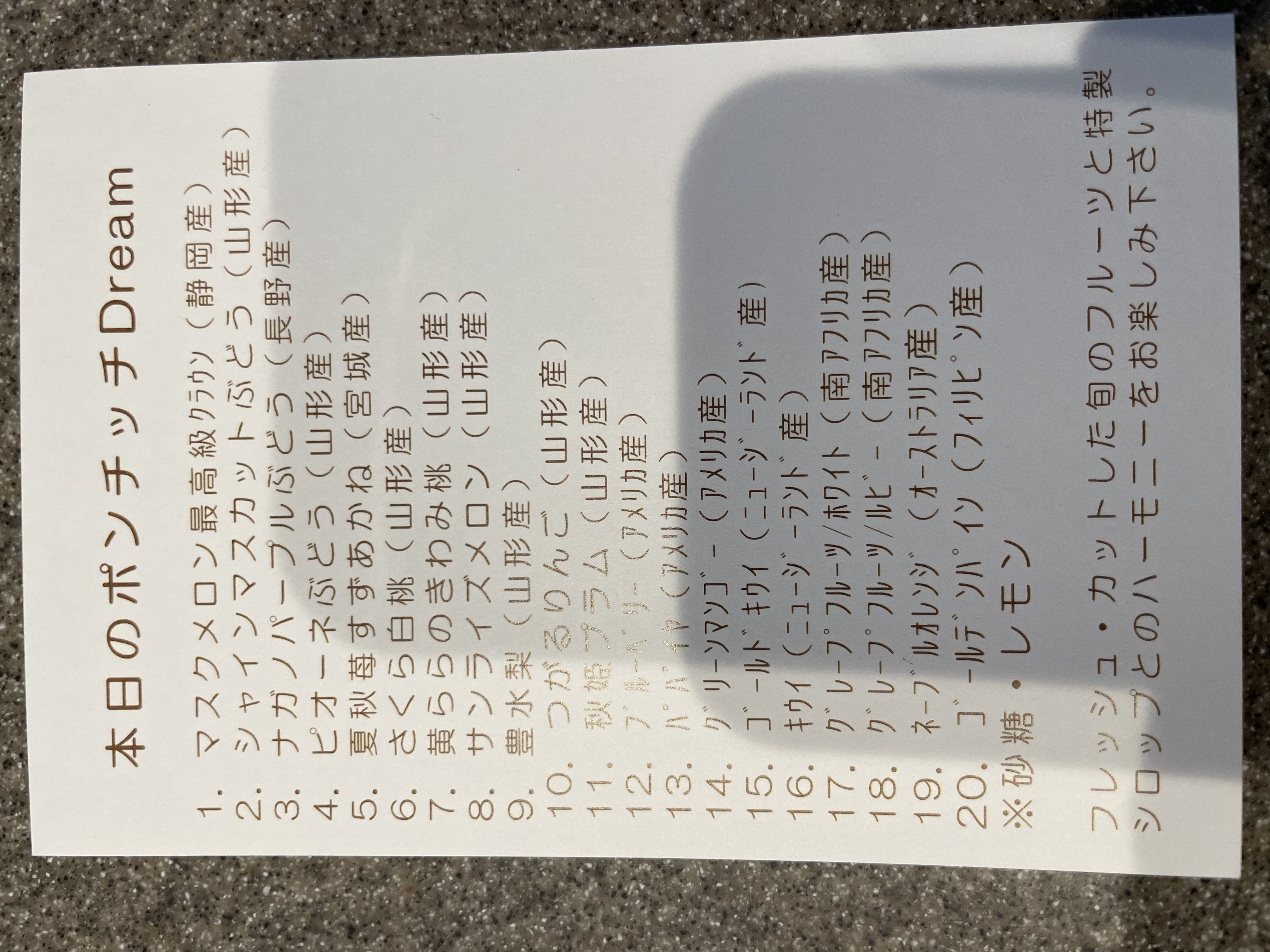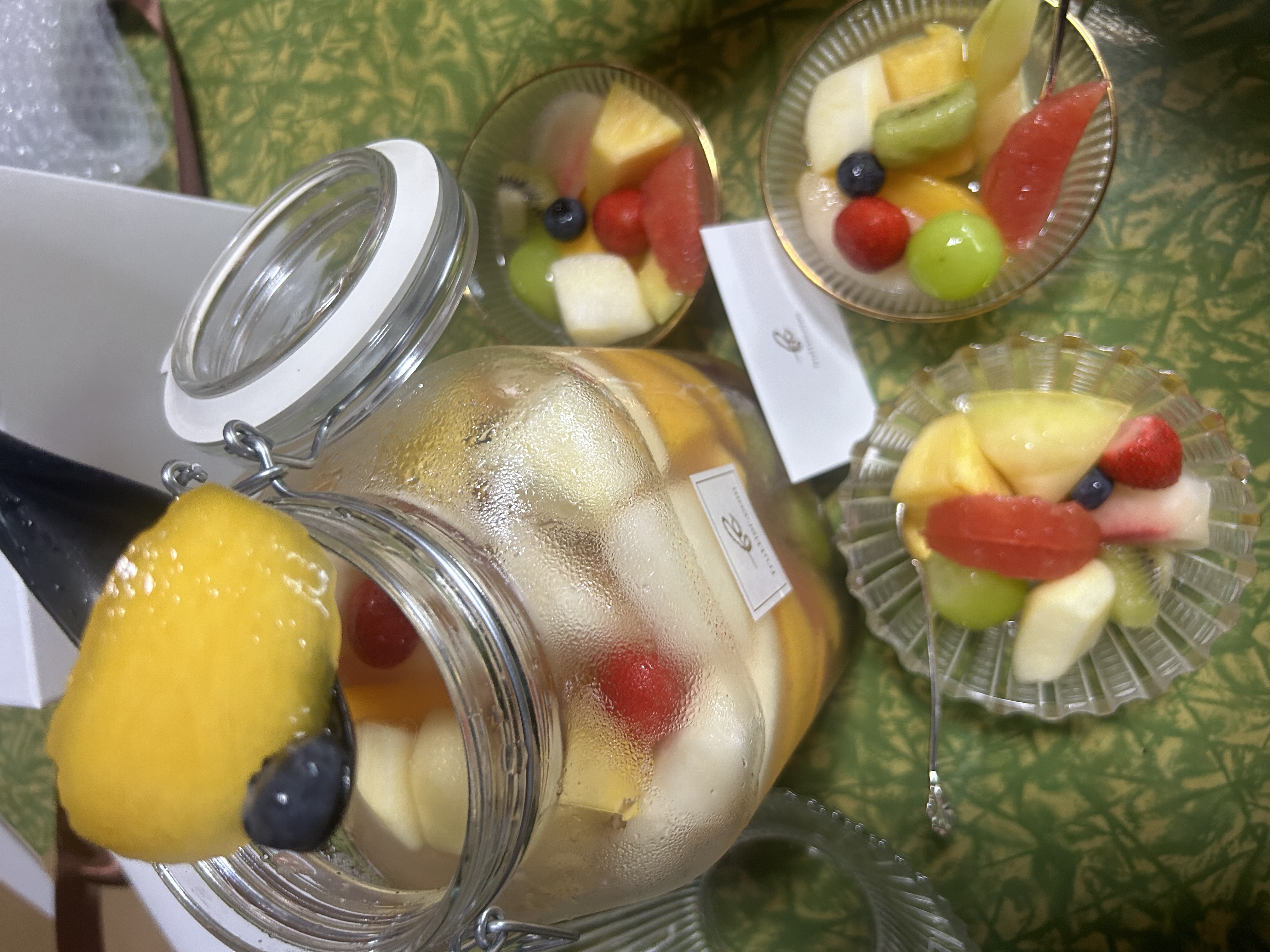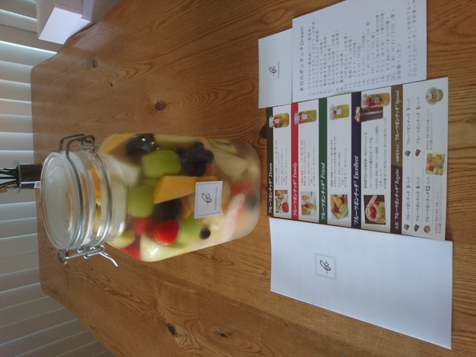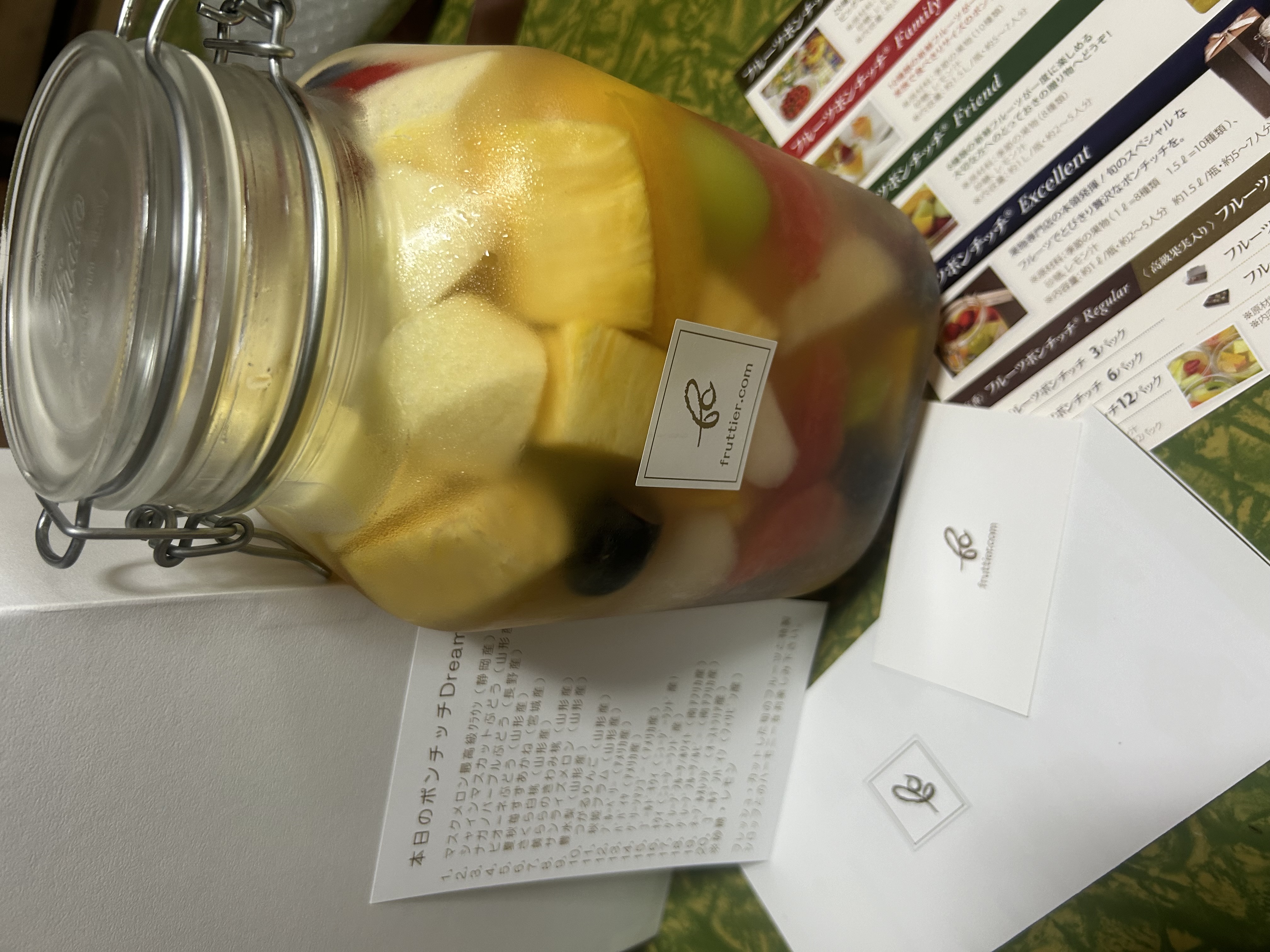 これは何だろう?これは?みんなでワイワイとクイズのように楽しみながら、本日のポンチッチDreamカードが同封されているので 確かめながら取り分けしました 主役級20種類のフルーツたちがひとつに集まって Dream瓶に夢のコラボです 取り分けると更に個々のフルーツの香りを感じることができ、色を楽しみながら、一つ一つ新鮮なフルーツを味わうことができます 一つのフルーツを口にする度に感動の嵐です みんなの幸せな顔をみて更に美味しさを増してくれます 多種のフルーツと優しいシロップがお口の中も心も更に満たしてくれます