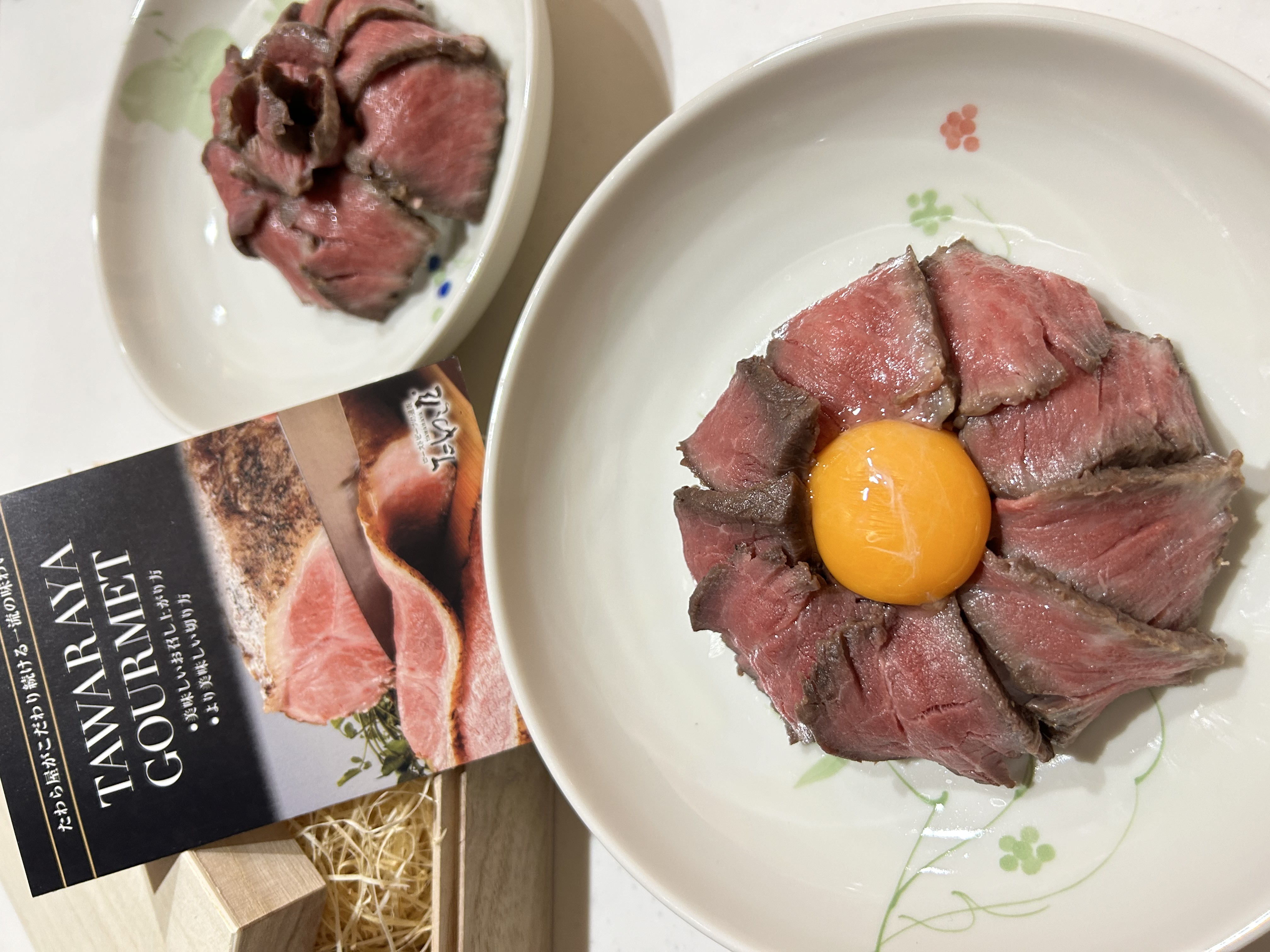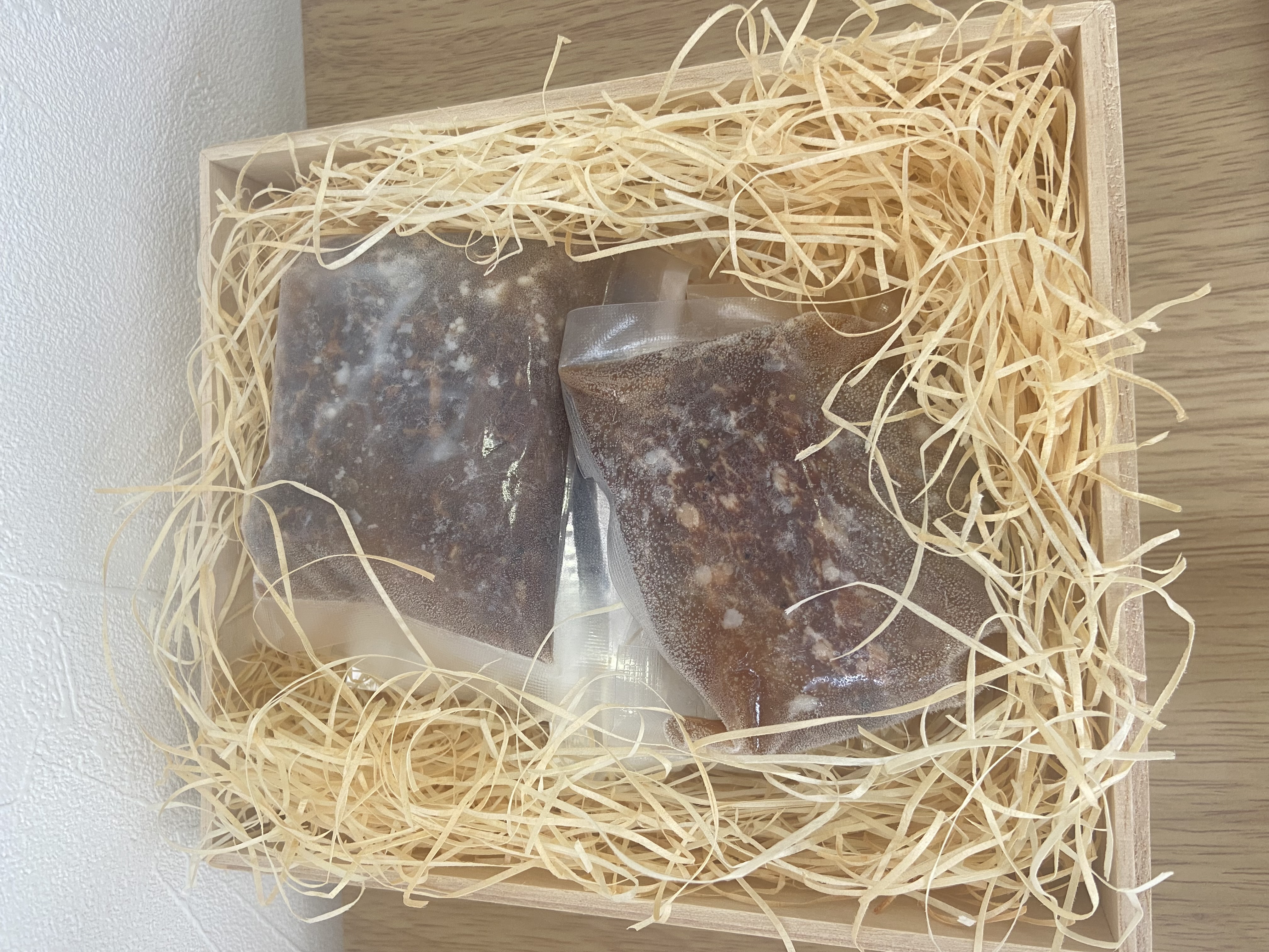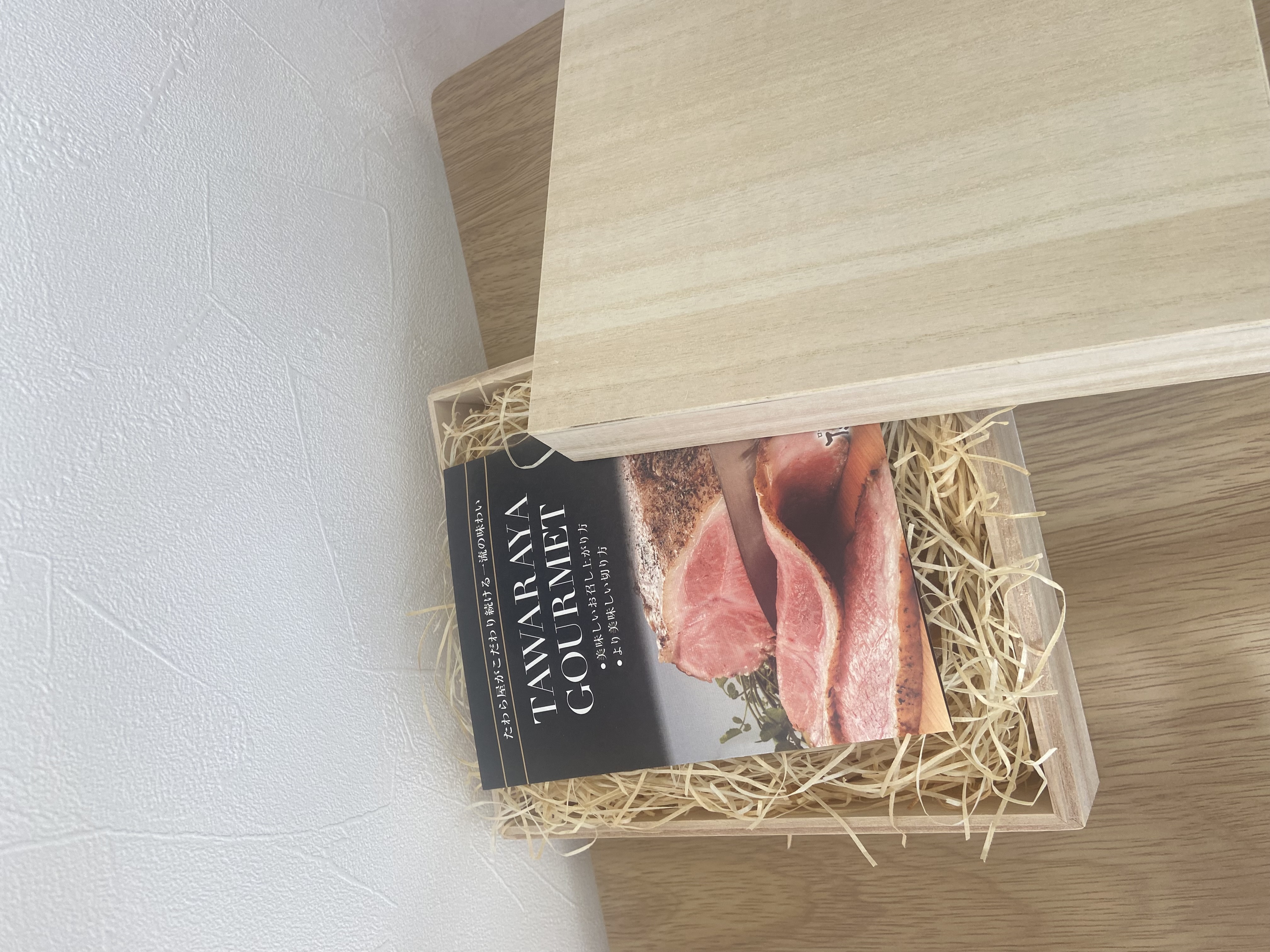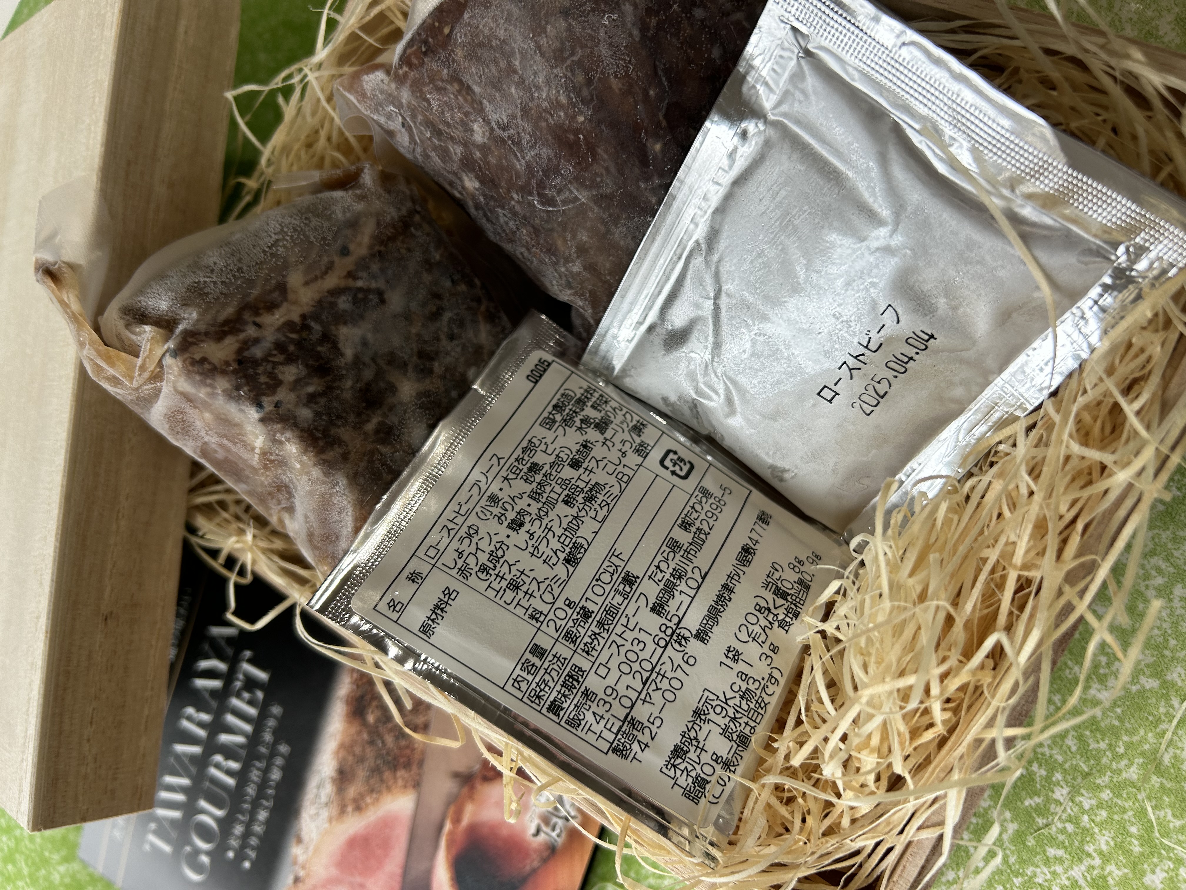 上品な木箱に、真空パックされたローストビーフとタレが2個ずつ入っており、同封されたリーフレットに食べ方や解凍方法の記載があり、分かりやすかったです