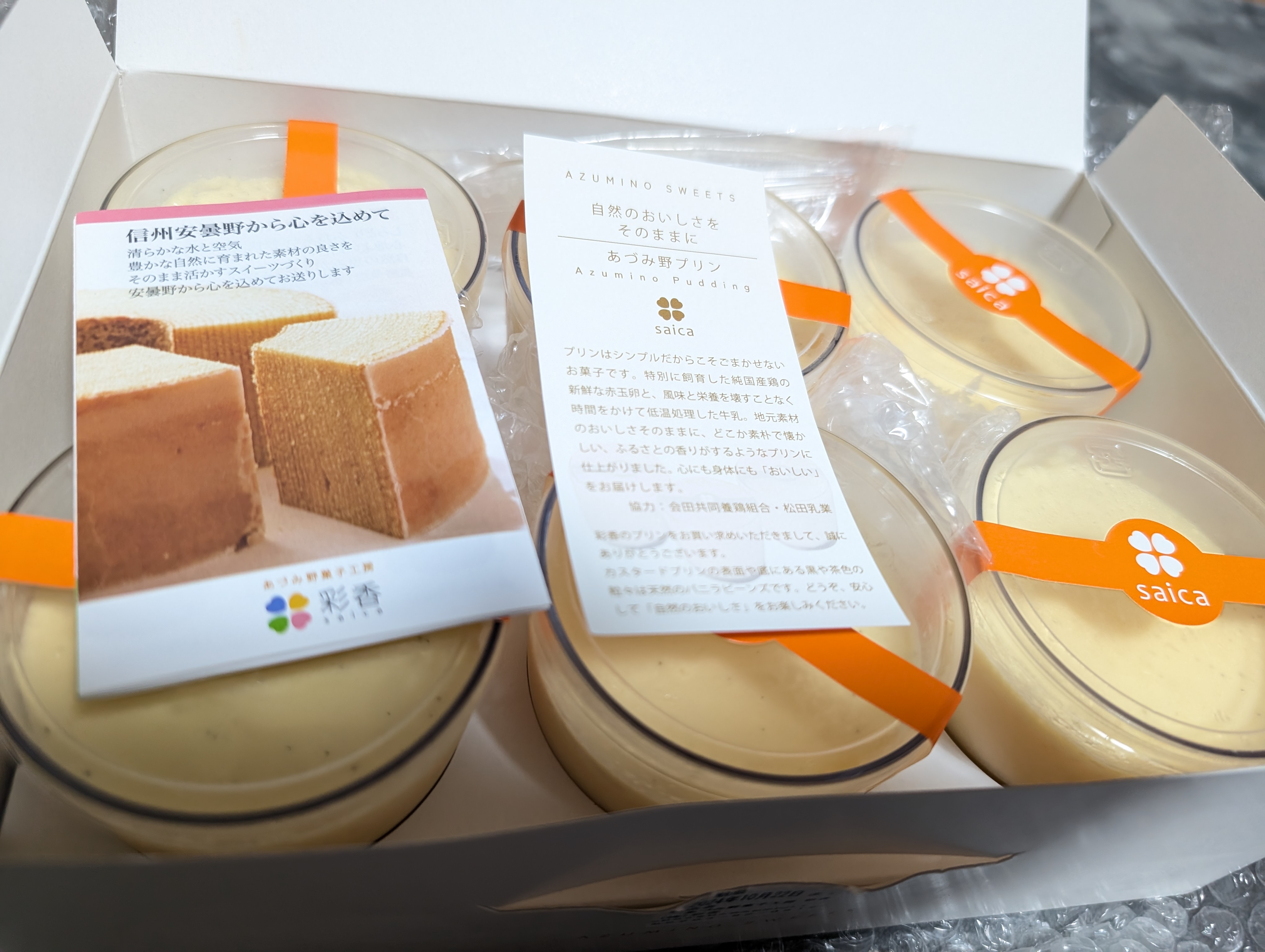 信州の自然豊かな環境で作られた「プリン」です。地元の食材をメインにパティシエが厳選した、低温殺菌松田牛乳、ごとうもみじの赤玉卵、バニラ、砂糖、生クリーム、5つの素材だけで一つ一つ丁寧に作っています。濃厚でありながらなめらかな食感が特長です。オレンジが印象的な専用ボックスに入って届きます。