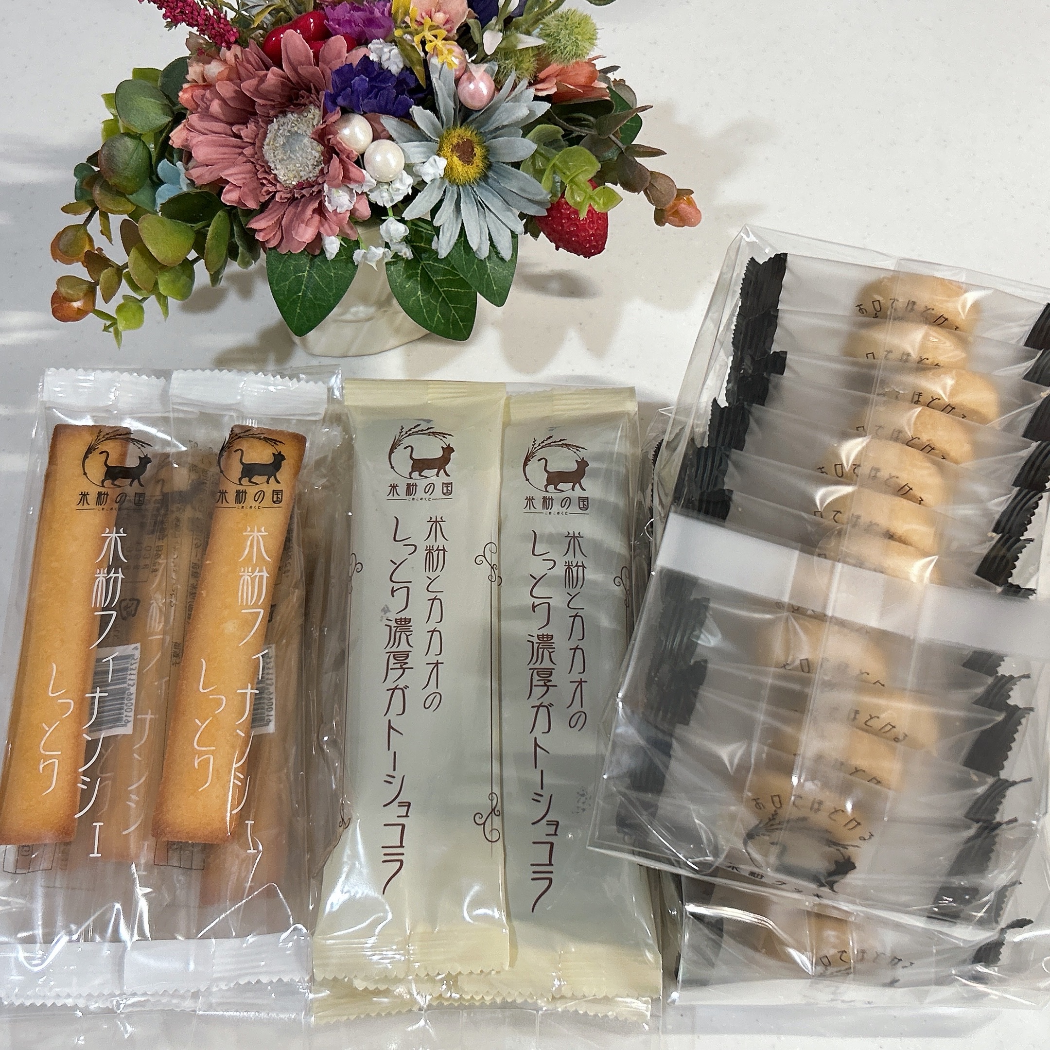 100%国産米粉を使用した「グルテンフリー焼き菓子」セットです。国産卵に北海道産バターを使った「フィナンシェ」は、14ヶ月かけて開発されたもの。シンプルな味わいで、食べやすいスティックタイプです。「大人向けのグルテンフリー商品が欲しい」という声から誕生した「ガトーショコラ」は、ちょっとビターで上品な大人な味わいです。「クッキー」は、甘すぎない素朴な味わいと口の中でほどける食感を実現するために2年かけて開発されています。米粉のスイーツを初めて試してみたいという人におすすめです。