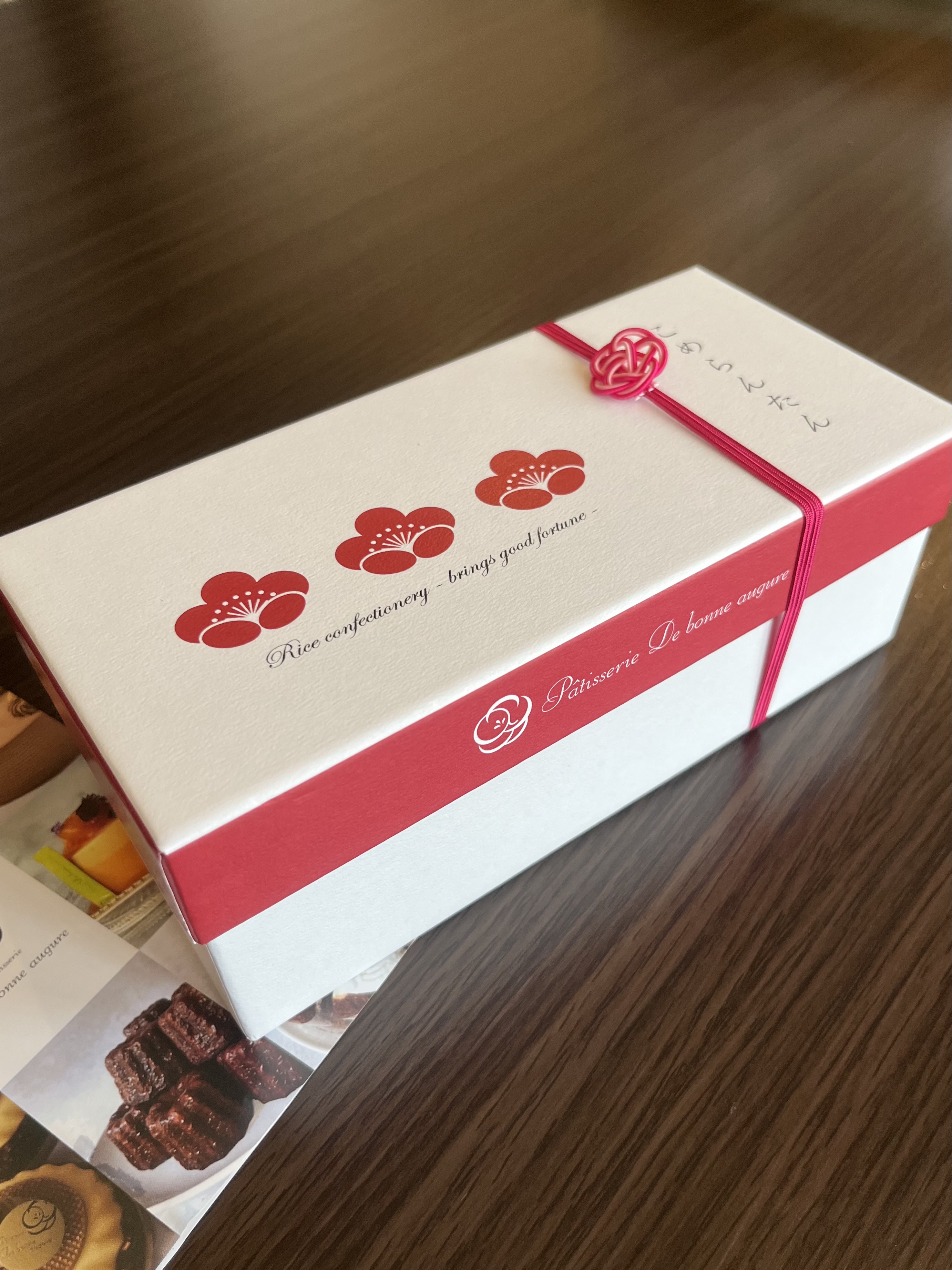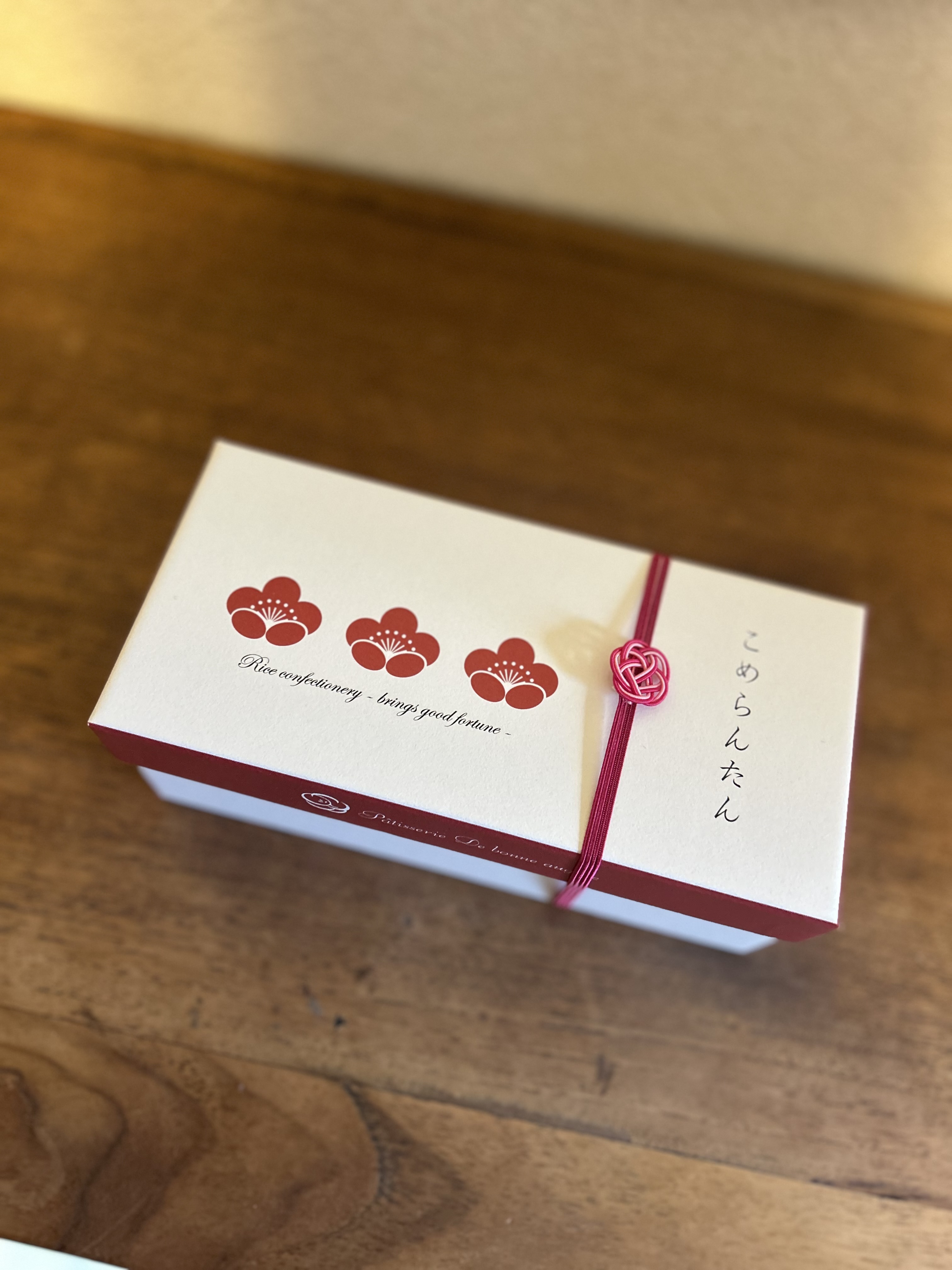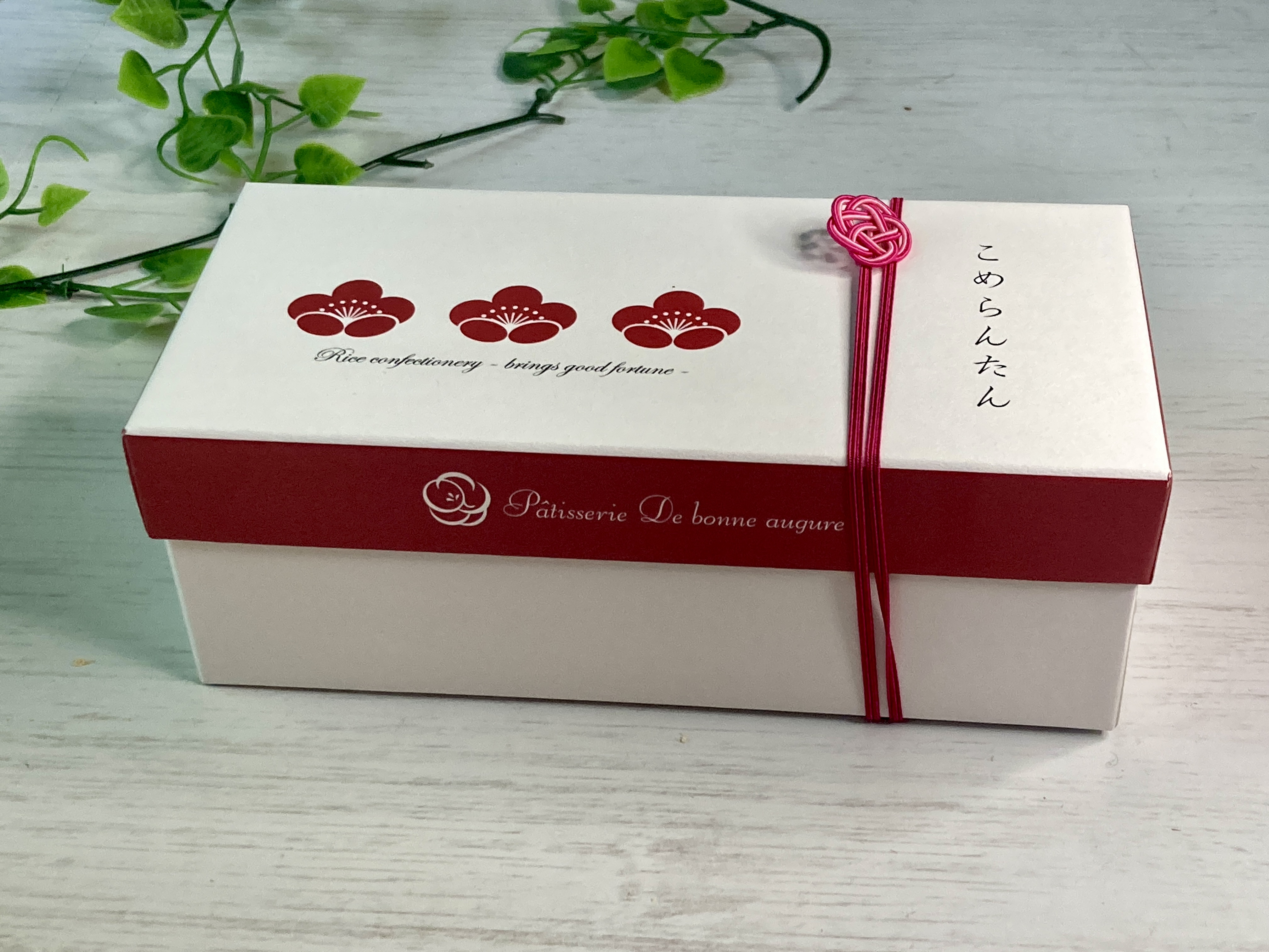 オリジナルのギフトボックスも可愛い梅のデザインで、お土産やギフトにもぴったりの菓子折りです。