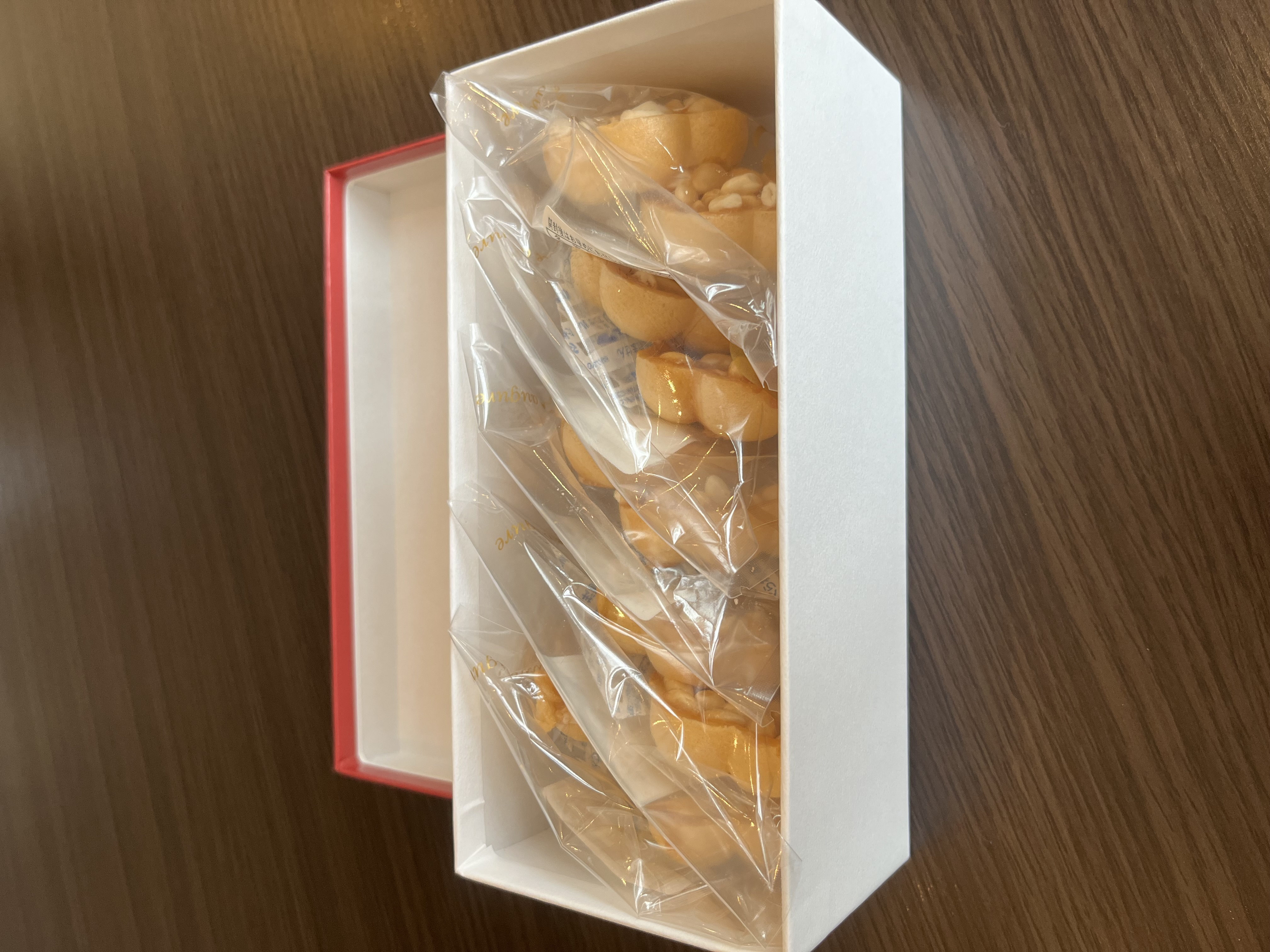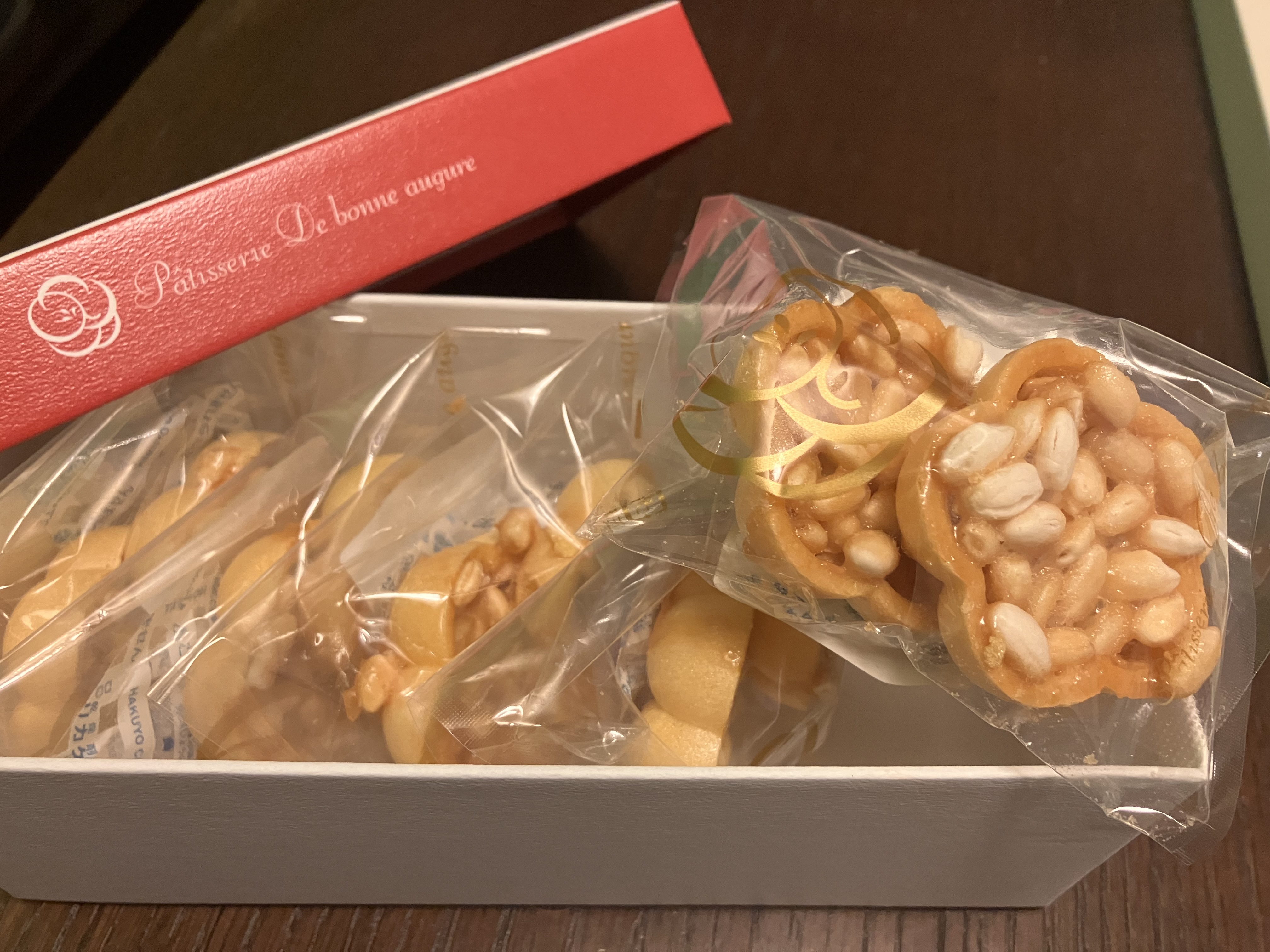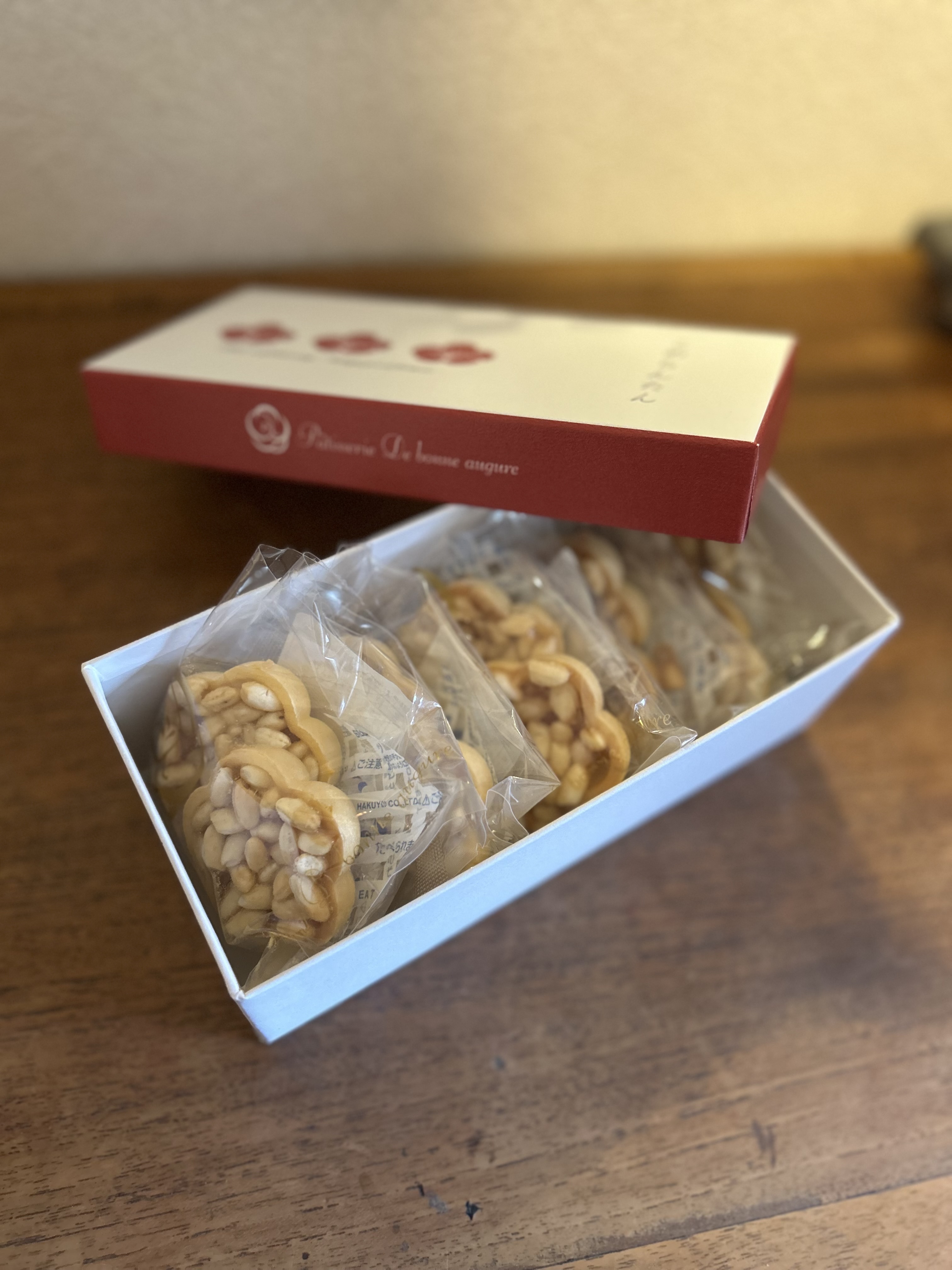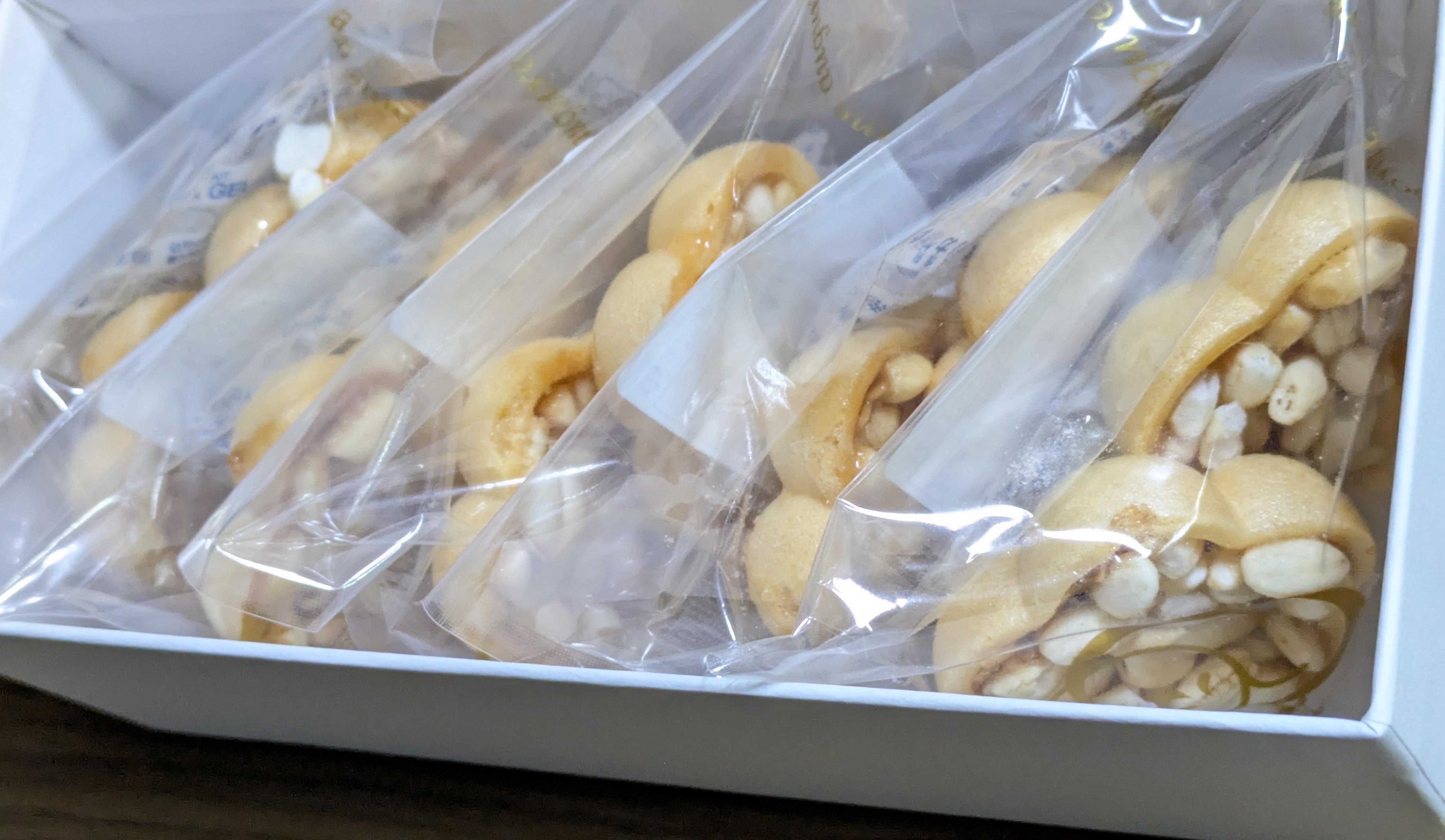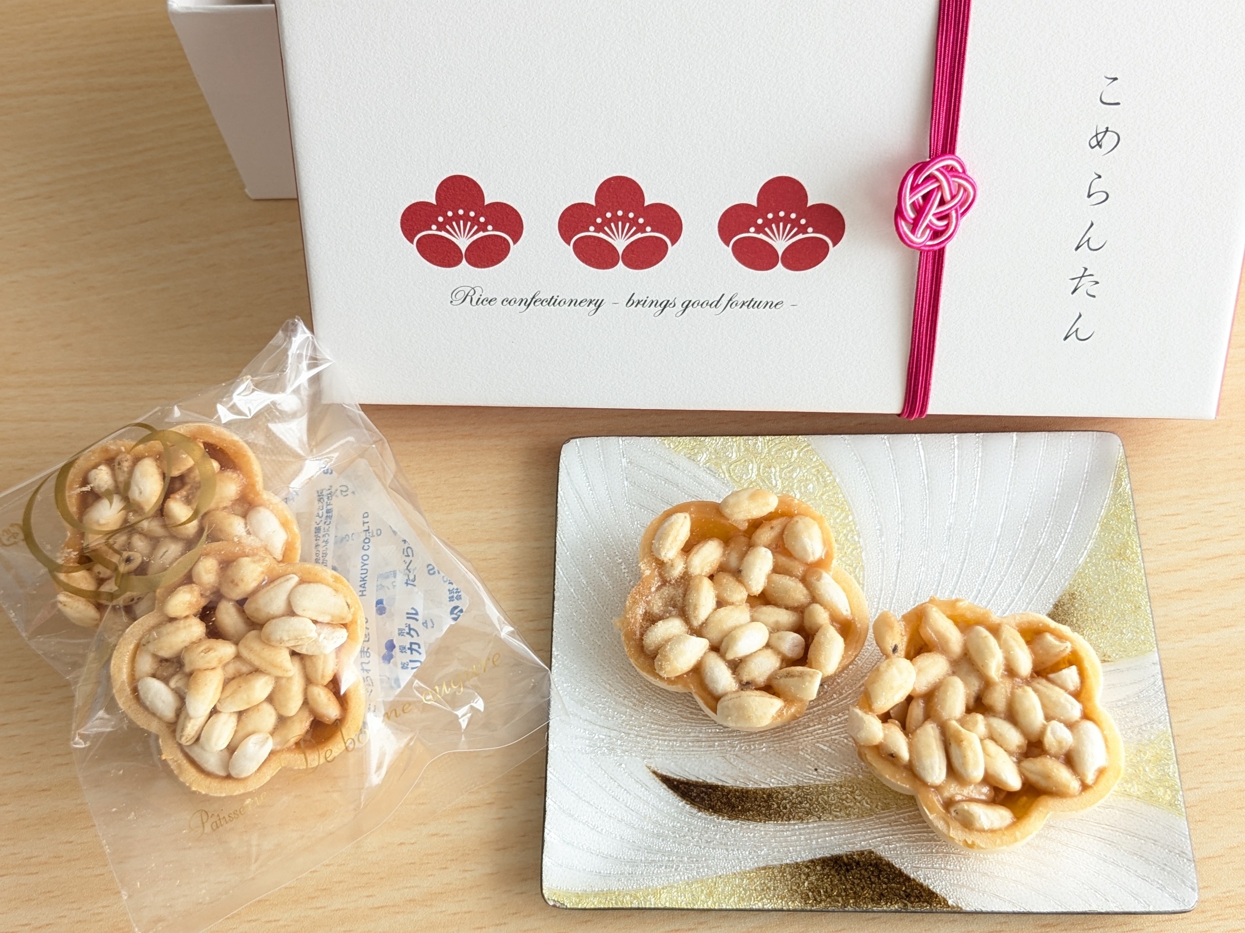 もち米から作るもなかの皮の中に、フロランタンベースのキャラメルとアーモンド、さらに米ハゼを入れたオリジナルの和スイーツです。フロランタンにもなかの皮と米ハゼが加わることで、お米の上品な香りと味わいが楽しめます。縁起物として知られるお米を使った商品なので、手土産や内祝い、結婚式の引き菓子としてもおすすめです。