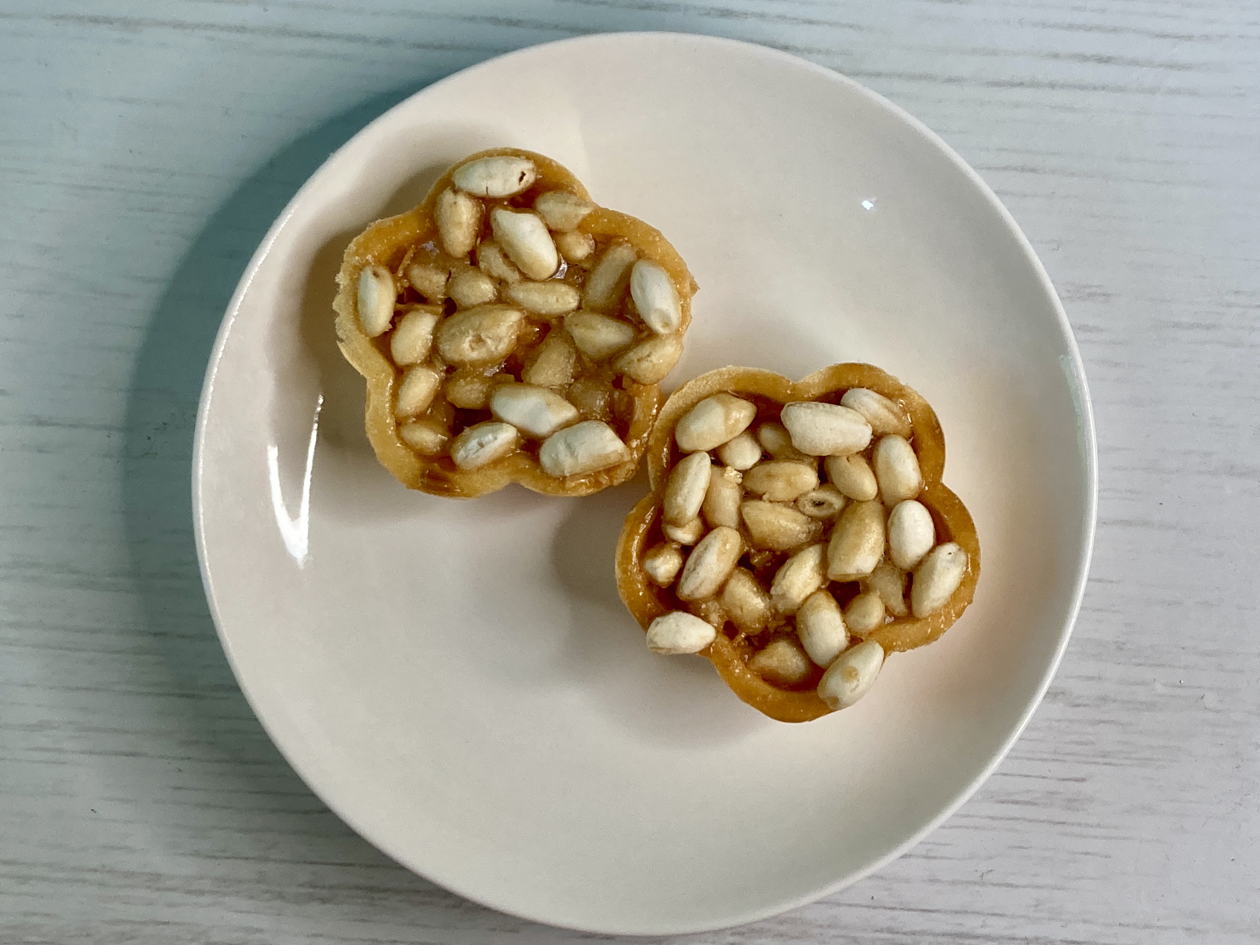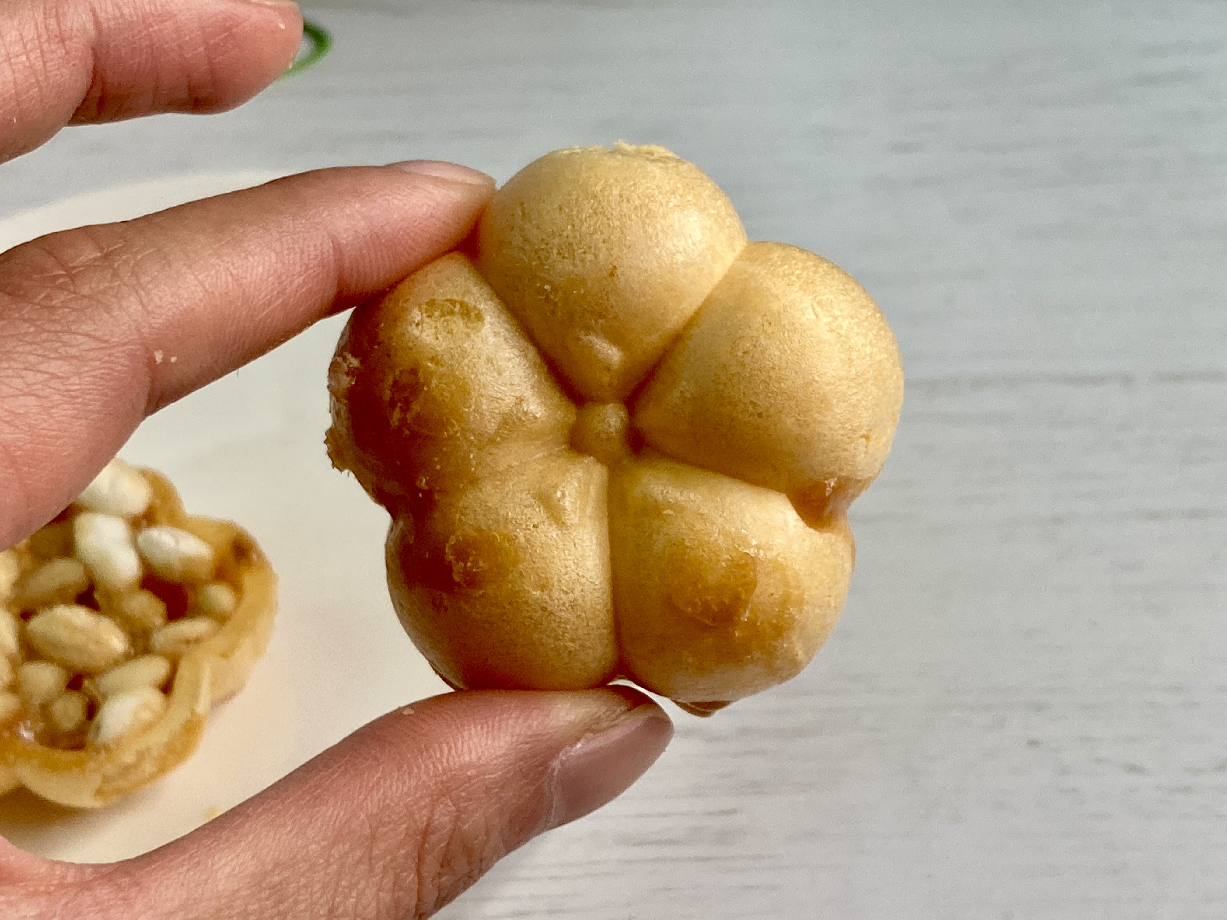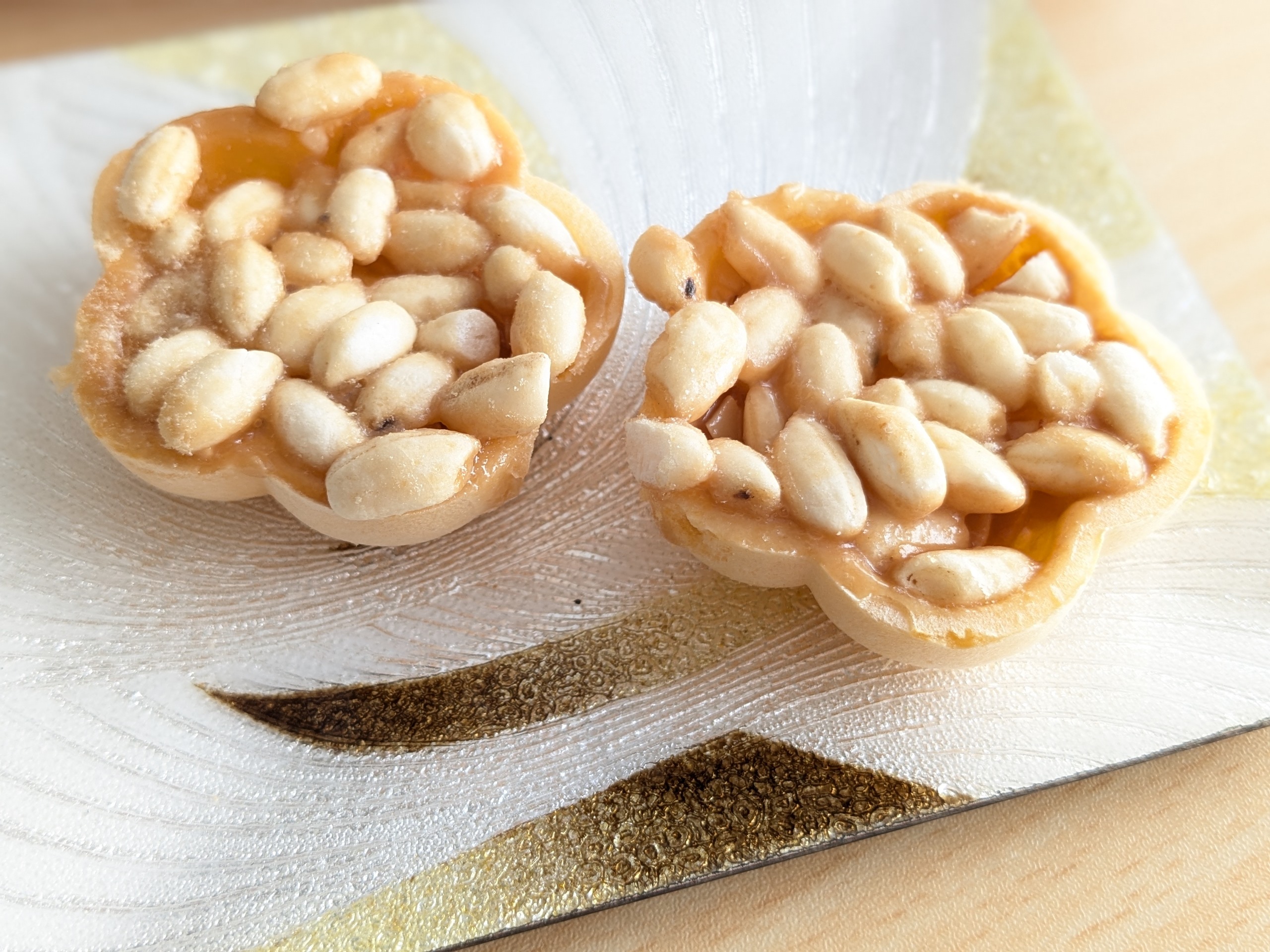 もち米から作るもなかの皮の中に、フロランタンベースのキャラメルとアーモンド、さらに米ハゼを入れたオリジナルの和スイーツ。