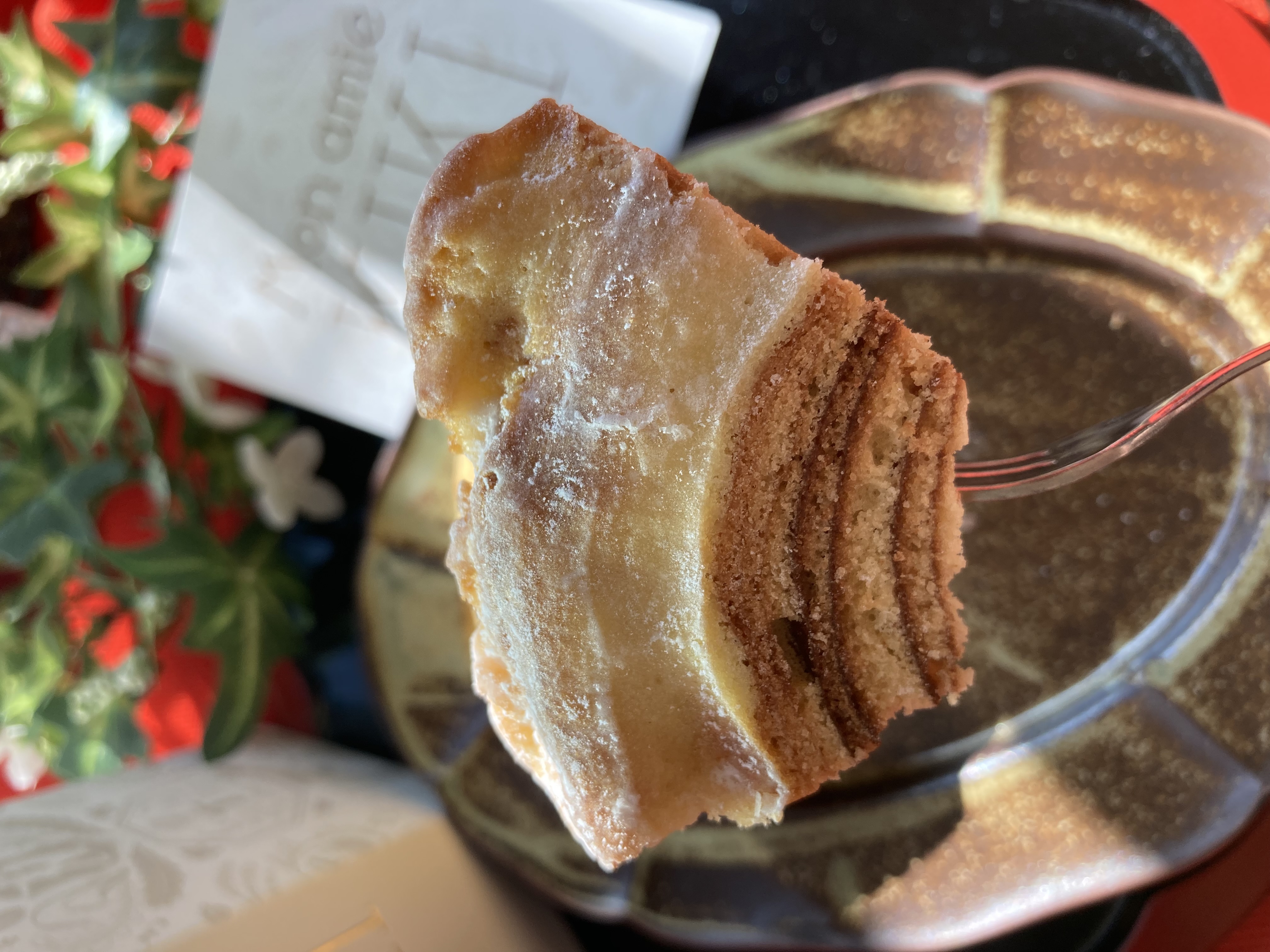 バームクーヘンというと、開封してから切り分ける手間と乾燥してしまうのでなるべく早く食べないといけないという悩みがありますが、こちらは個包装なのですぐに食べられるのが良いですね。