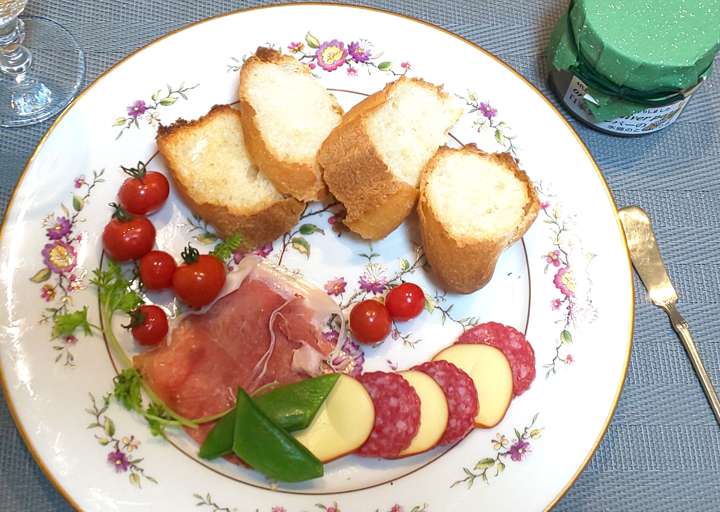 生ハム、ニンジンの葉、チーズ、トマトの他、