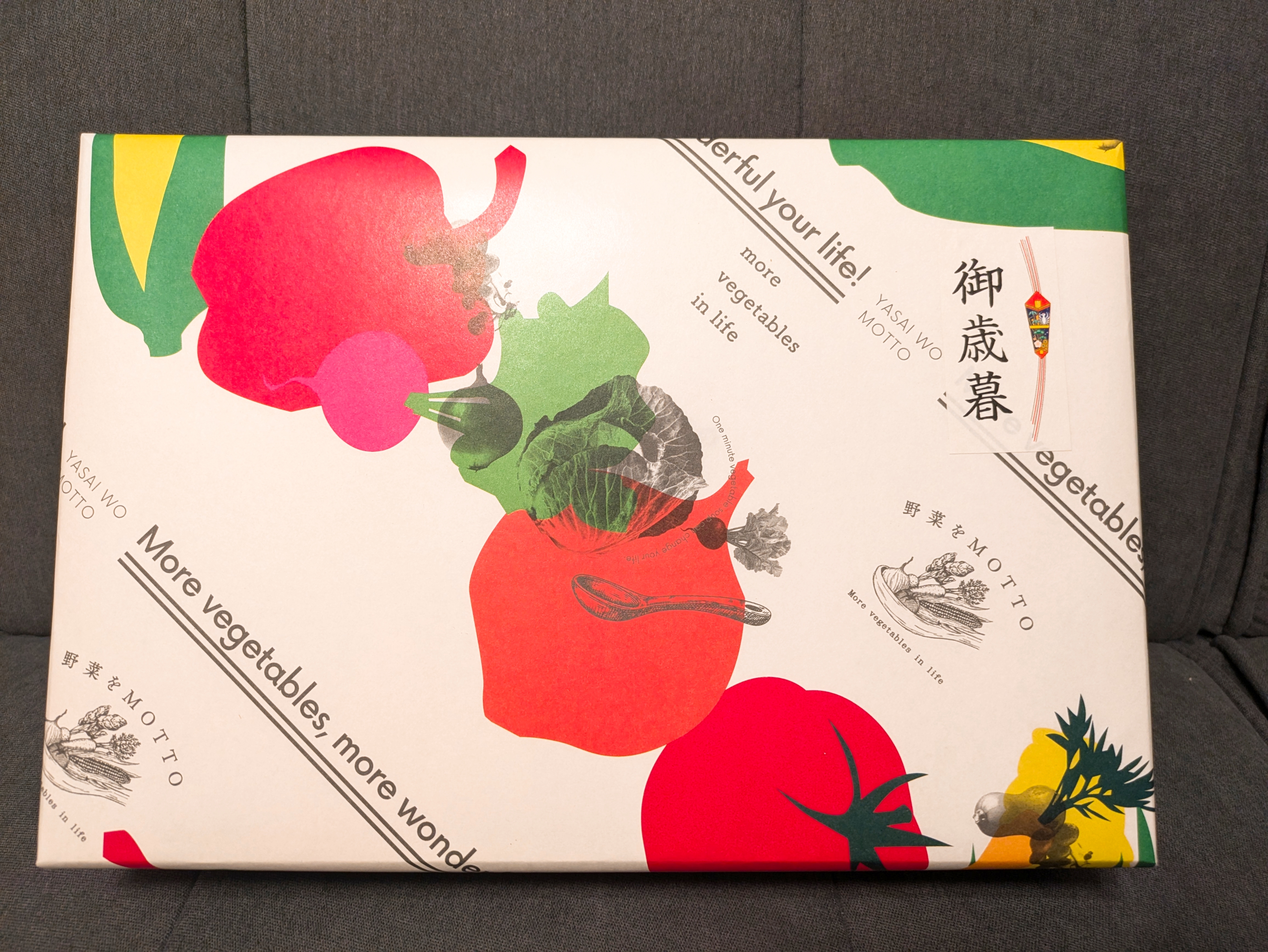 野菜柄の紙包装に、お歳暮シールが添付してお届けします。