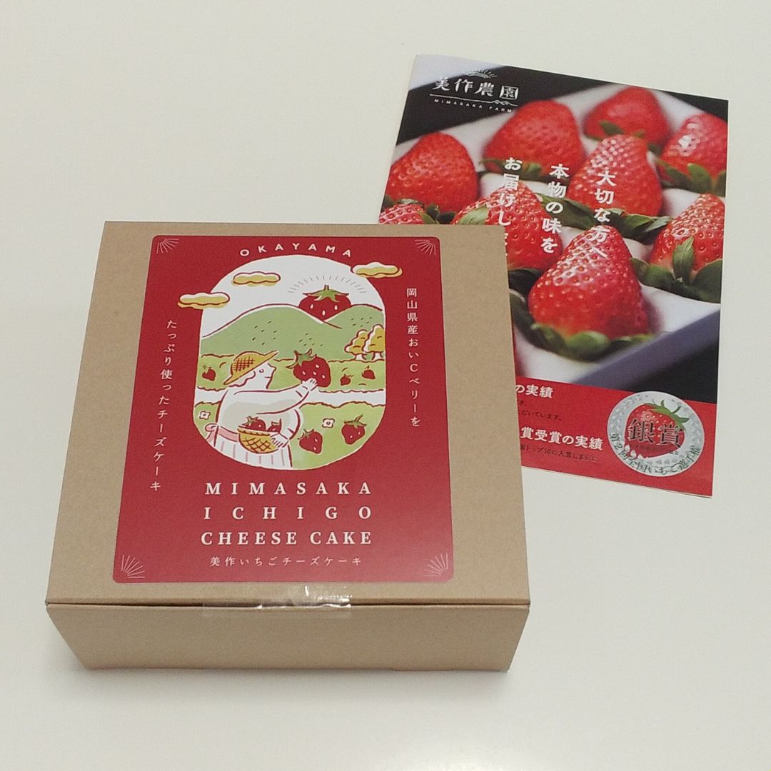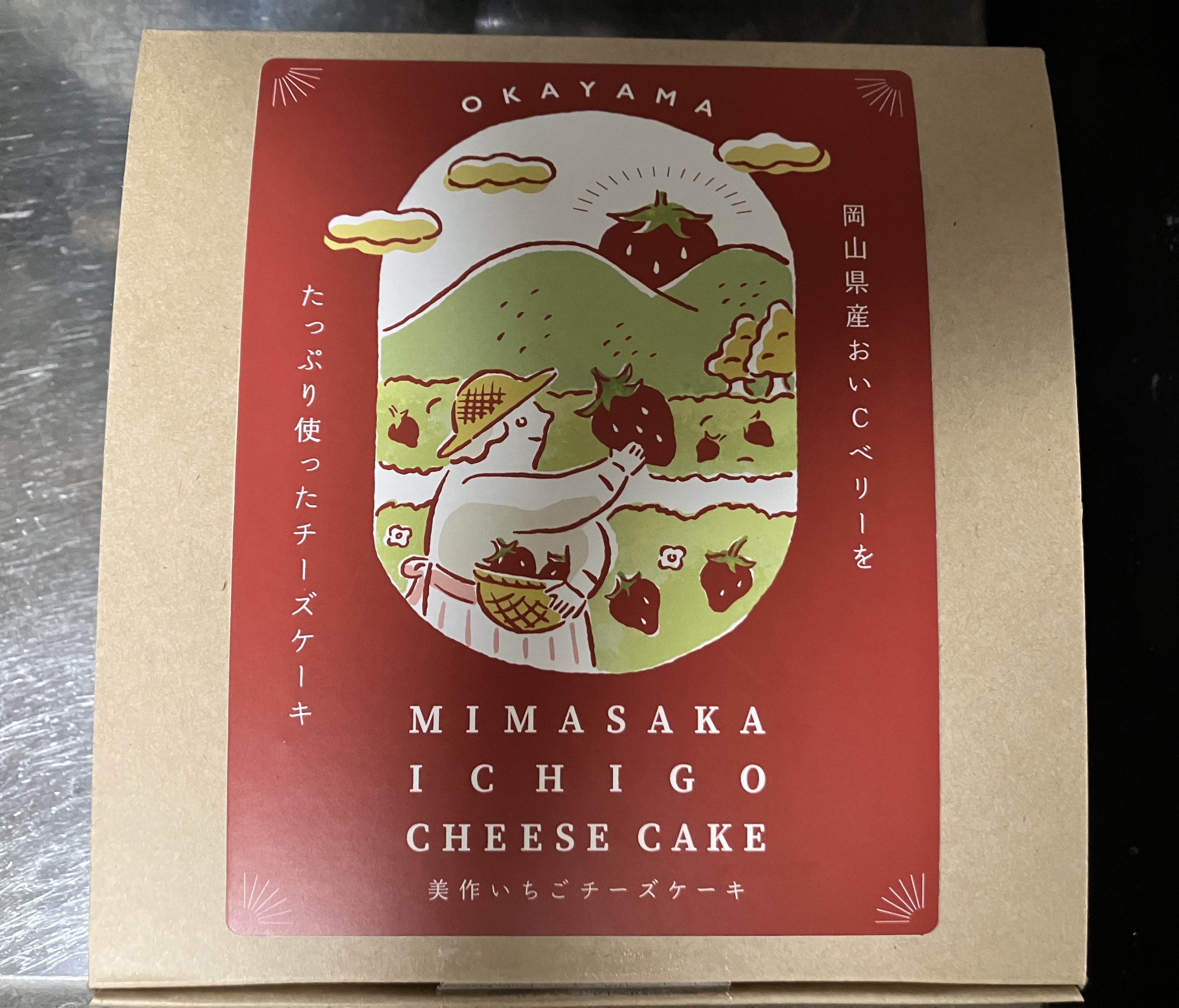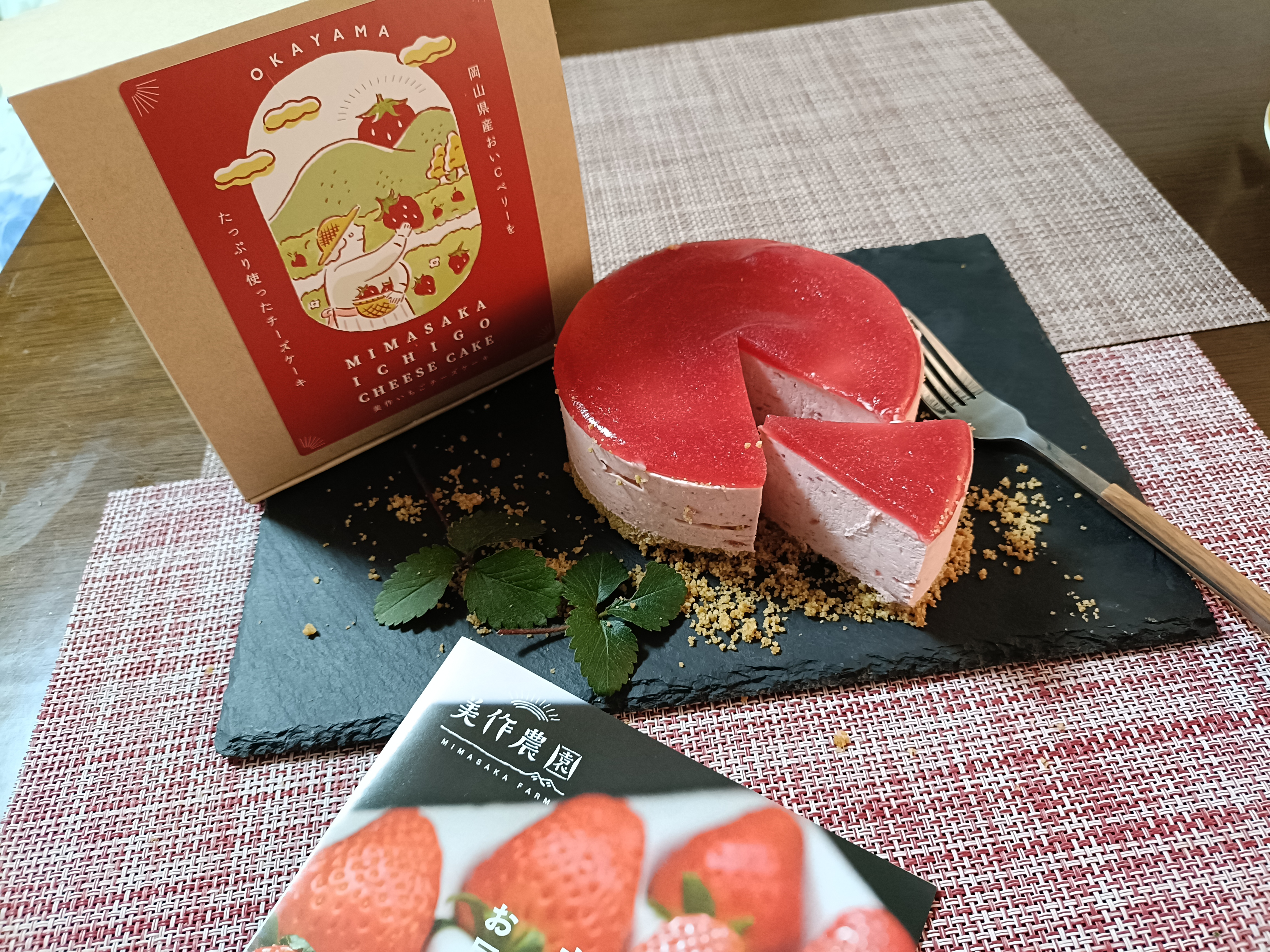 こちらのケーキ、生地に約40%も苺が使われていて、苺は岡山県産の「おいCベリー」という本格的な苺のチーズケーキです。自社農園だからこそできる贅沢さだと思います。