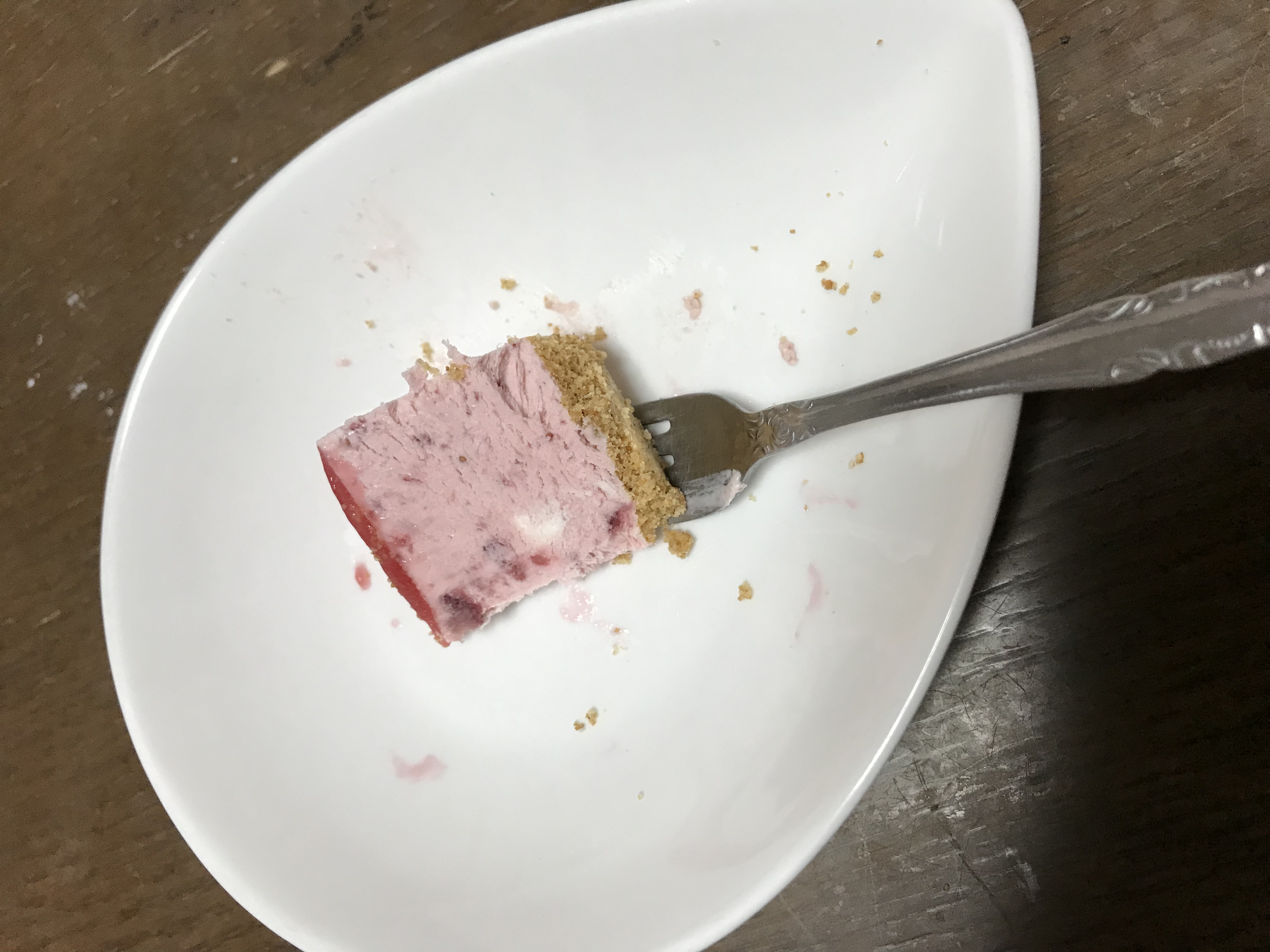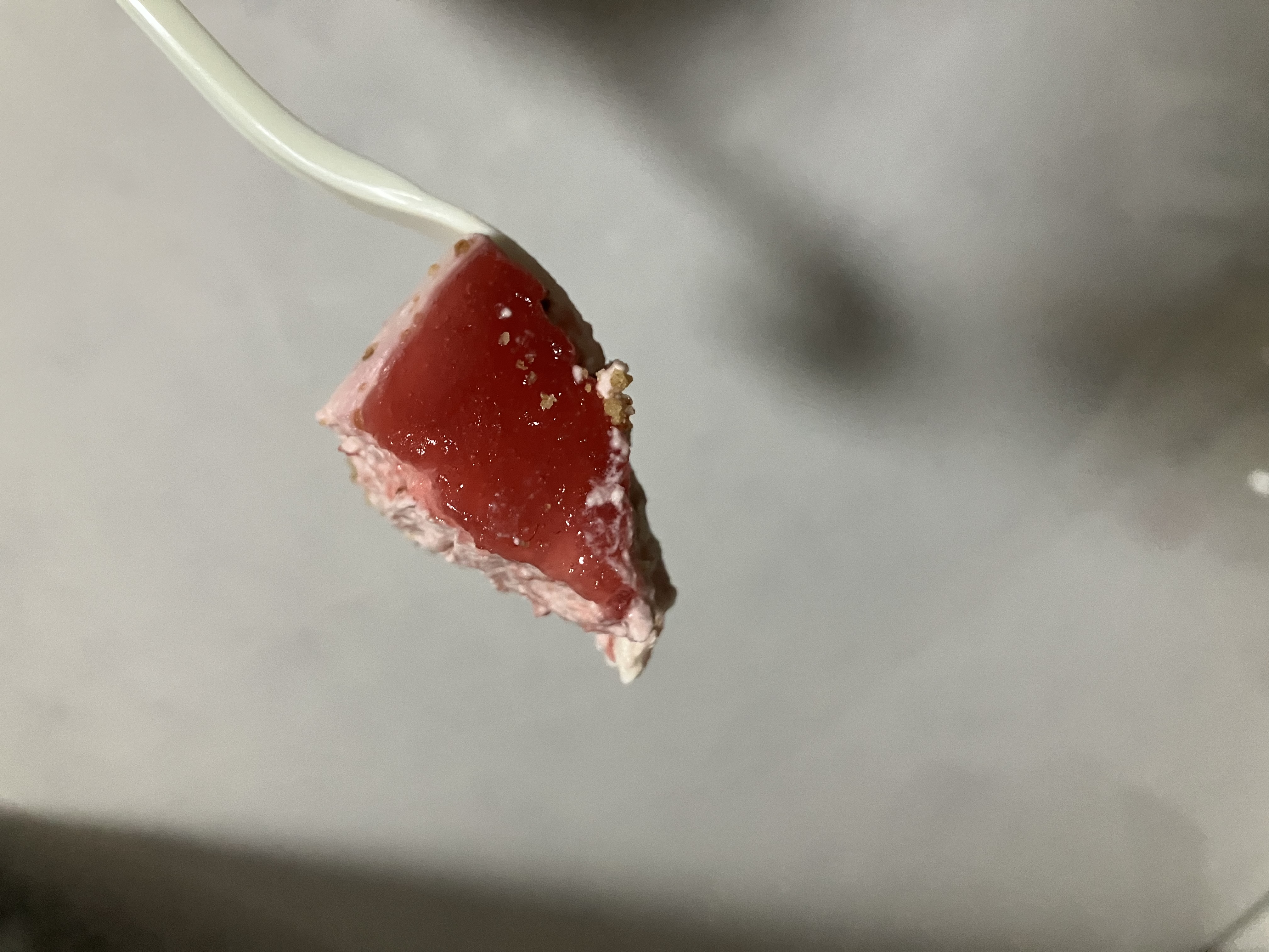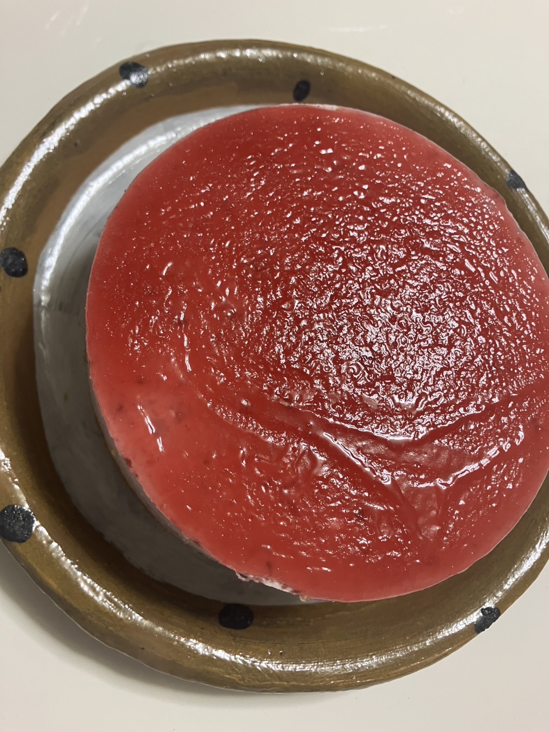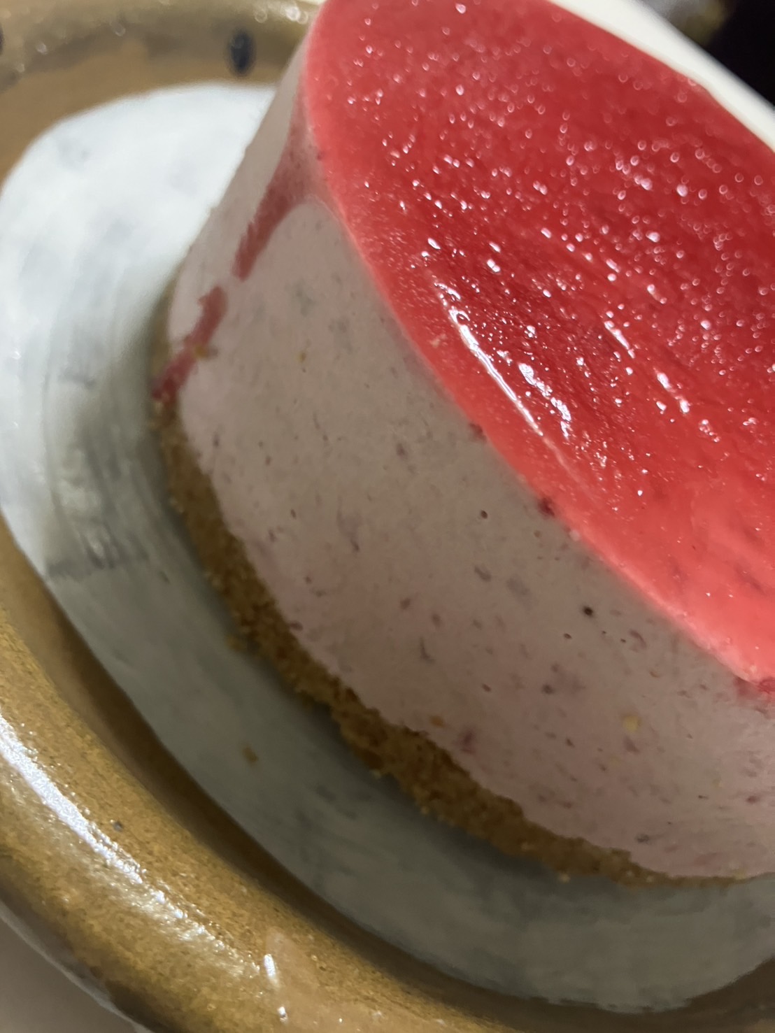 一番上の面は苺のジュレ、底の部分にはほろほろとしたビスケットの生地、そしてその間の部分が苺のレアチーズになっています。