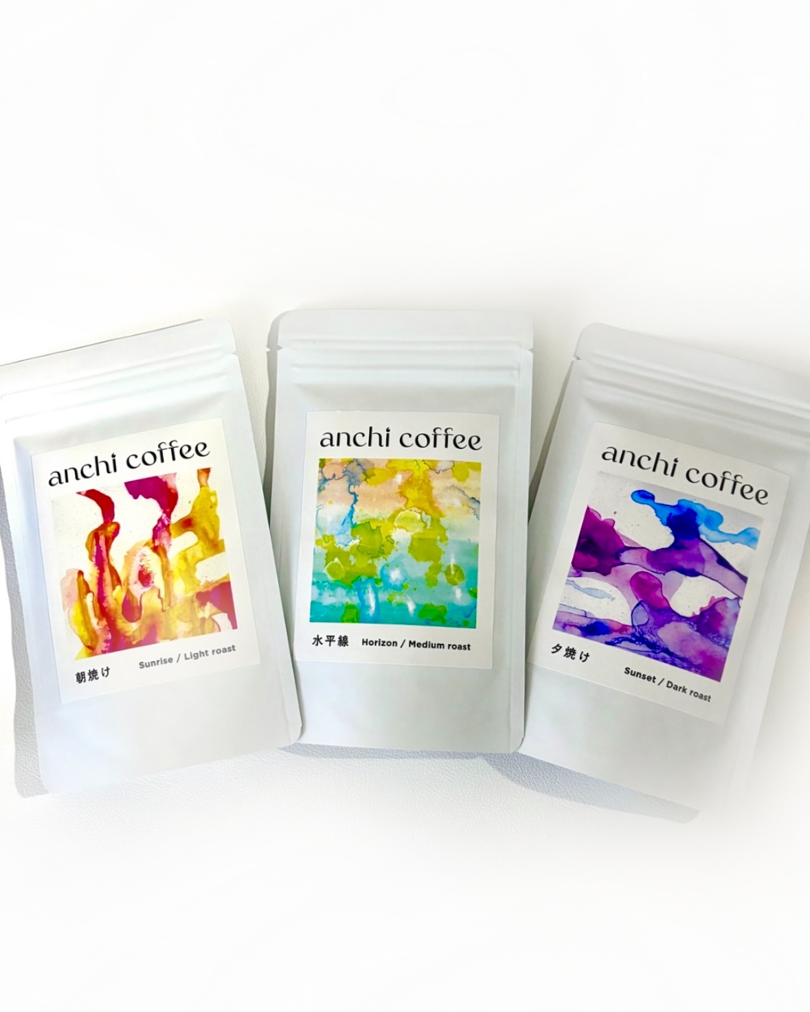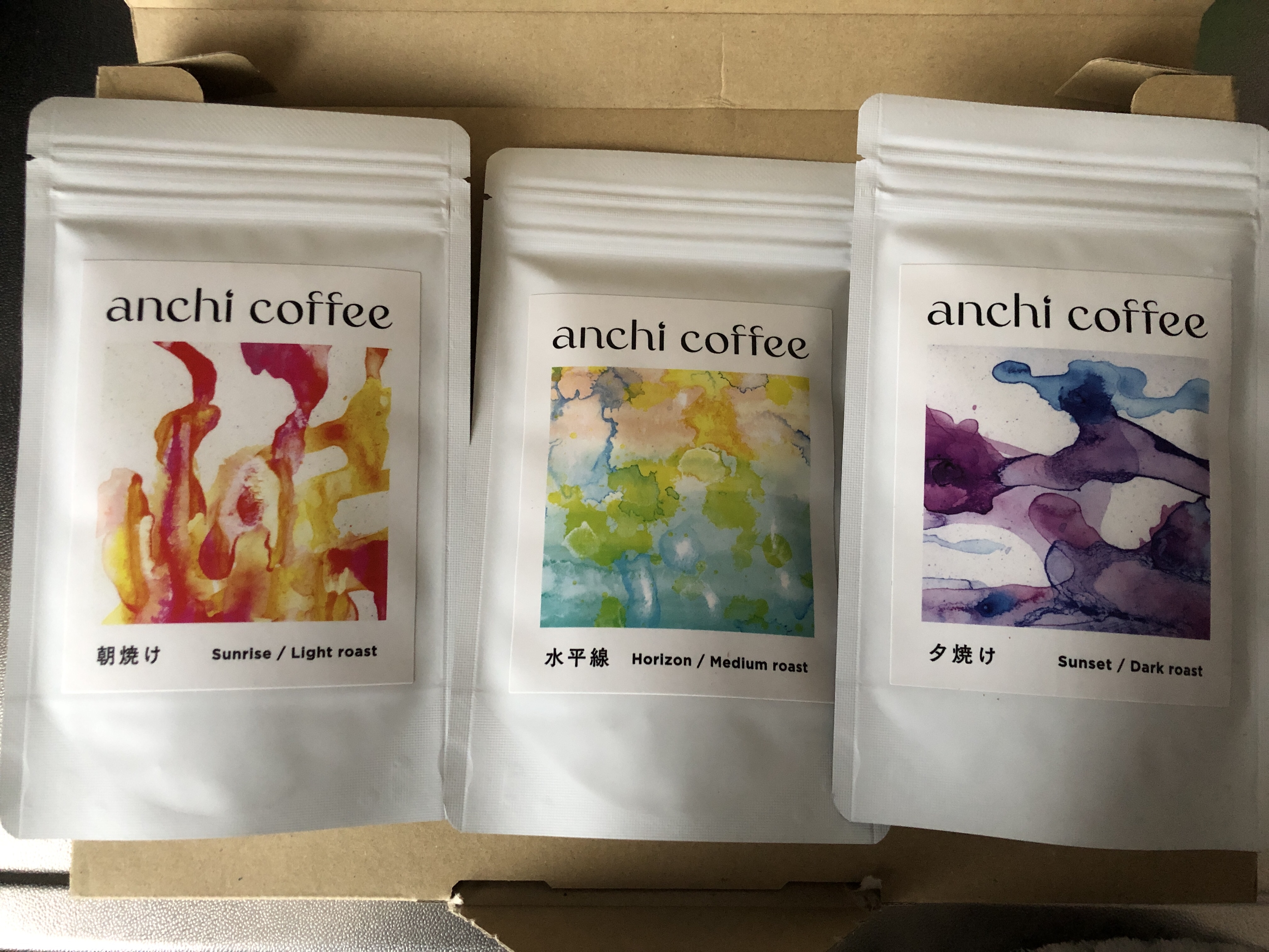 届いたコーヒーは朝焼け・水平線 ・夕焼けの3種それぞれネーミングにピッタリな色合いのパッケージになっているところがステキです