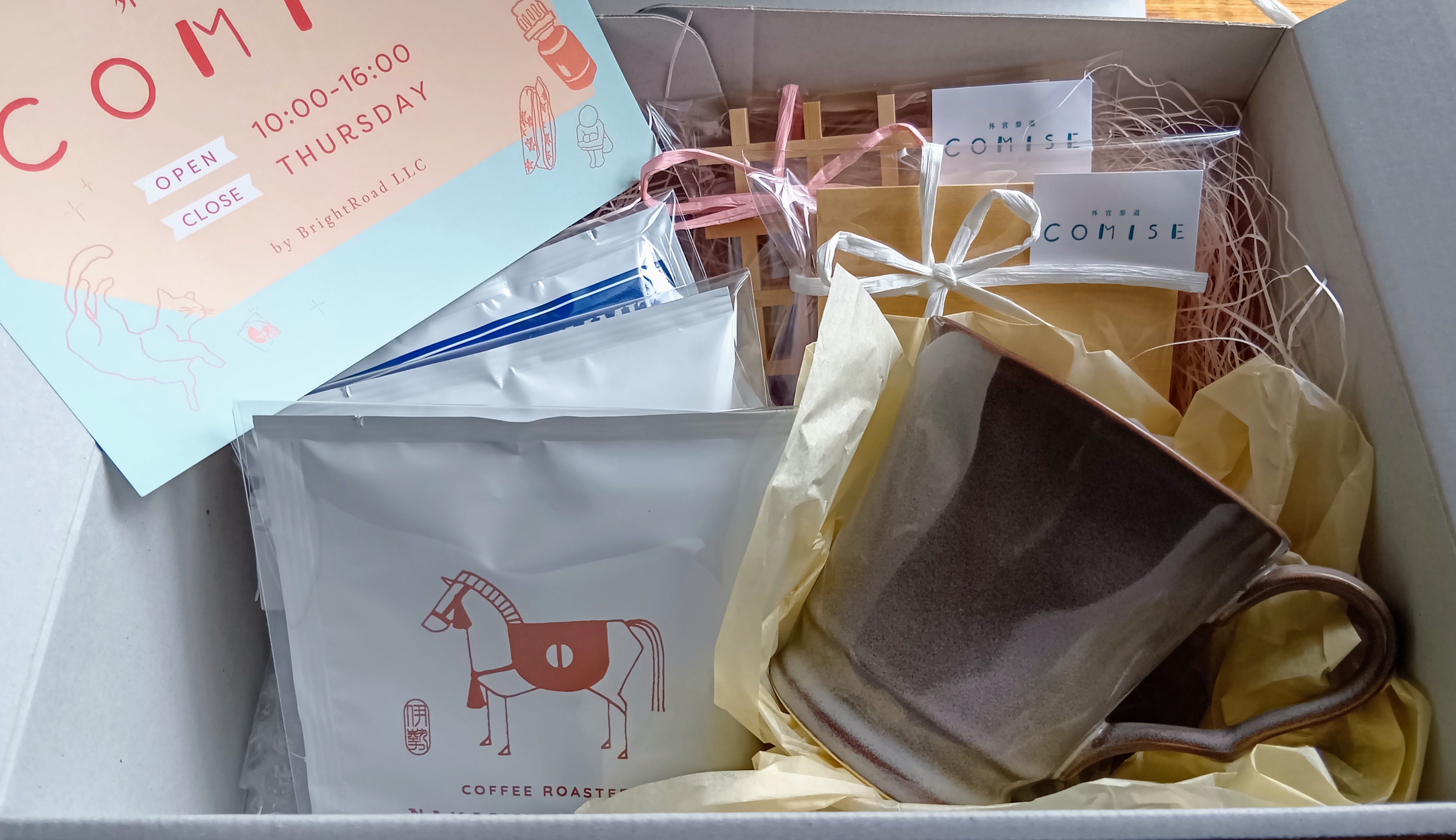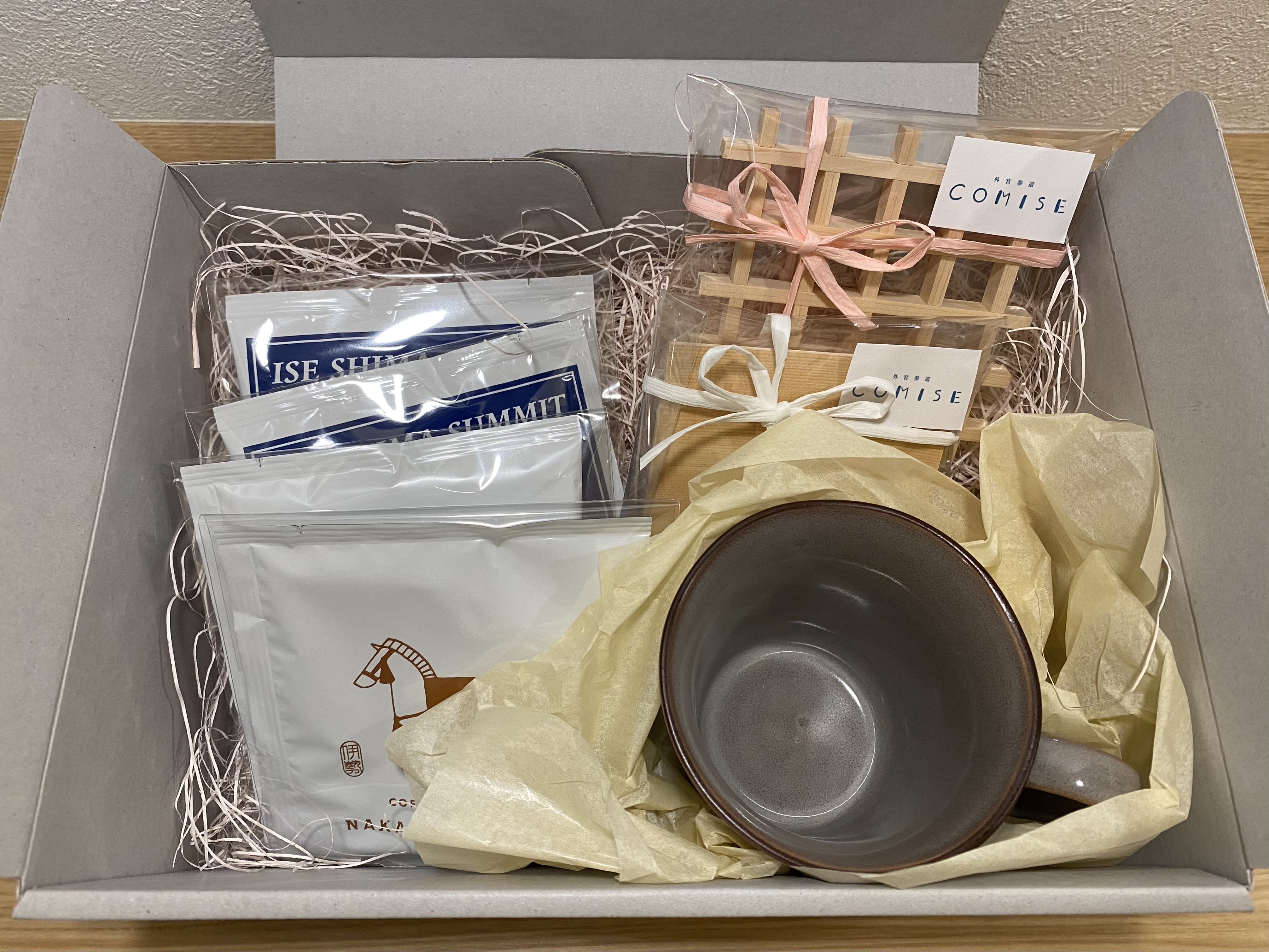 伊勢の魅力を感じられる「コーヒーギフトセット」です。伊勢にある珈琲店「なかむら珈房」のドリップコーヒー「伊勢志摩サミットブレンド」や、ディップスタイルコーヒー「神馬 -shinme-」に加え、温かみのあるデザインが特徴の「マグカップ」、そして伊勢の老舗神棚屋の木工技術が光る「ひのきコースター」がセットになっています。伊勢の温もりと上質さが詰まったギフトセットは、大切な人への贈り物にも最適です。