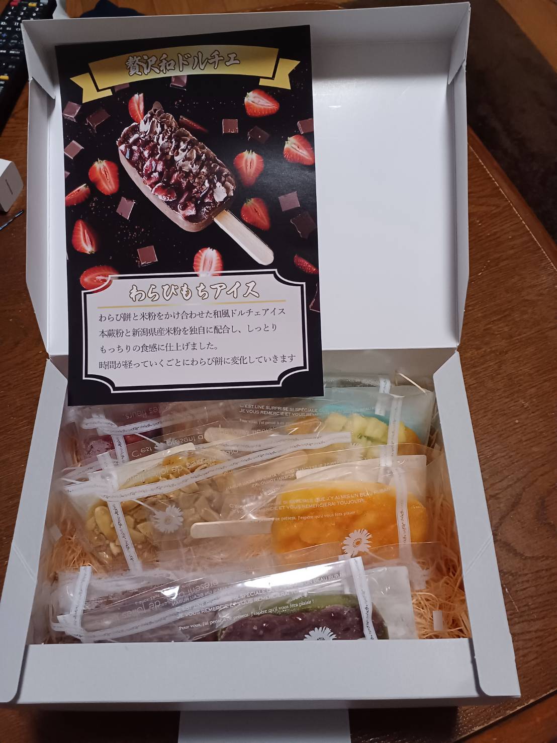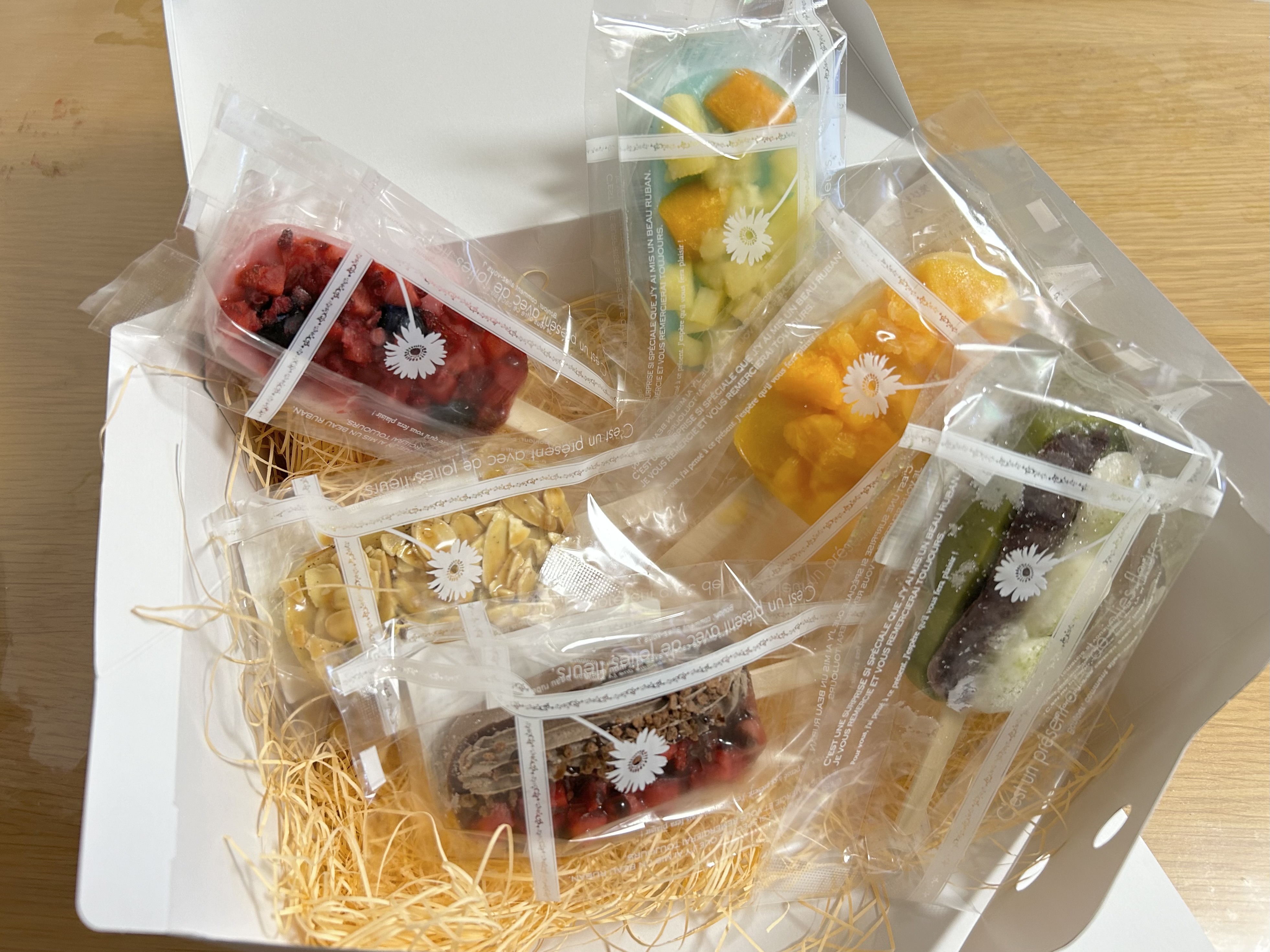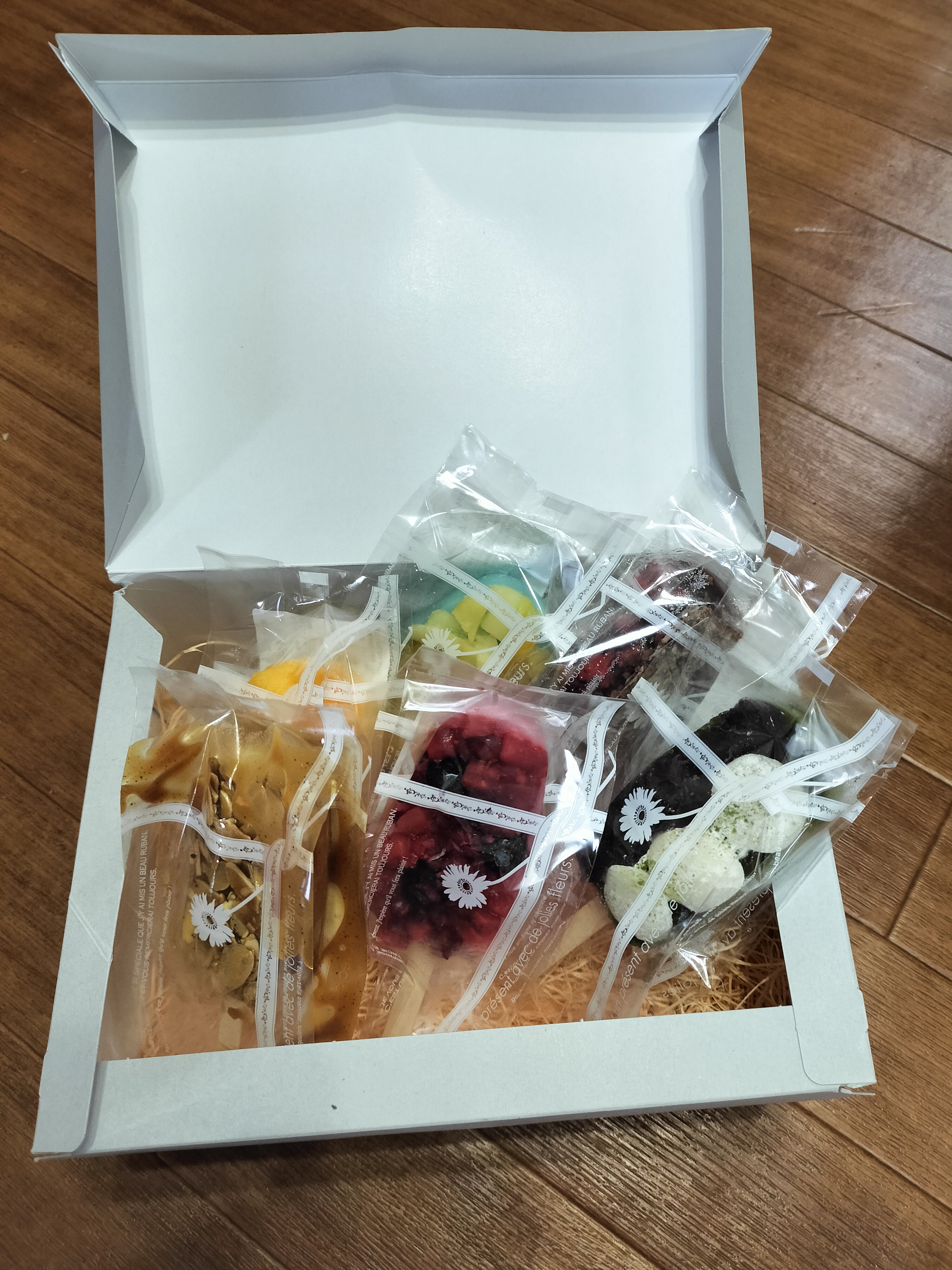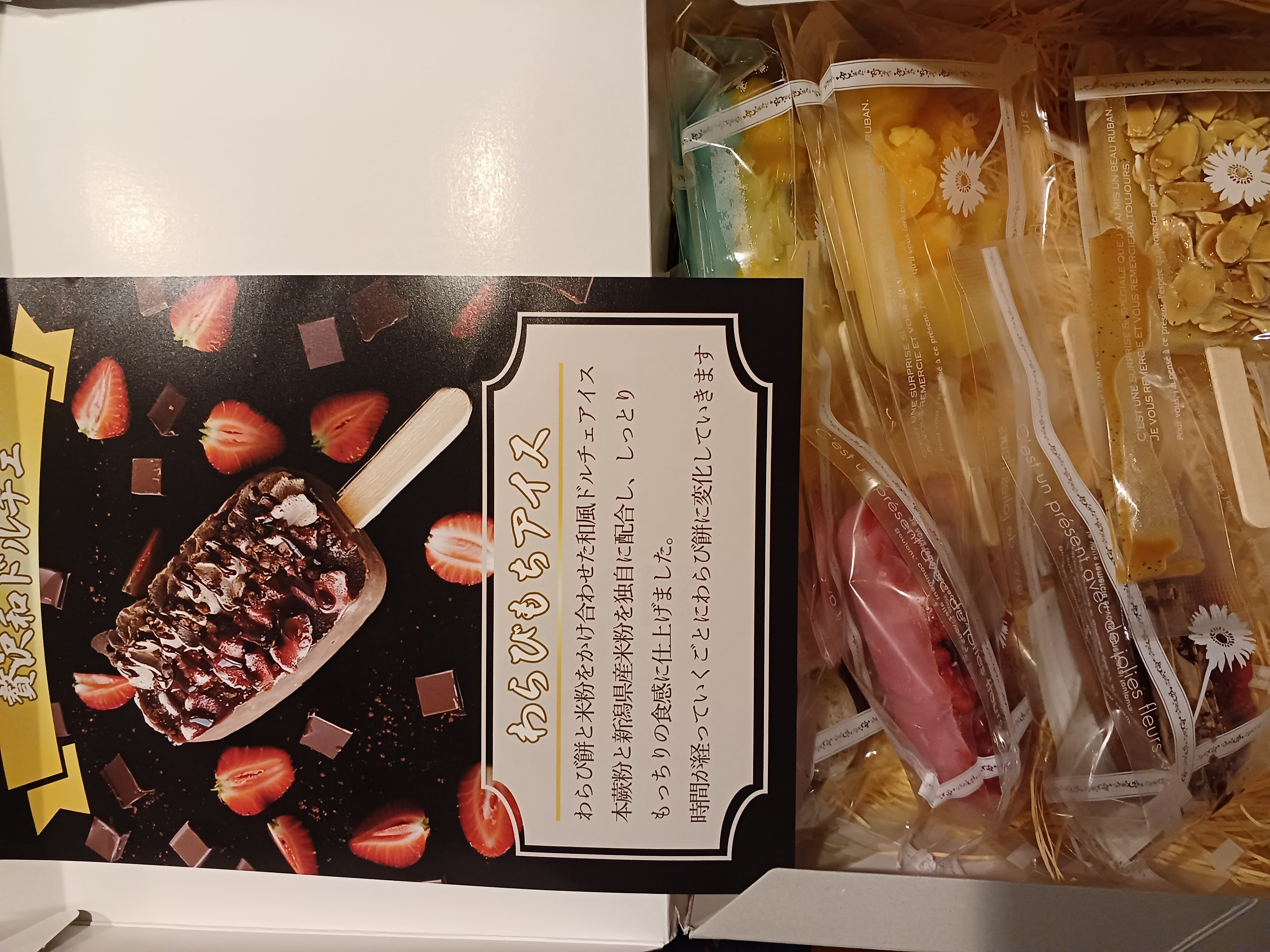 わらび餅屋が試作を重ねて完成させた「溶けないアイス」です。ベースの生地に生わらび餅を使用しているため、時間が経つとわらび餅のようなもちもち食感に変化します。口の中でとろけるような滑らかさと、もちっとした食感を堪能できます。「ベリーベリーベリー」は3種のベリーの異なる酸味と爽やかな甘さが絡み合い、「ラムネパイン」はパインの香りとラムネの酸味が一緒に楽しめます。「雪室抹茶もち」は豊かな抹茶の香りと餅の食感を味わえるなど、全6種のセットです。専用ボックスに入って届くので、贈り物にもおすすめです。