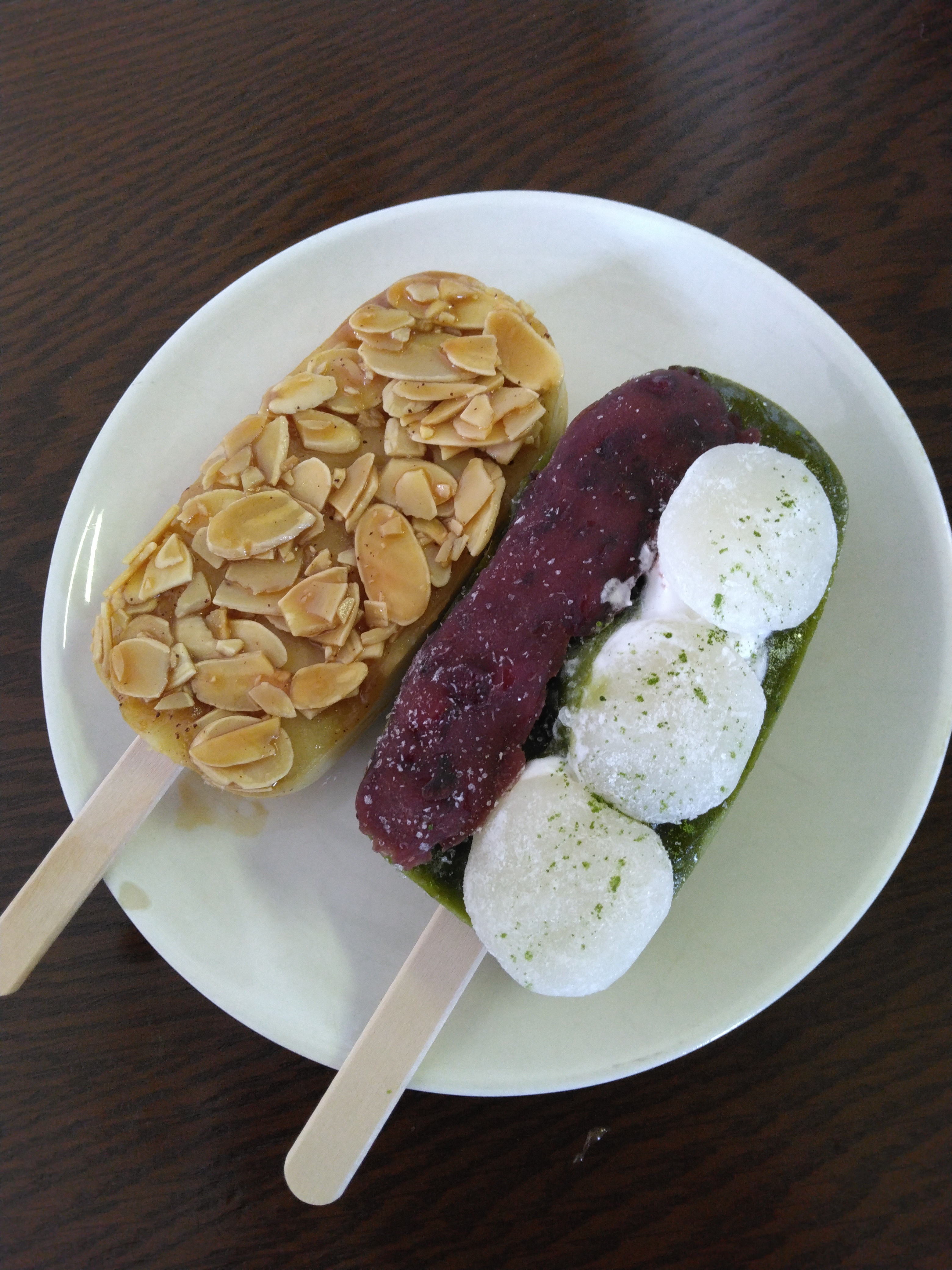 雪室抹茶餅は、抹茶らしい落ち着いた甘さと風味がとても美味しく、甘い餡子+お餅のトッピングが最高でした。お餅をくっつけるためにお餅の下にはクリームものっています。