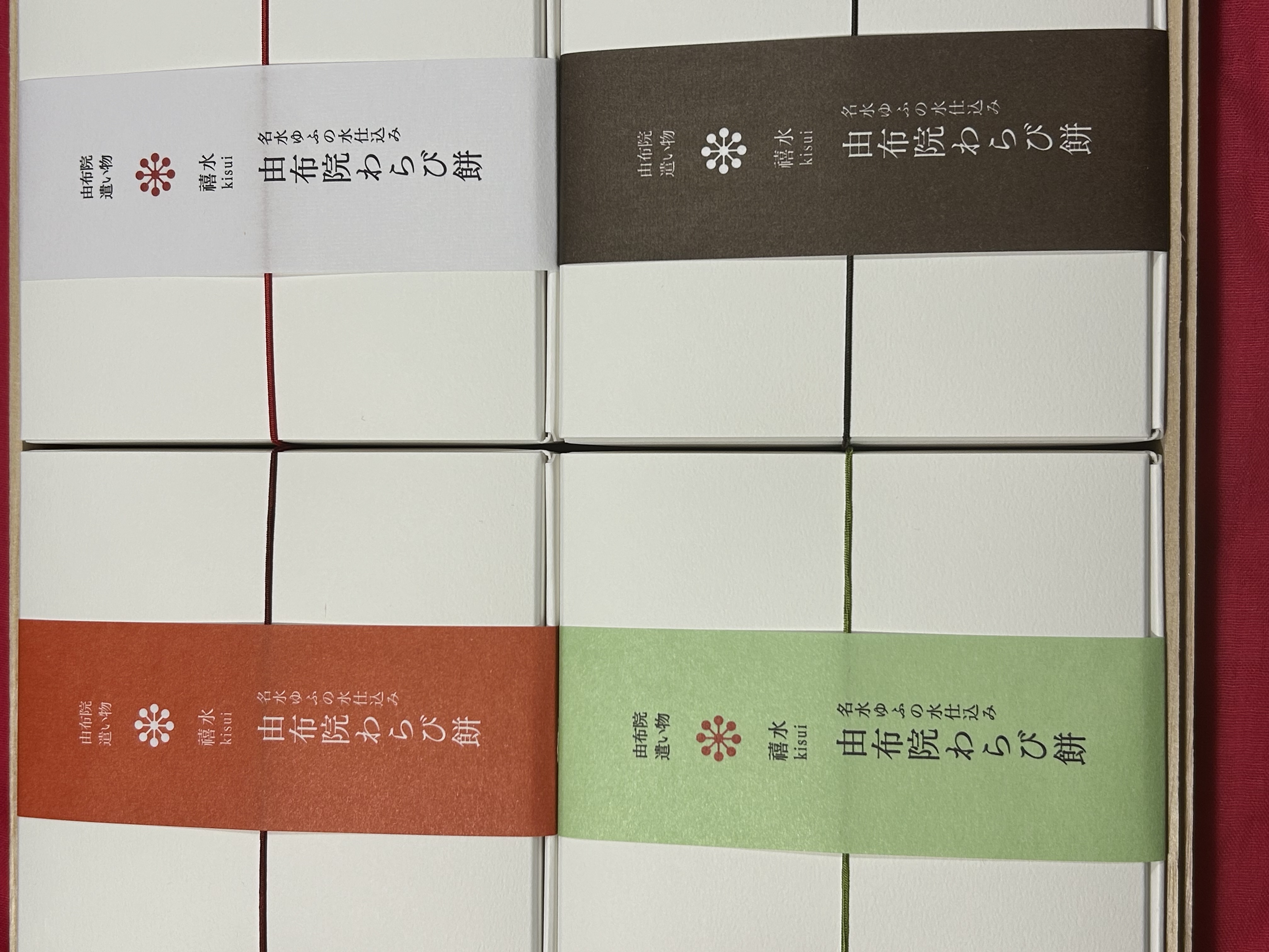 由布院の地下240mより湧き出る名水ゆふの水仕込みのわらび餅です。