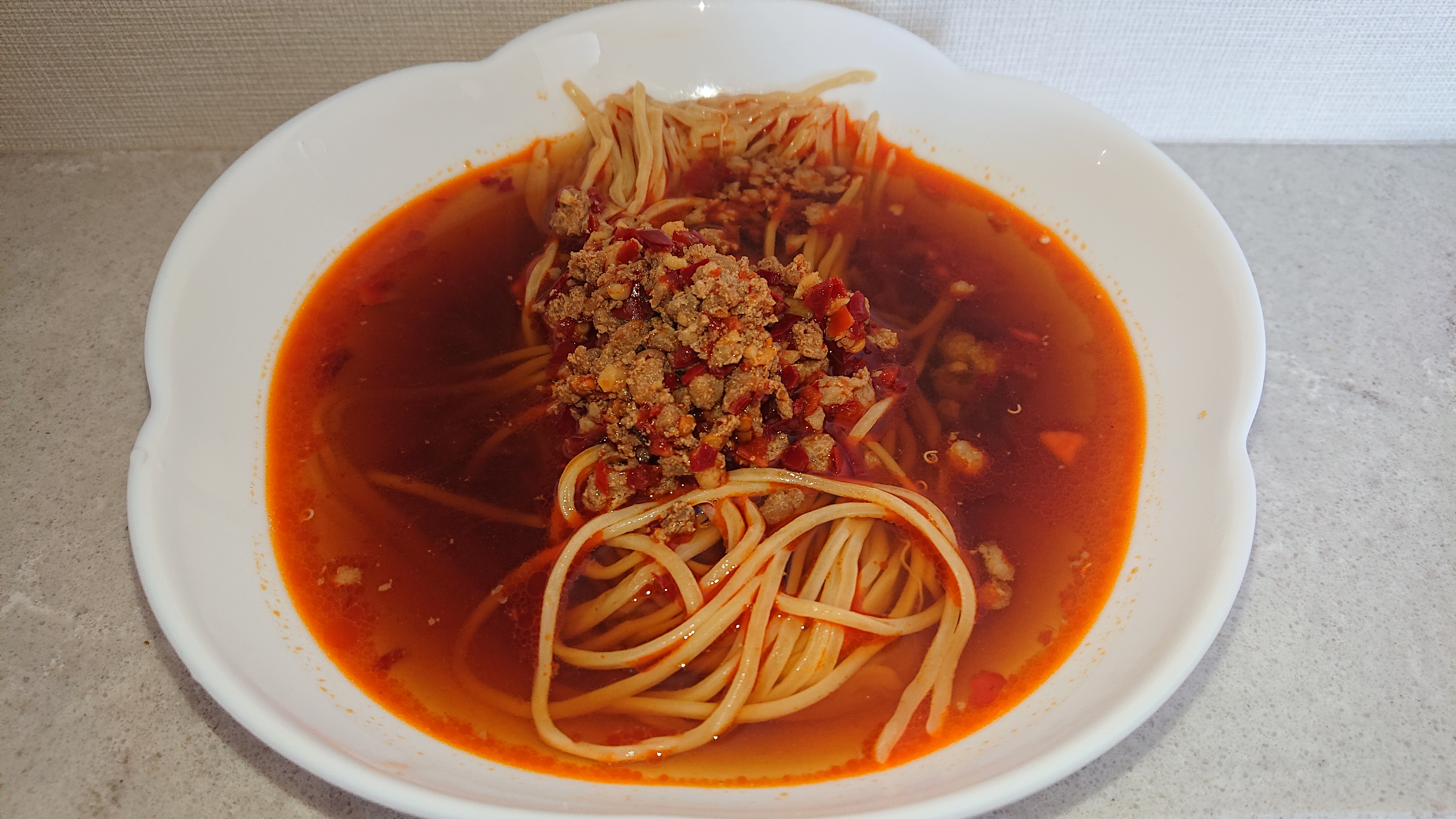 お湯で温めたスープを器に注ぐとしっかりたっぷり入っているひき肉と唐辛子にびっくり!