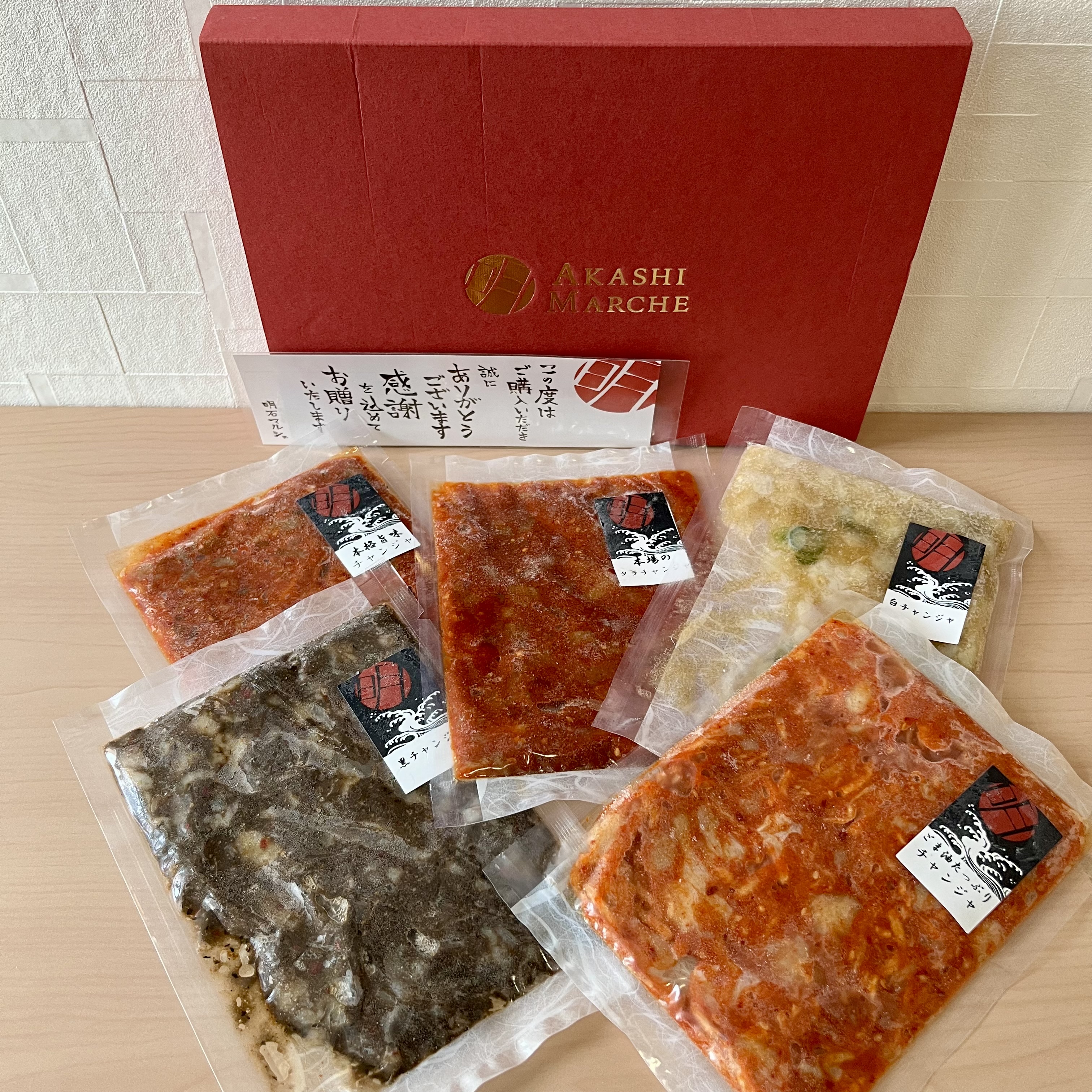 新鮮なマダラを贅沢に使用した「チャンジャ5種セット」です。「チャンジャ」とは、タラの内臓を塩漬けにし、唐辛子や薬味で和えた韓国の珍味のこと。鮮度の良いタラの胃袋を使用することで、タラ本来の旨味や食感を引き出しています。調味料は、すべて手作りで調合しているので、噛むほどに唐辛子の旨辛と魚介の旨味が溢れ出します。濃厚な旨辛の味付け「本格旨味チャンジャ」、黒胡椒がピリリと辛い「黒チャンジャ」、さわやかな生姜と青唐辛子の「白チャンジャ」など5種。お酒のおつまみやご飯のお供にぴったりです。専用ボックスに入って届くため、贈り物にもおすすめです。