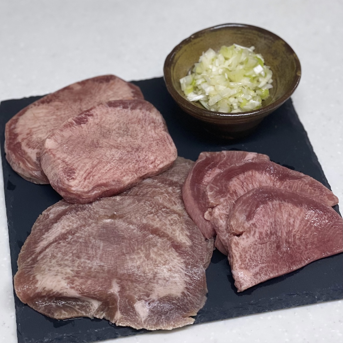 焼肉店のように、刻んだネギを牛タンに乗せて焼くのも美味しいですが、刻んだネギをごま油で和えて、それを牛タンで巻いてネギを蒸し焼きにして頂くのも、ワンランク上の薄切り牛タンの美味しい頂き方です。是非お試しください。