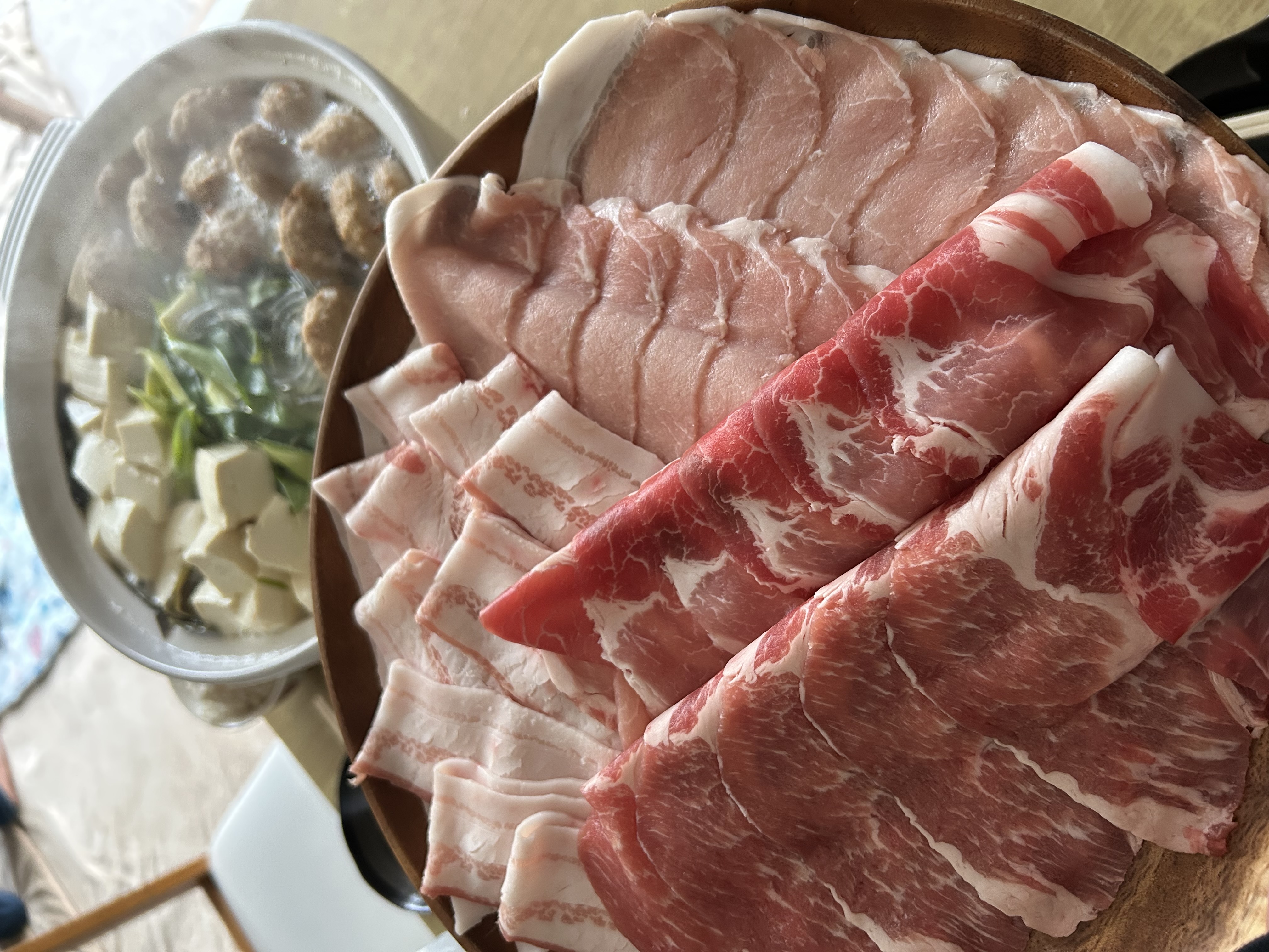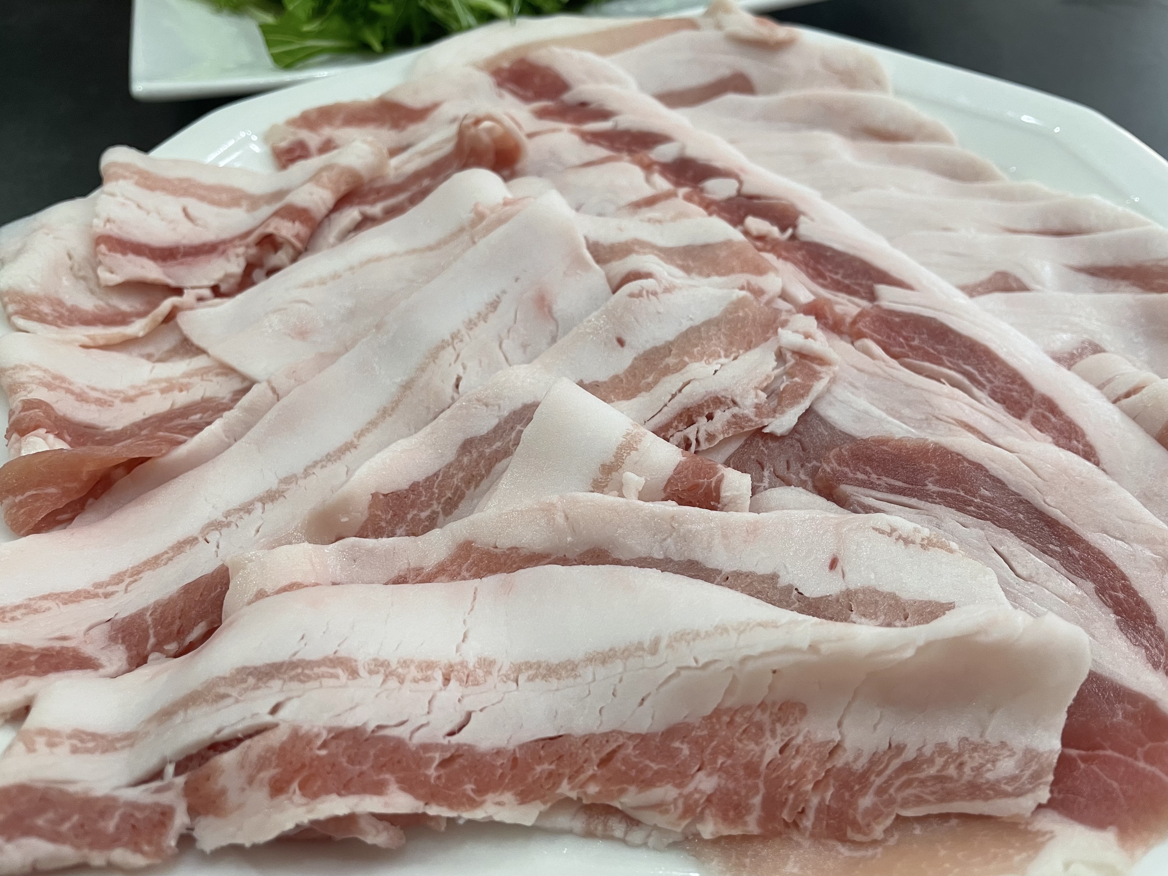 ロースはほどよい脂がついており、ピンク色の赤身との割合が抜群!豚の旨み、コクが舌の上で踊るよう!えのきなどと一緒に食べるのがおすすめ。