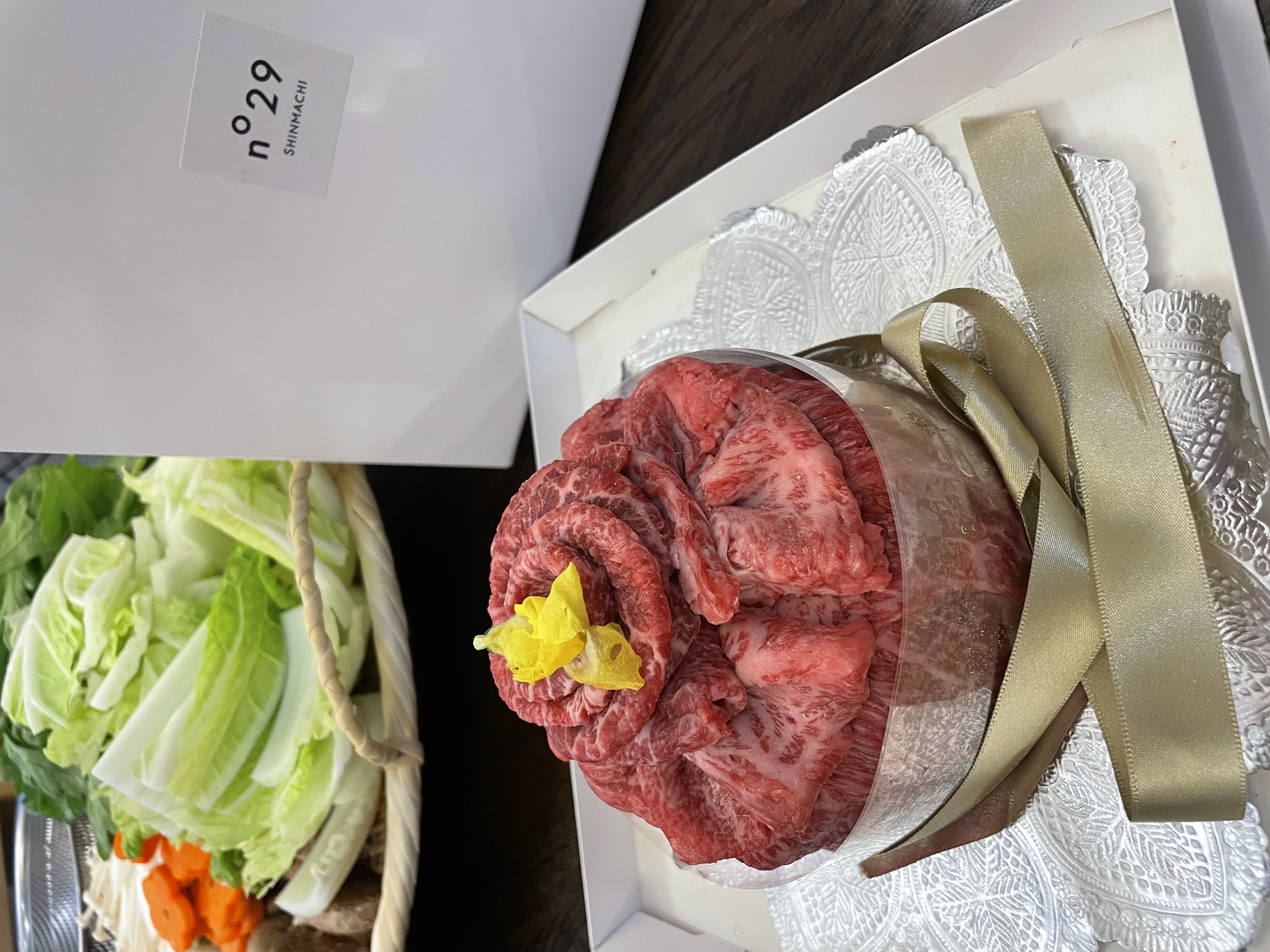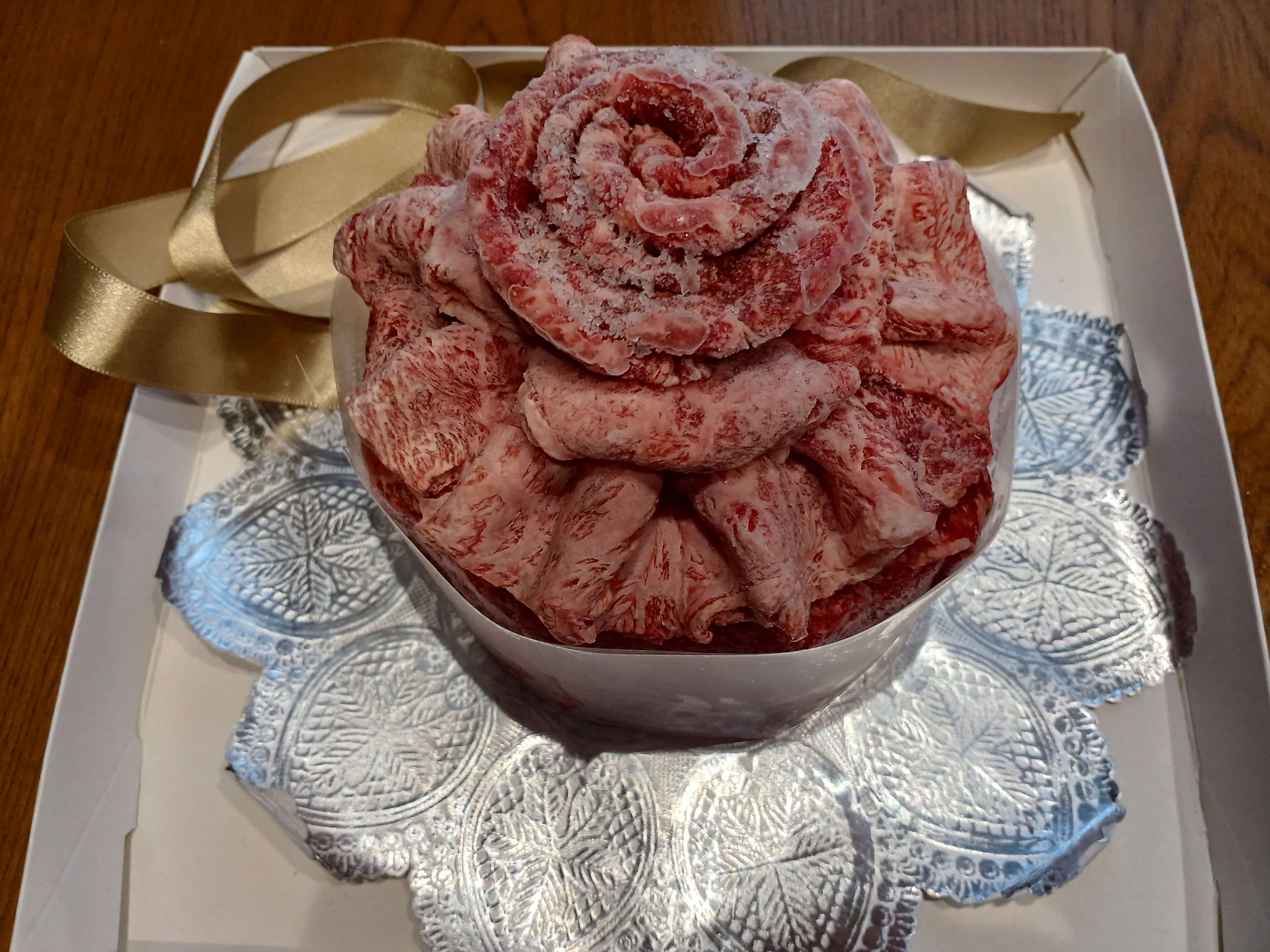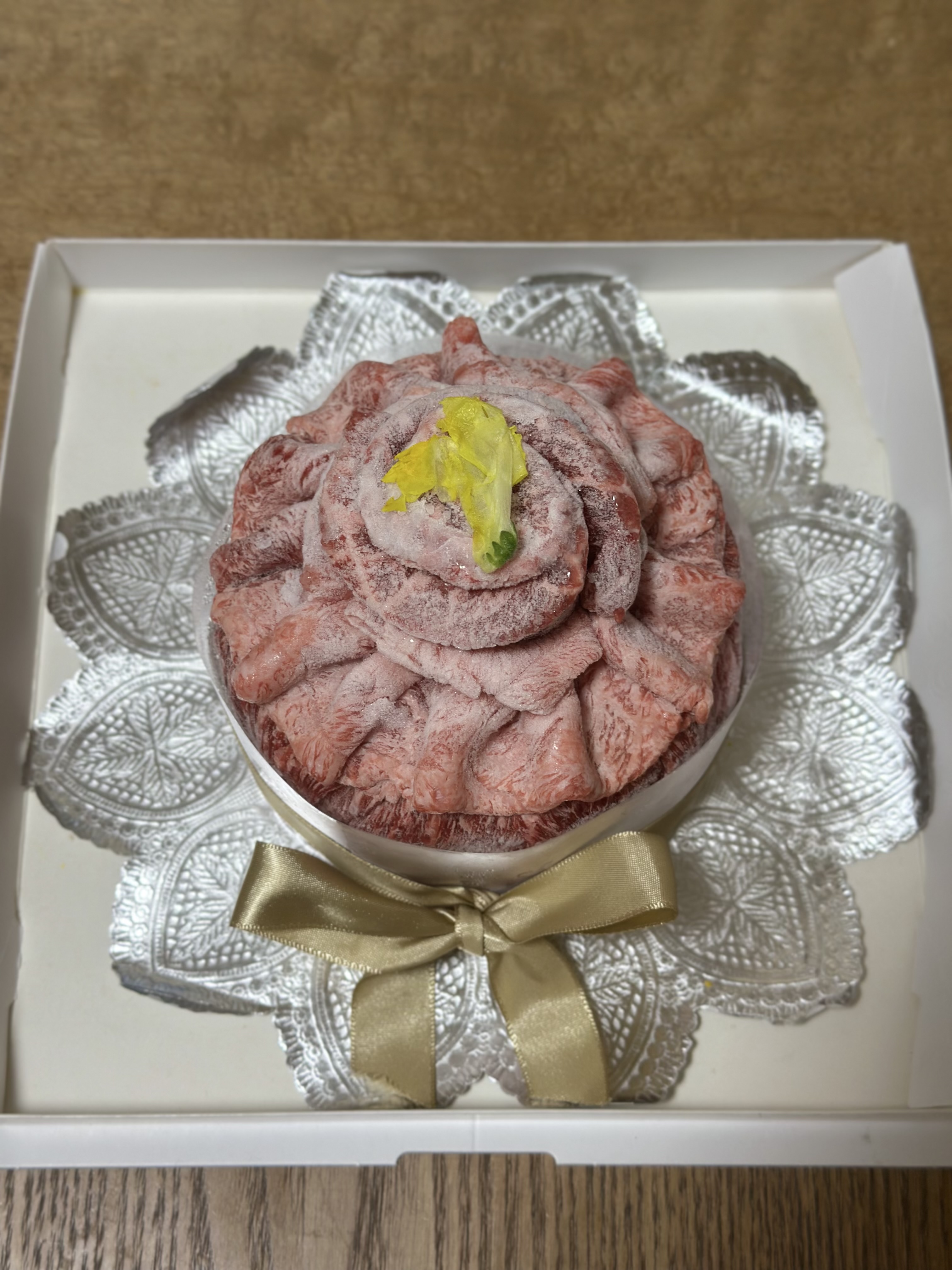 最高級A5ランクの黒毛和牛を使用した「肉ケーキ」です。30年以上にわたり肉に携わってきたシェフが考案・デザインし、一つ一つ丁寧に調理しています。国産黒毛和牛ミスジを、しゃぶしゃぶやすき焼きにぴったりの厚さにスライスし、美しく盛り付けています。1台300gで、2~3人で楽しむのにおすすめです。ホールケーキを思わせる贅沢な飾りつけが華やかな商品なので、自宅用はもちろん、特別な日のお祝いや贈り物にもおすすめです。