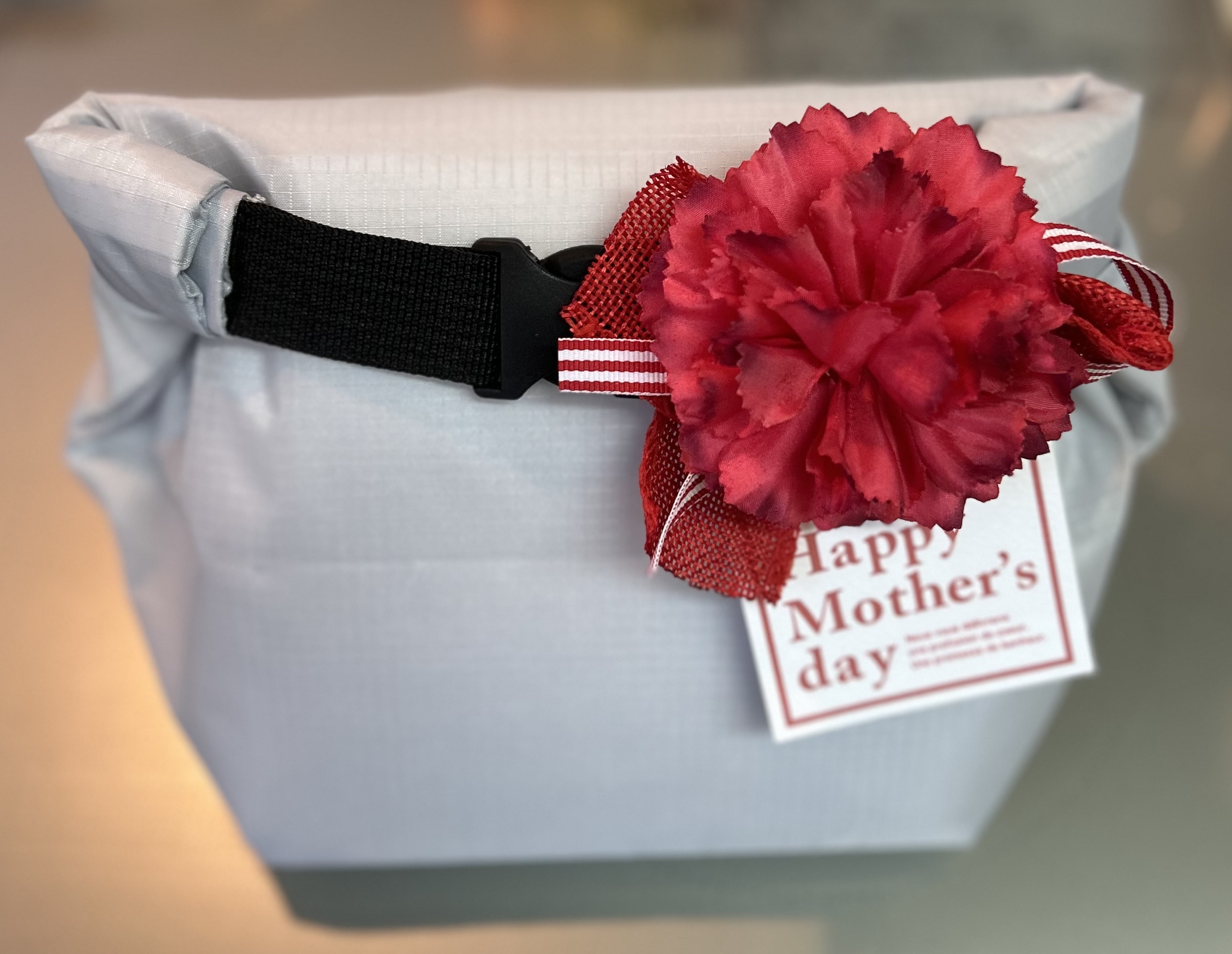母の日のプレゼント用に装飾された冷凍バッグとカスタード、チョコ、ストロベリー、抹茶の4種類のドーナツがセットになっていて、母の日のギフトにぴったりです。
