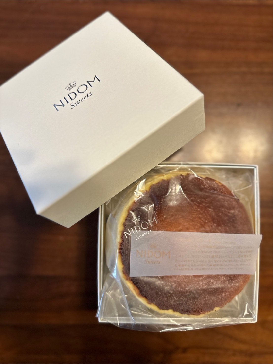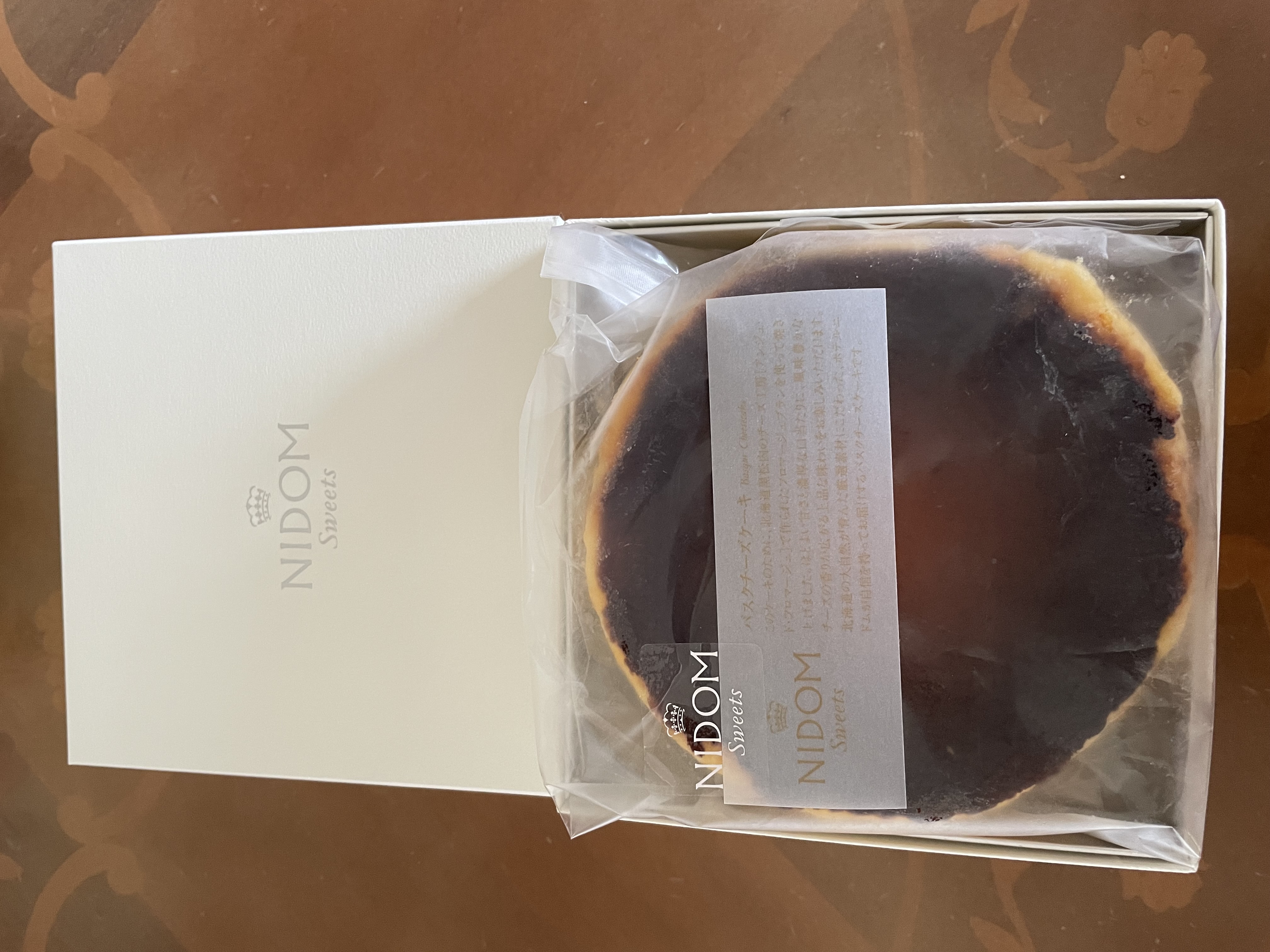 北海道産のフレッシュチーズを使用し、「ホテルニドム」のエグゼクティブシェフパティシエが作った「バスクチーズケーキ」です。北海道黒松内のチーズ工房「アンジュ・ド・フロマージュ」で、ホテルニドムのバスクチーズケーキ用に製造したフロマージュブランと、厳選したチーズをブレンド。焼き時間や温度を試行錯誤し、口の中でとろけるような食感に仕上げています。上品なボックスに入って届くため、贈り物にもおすすめです。