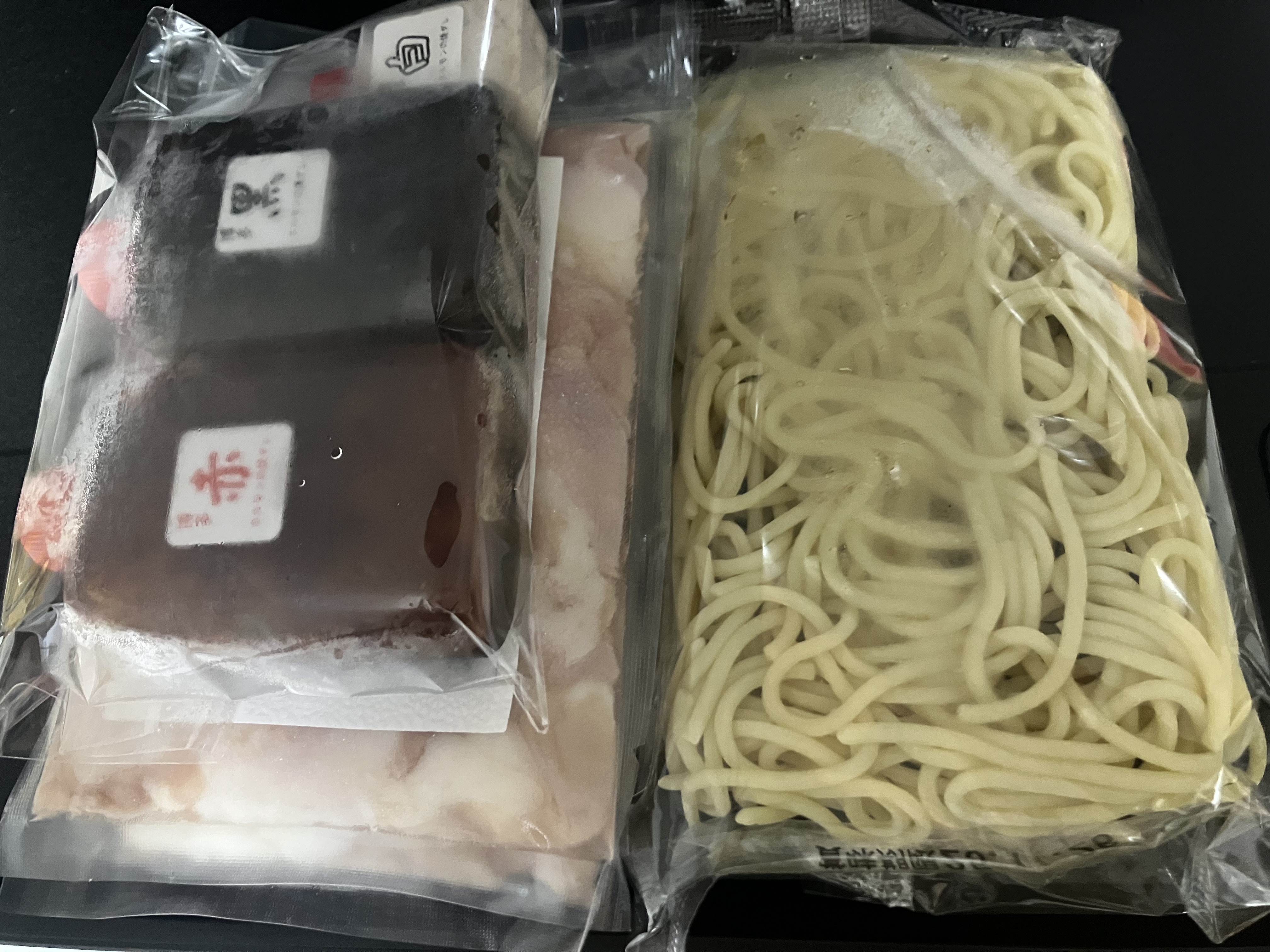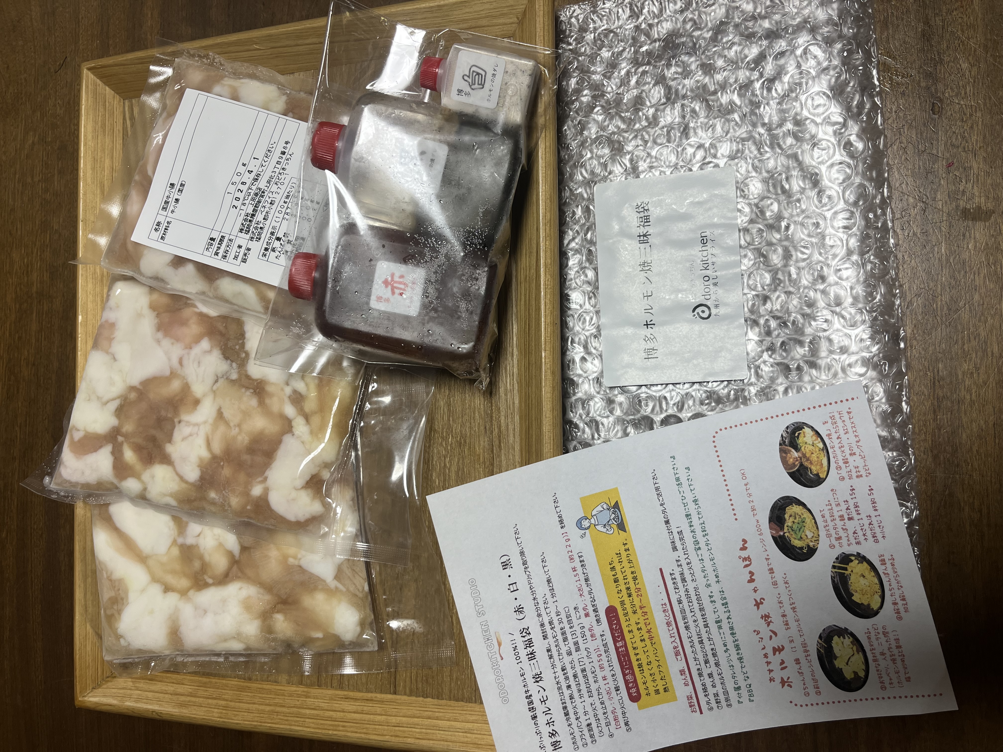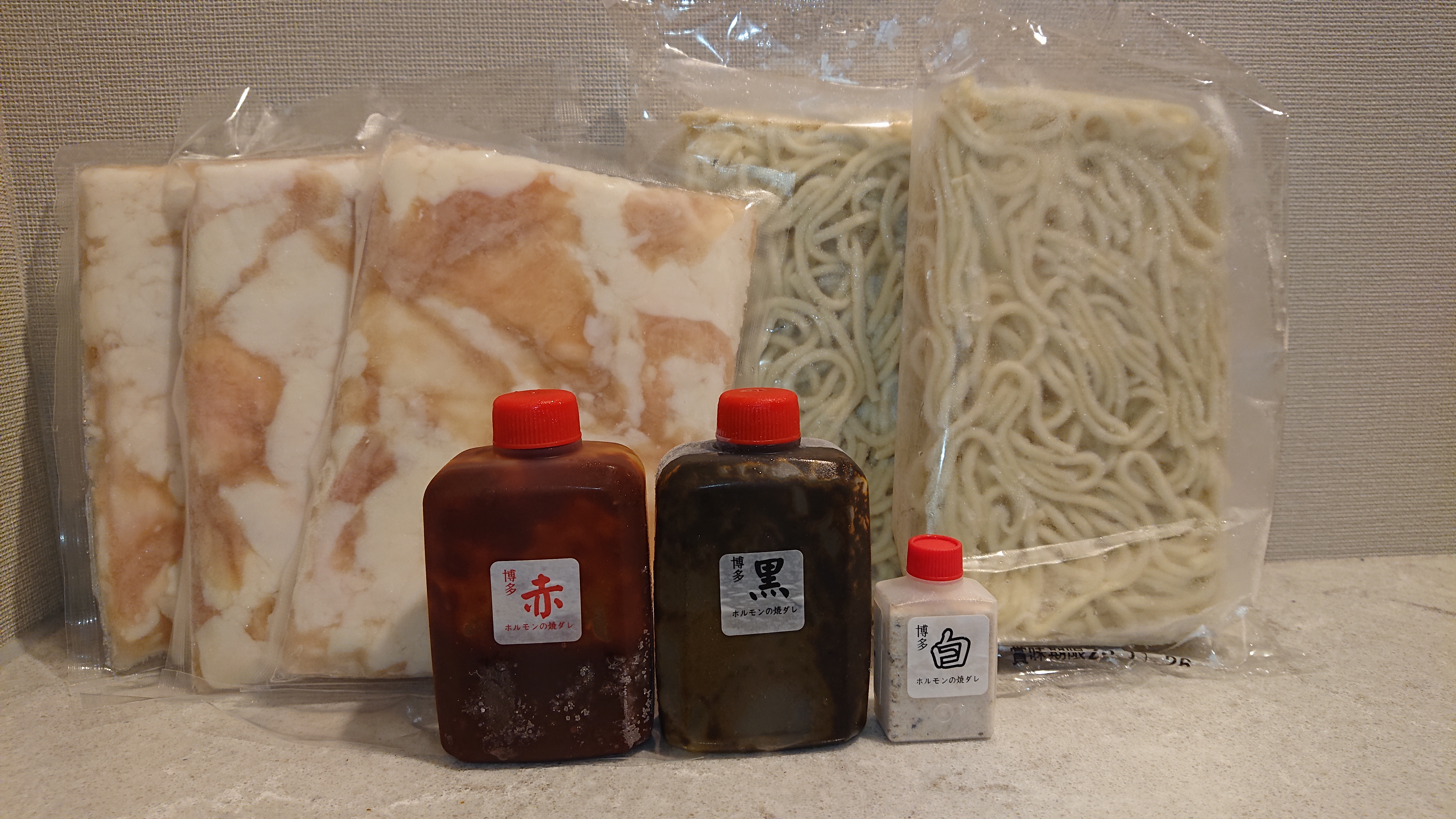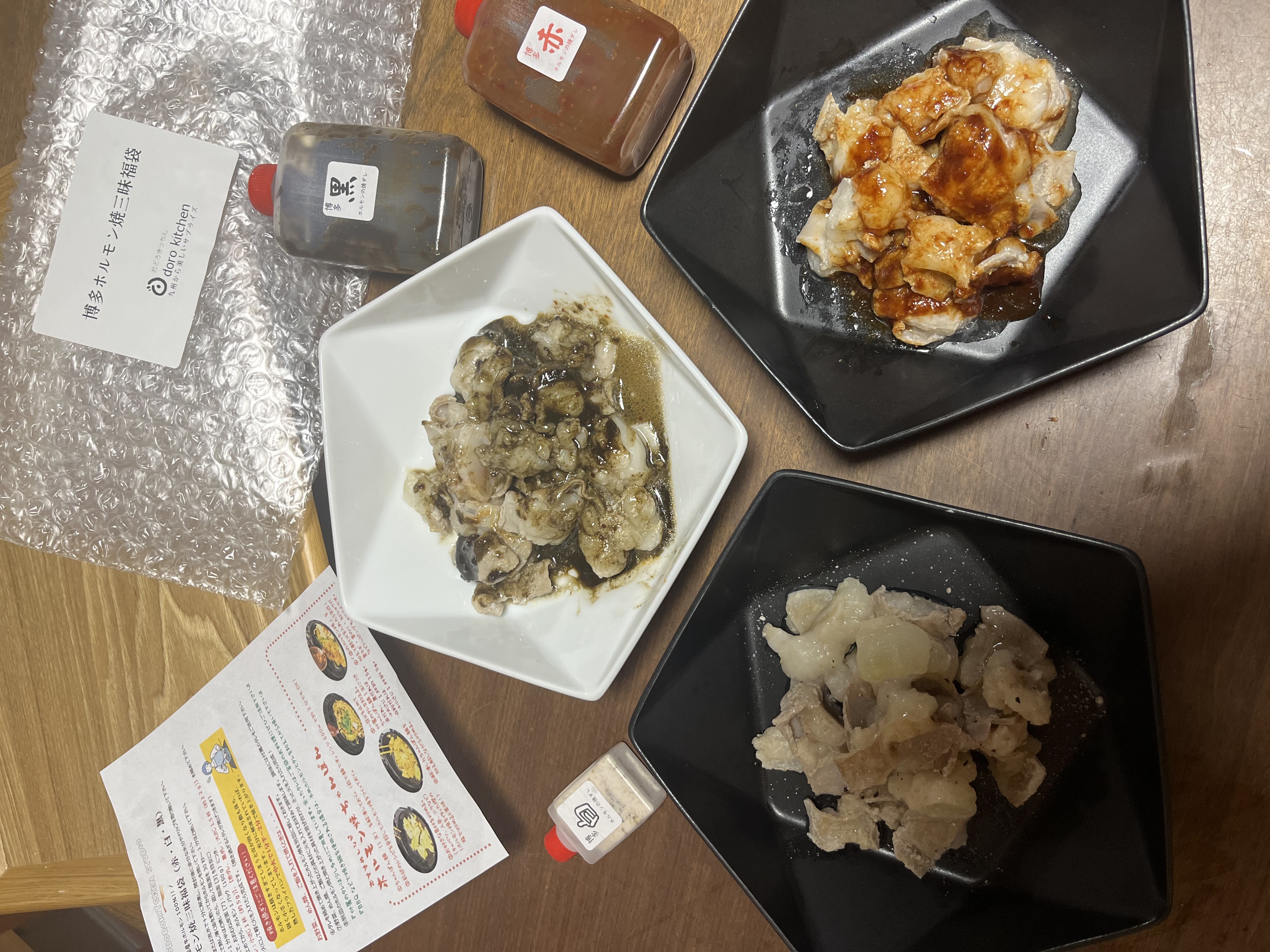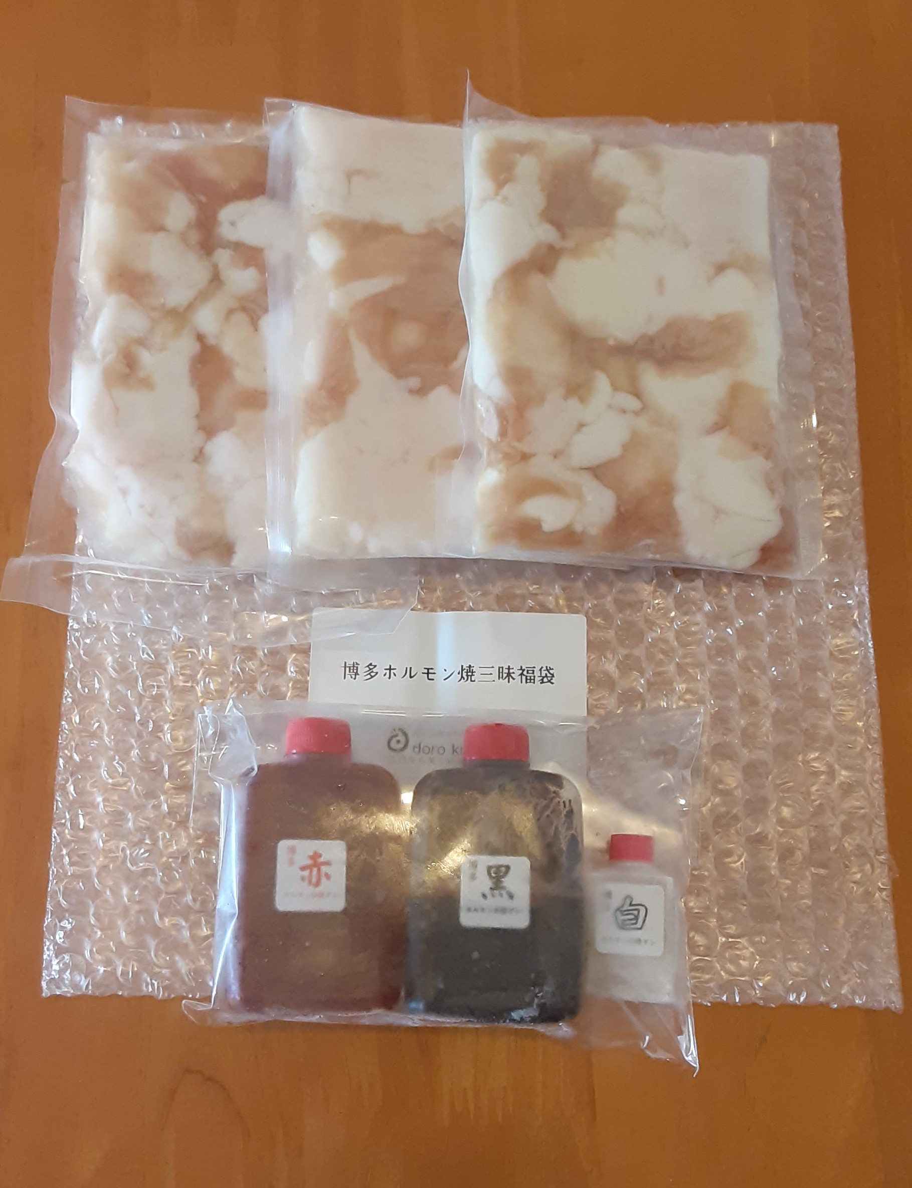 冷凍で届いてホルモンが3パックと塩、味噌、黒胡麻が入っていました。