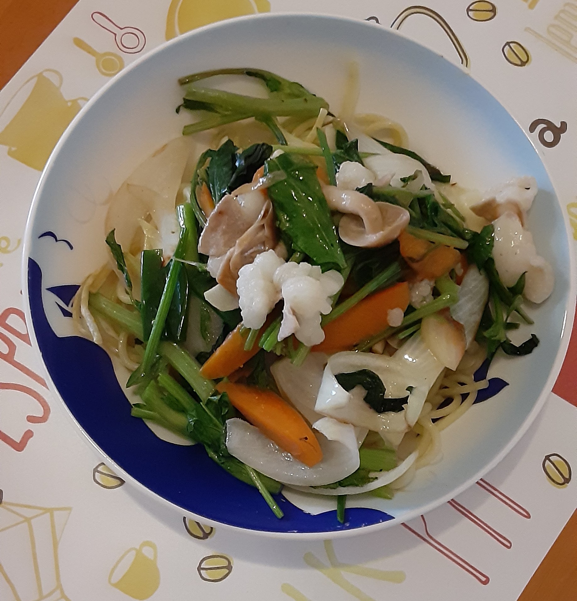 おまけの麺と一緒にホルモンを焼いて食べました。