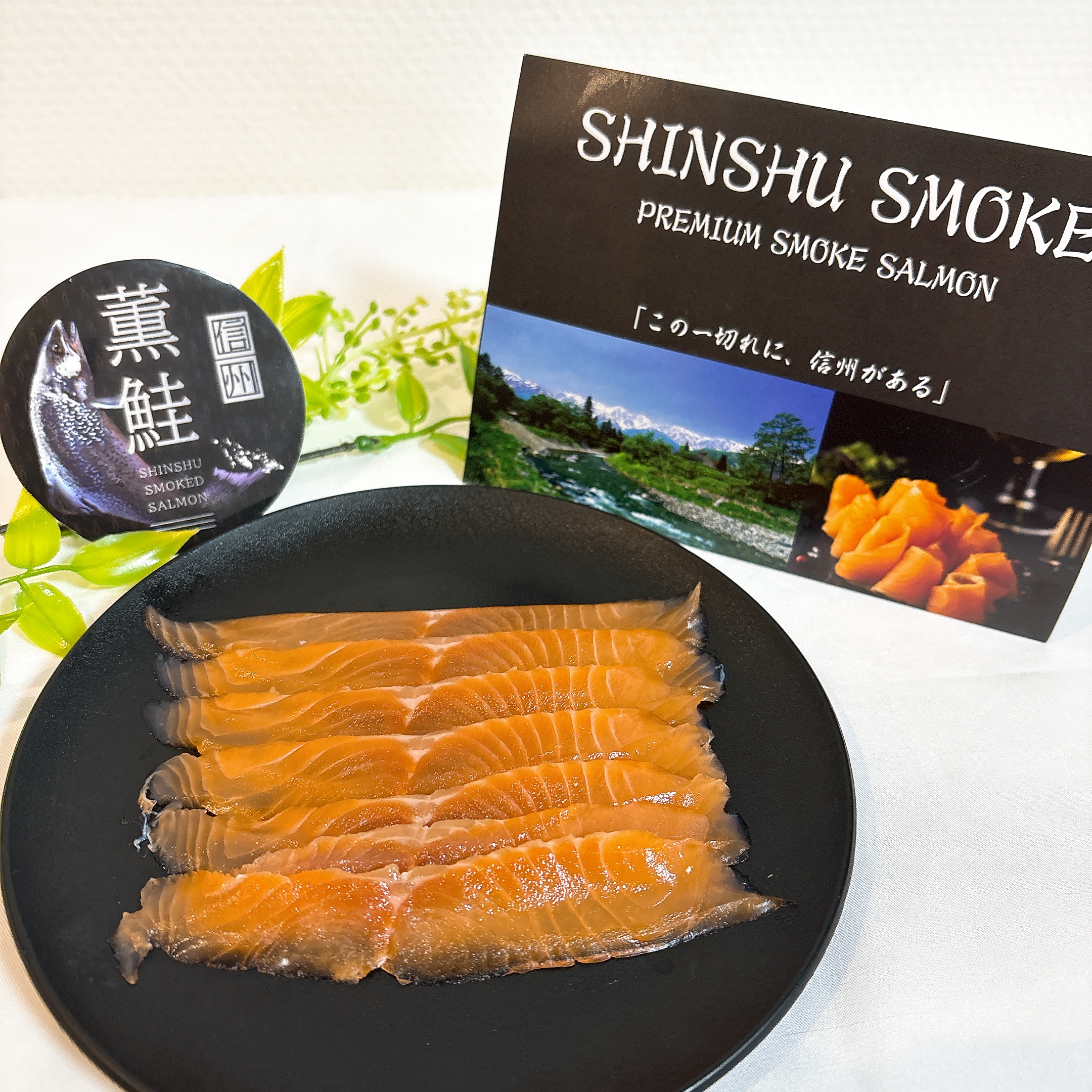 信州の自然が育んだ信州サーモンを、桜チップで1週間じっくり冷燻製した「スモークサーモン」です。信州サーモンとは「ニジマスとブラウントラウトを交配した養殖品種」で、肉質がきめ細かく、適度な脂がのっていて、口いっぱいに広がる豊かな風味ととろけるような舌触りが特徴です。スモークサーモンにすると、芳醇な香りと深い旨味、しっとりとした食感が楽しめます。アニサキスフリーで無添加、保存料不使用。冷凍で届くので、解凍後すぐに楽しめます。そのまま食べるだけでなく、サラダやバゲット、酒のお供にもぴったりです。