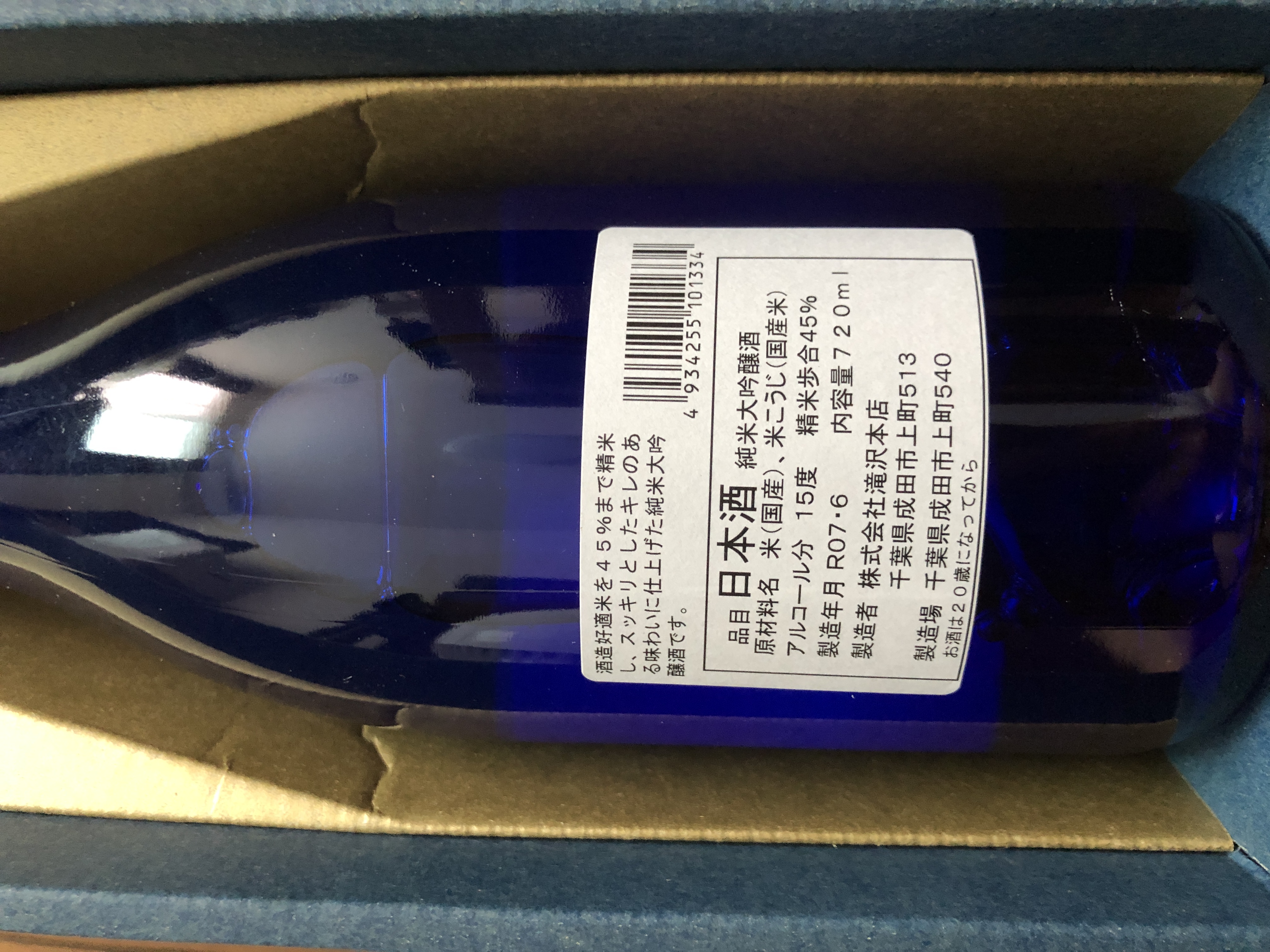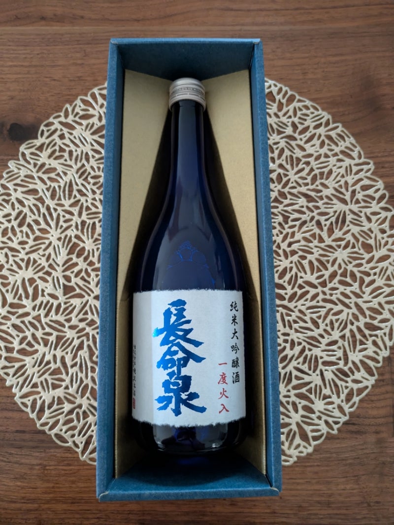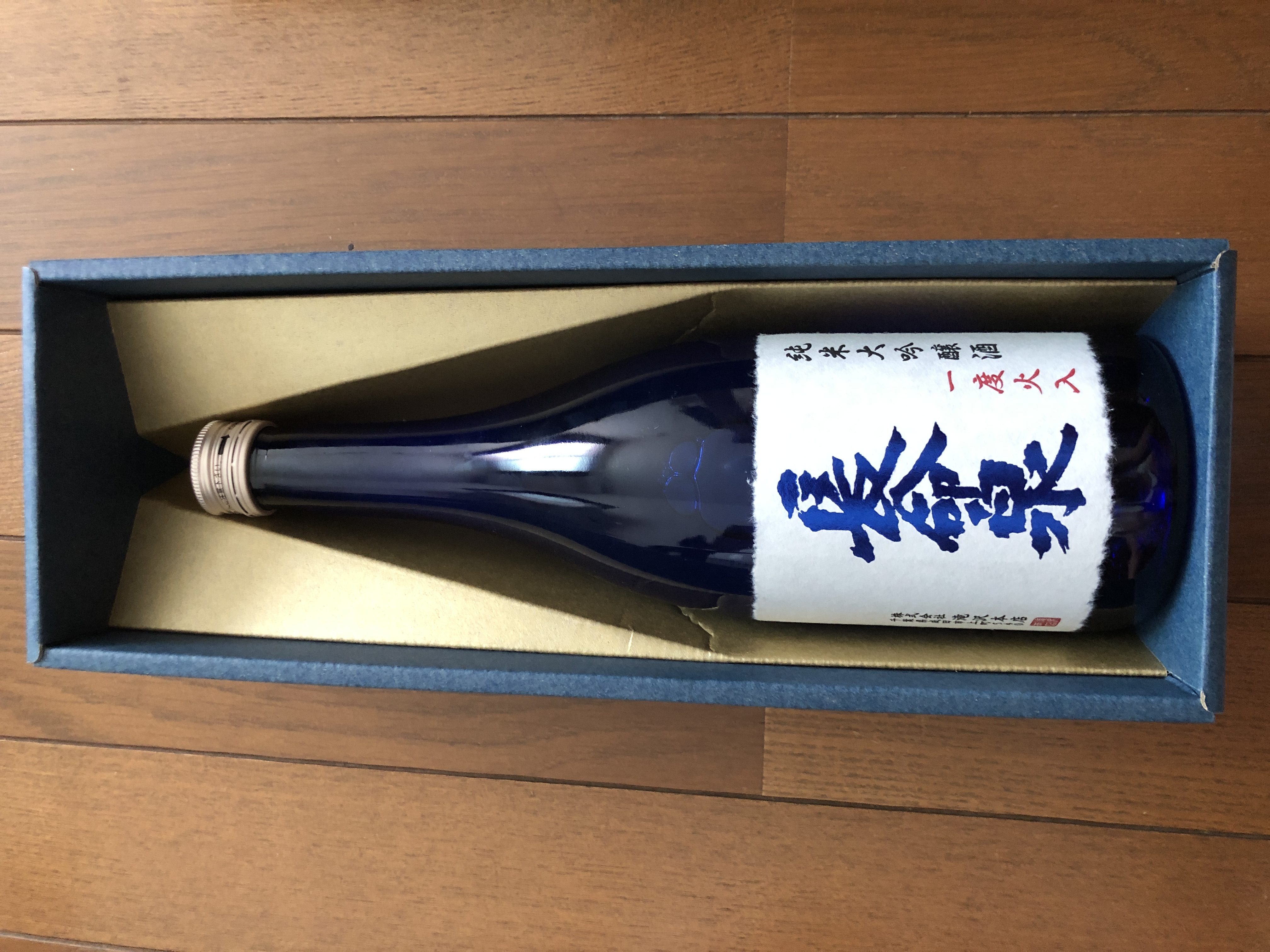 瑠璃色の瓶に詰められた「純米大吟醸酒」です。酒造好適米の代表で「酒米の王」とも呼ばれる兵庫県・岡山県産の雄町の山田錦を使用しています。純米大吟醸ならではの華やかな香りとコクのある味わいが特長です。通常は2度行われる火入れを瓶詰め時の1度だけに抑え、繊細な香りを残しています。瓶の色合いから女性に好まれる商品で、紺色のかぶせ箱に入っており、ギフトにもおすすめです。