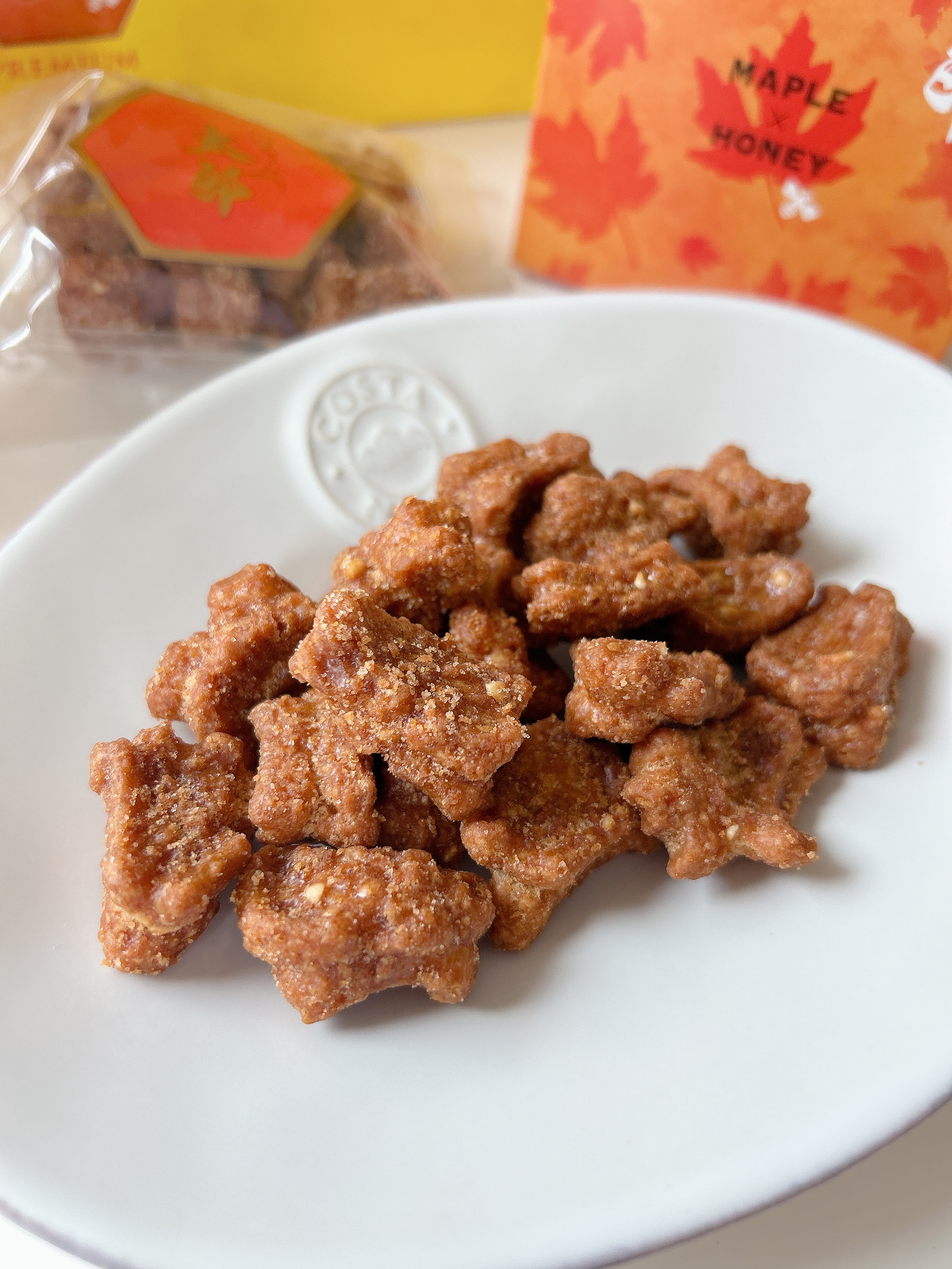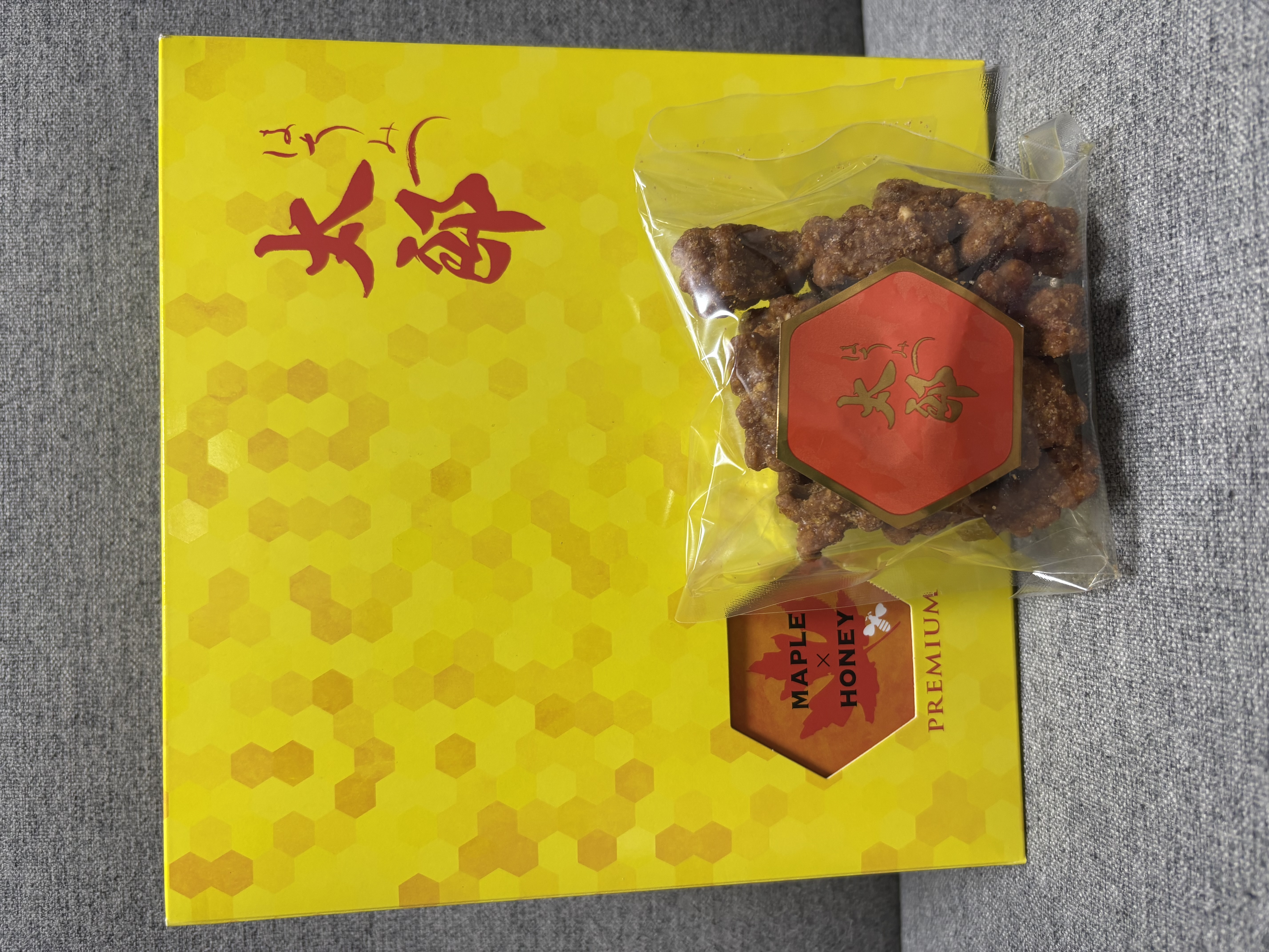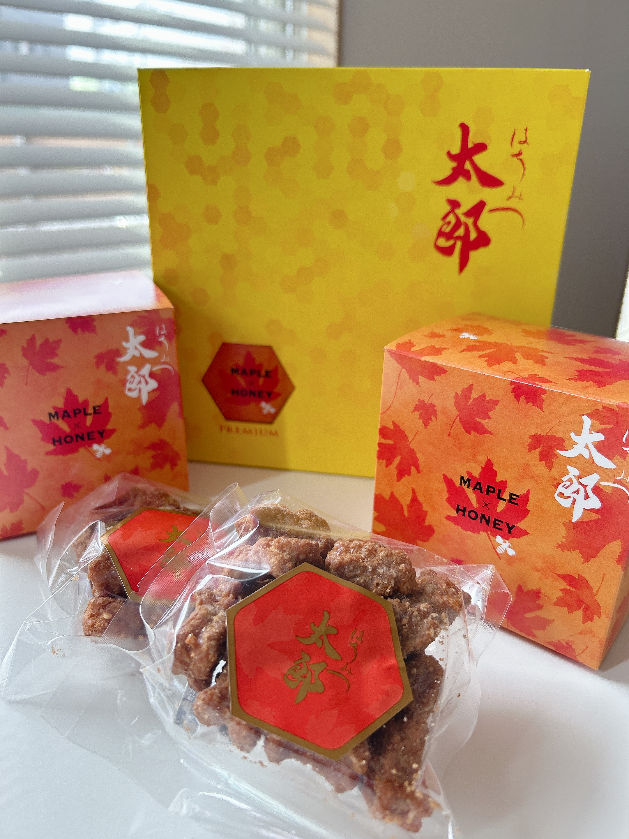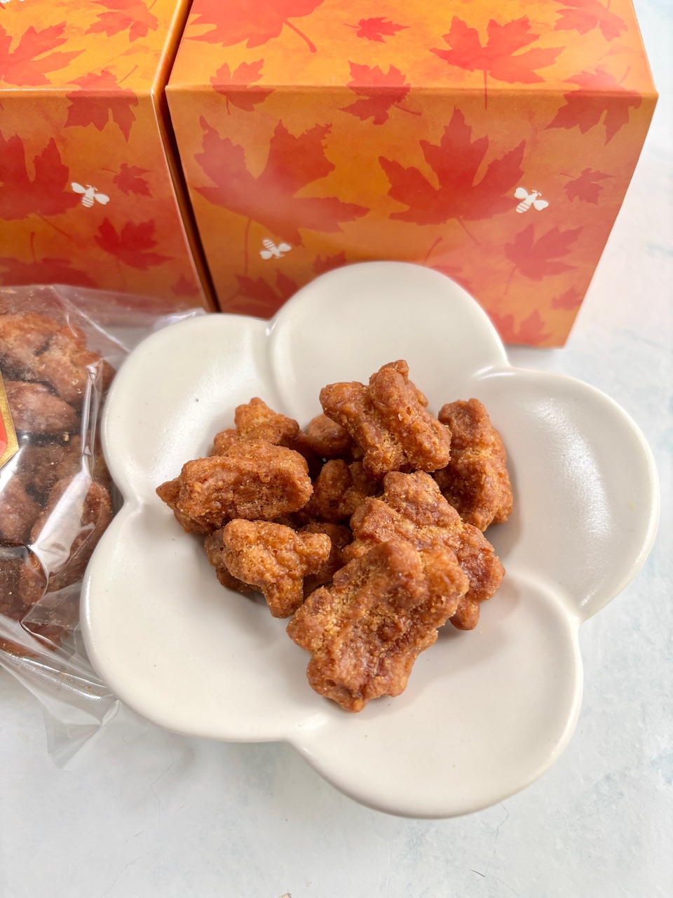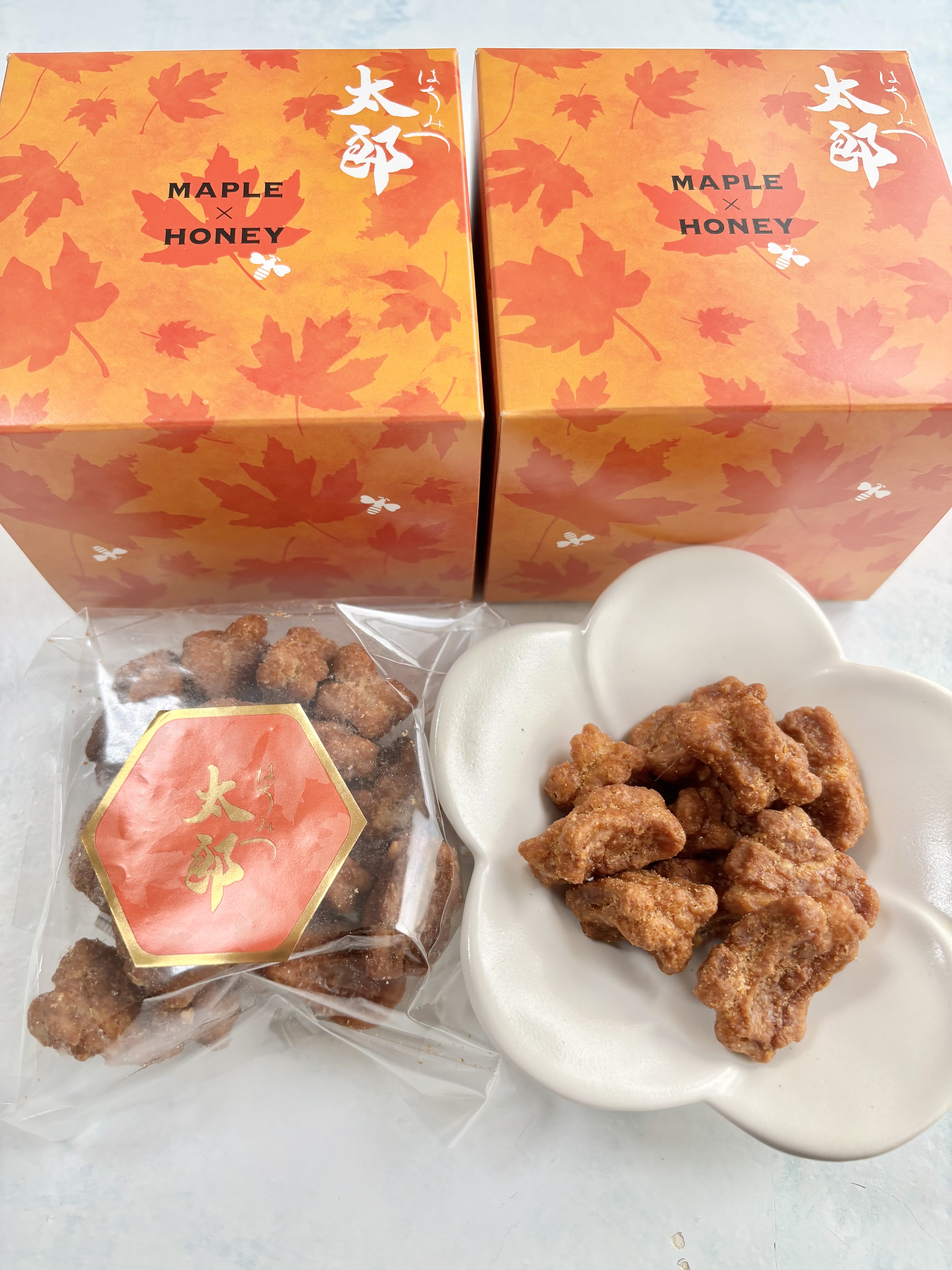 ハチミツの優しい甘み、ザクザクとした食感がやみつきになる「揚げ菓子」です。やさしい甘さのはちみつに香り高いメープルの風味を重ねた、上品で奥行きのある味わいで、砕いたピーナッツの塩気が感じられます。ふわりと広がる芳醇な香りとコクが秀逸で、大人も楽しめる商品です。お洒落なパッケージなので贈り物にもおすすめです。