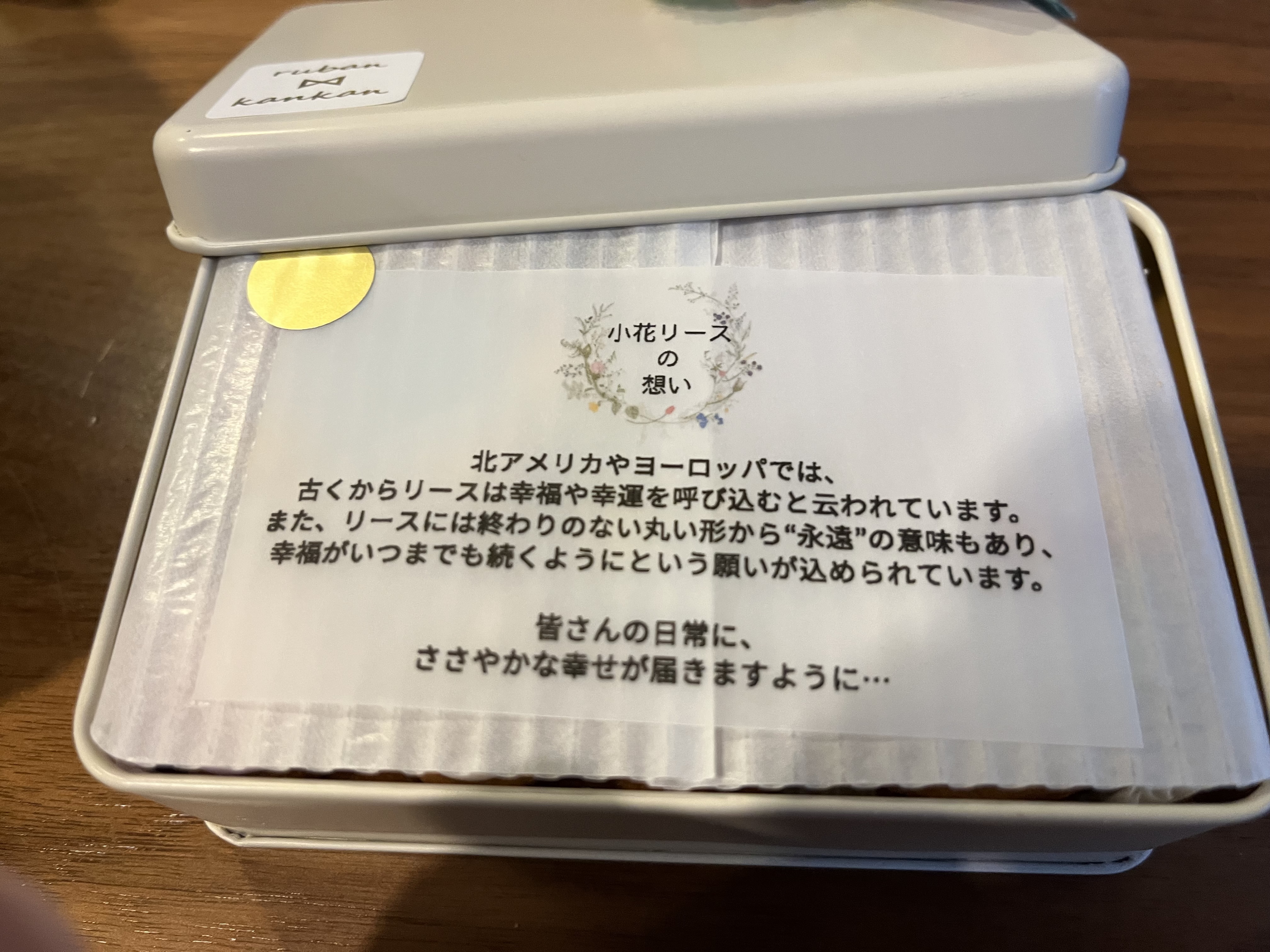 欧米ではリースは幸福や幸運を呼び込むと云われているそうです。小とりも幸運を運んできてくれそうで、なんだか縁起の良い感じ。蓋を開けた時にきっとみんなを笑顔にしてくれるクッキー缶だと思いました。