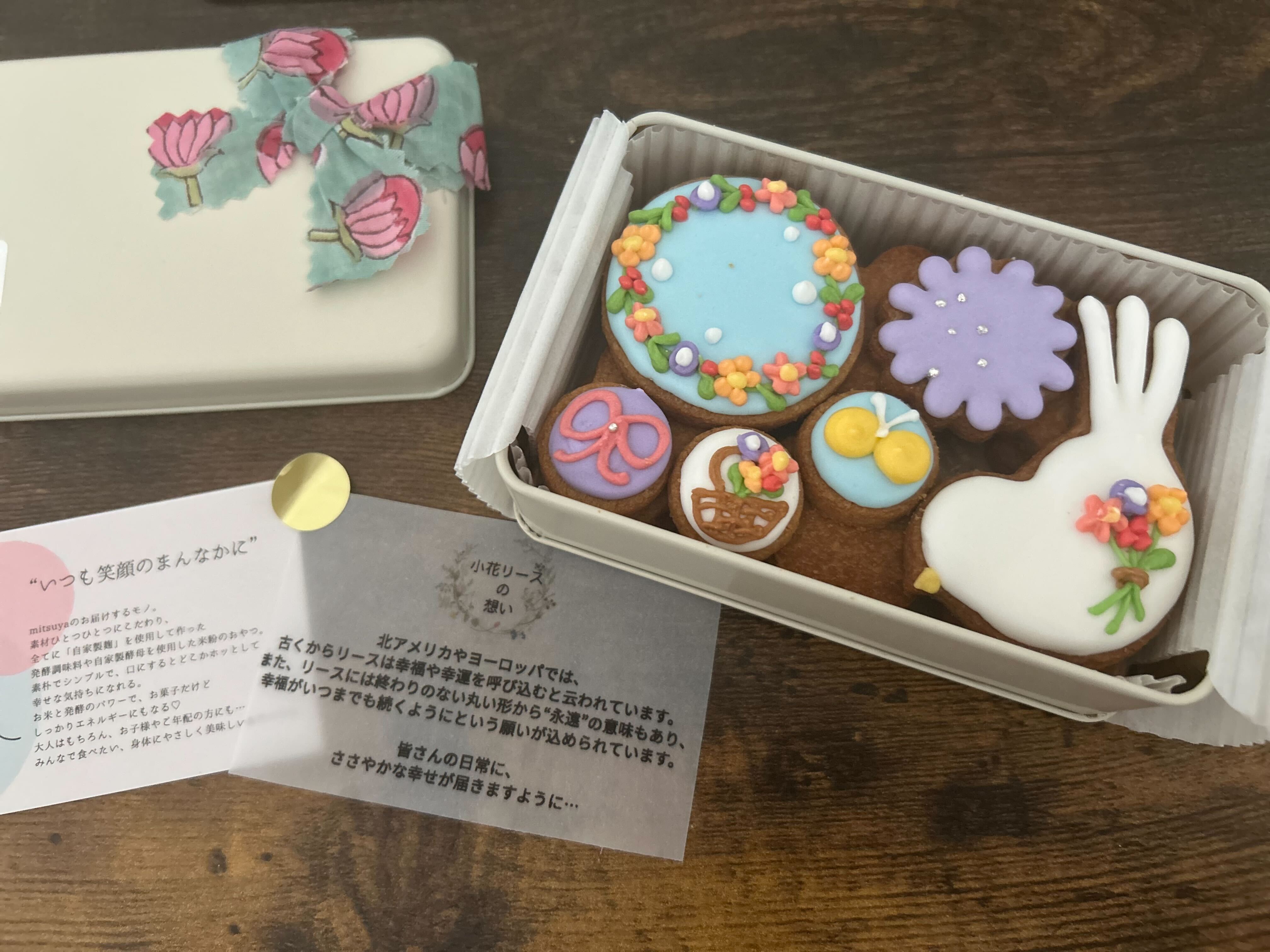 たくさんの可愛らしい小花をあしらったリースのアイシングクッキーと小とりのアイシングクッキー。それと可愛いくるみボタンのような小粒のアイシングクッキーたち。まるで絵本の表紙のようです。リースのお花の花びらや葉っぱの一つ一つがすごく丁寧でぷっくりとしていてめっちゃ可愛い。ずーっと見てられる可愛さで感激しました。