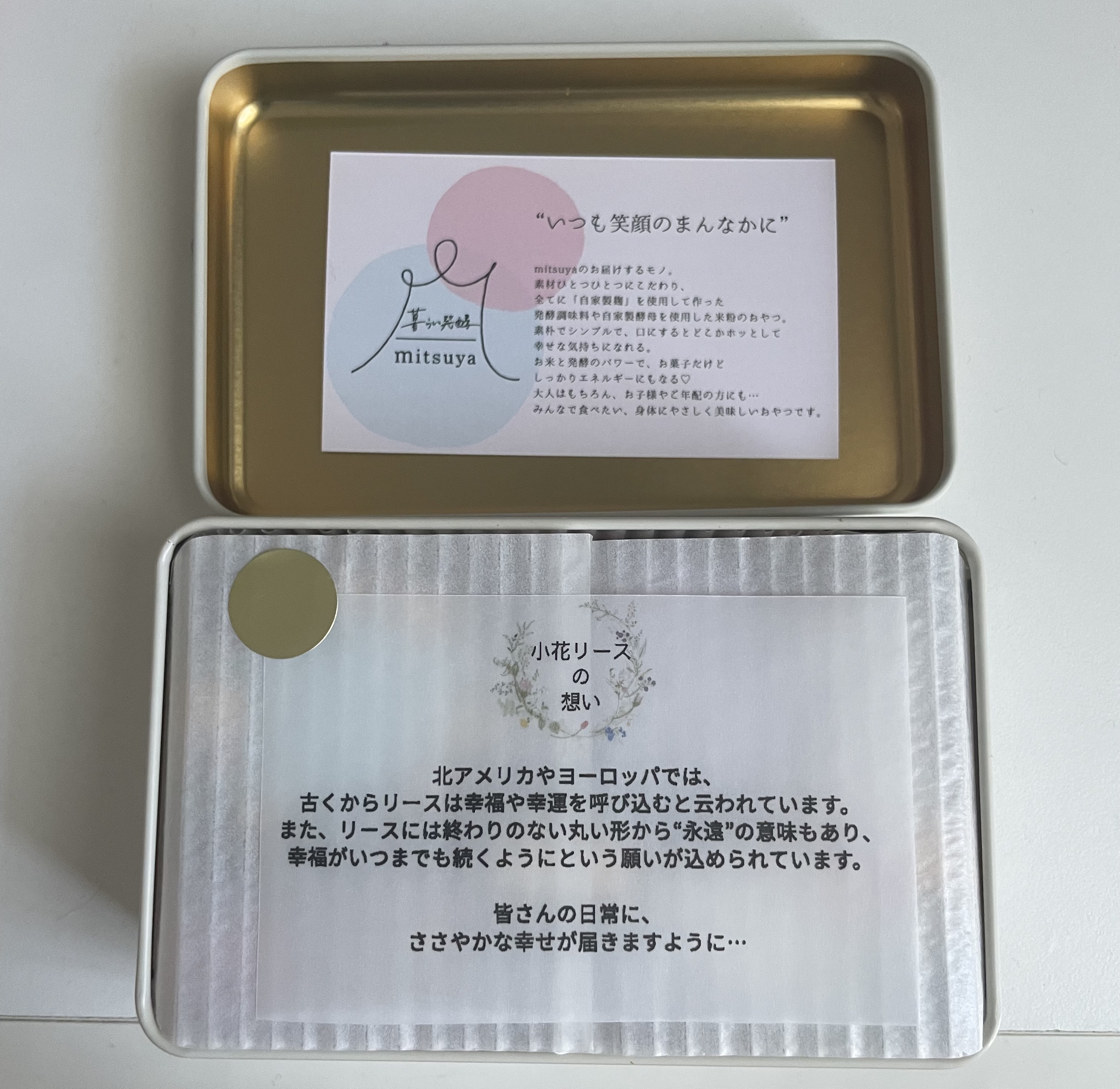 リボン付きの缶に詰められた「クッキー缶」です。小花をあしらったリースと小鳥のアイシングが印象的なセットで、米粉と麹をたっぷり使ったオリジナルレシピのグルテンフリーな発酵クッキーです。かわいいだけでなく素材にもこだわり、甘さ控えめで小麦粉、バター、卵、砂糖不使用(アイシング部分には白砂糖・少量の卵白を使用)です。自家製酒種酵母を使用し、2日間熟成させた米粉の生地で作っています。かわいさがぎゅっと詰まったクッキー缶なので、自宅用だけでなく贈り物にもおすすめです。