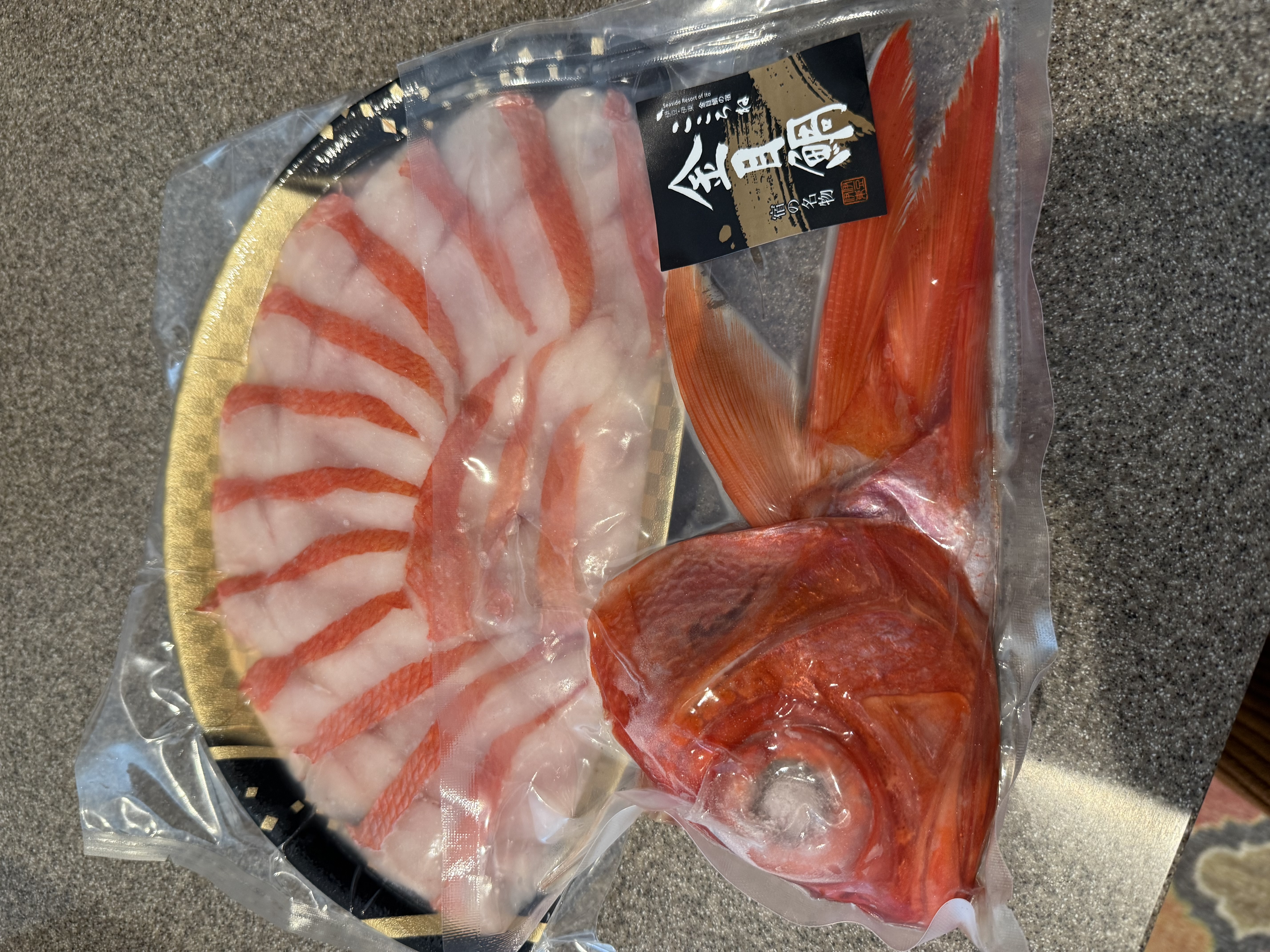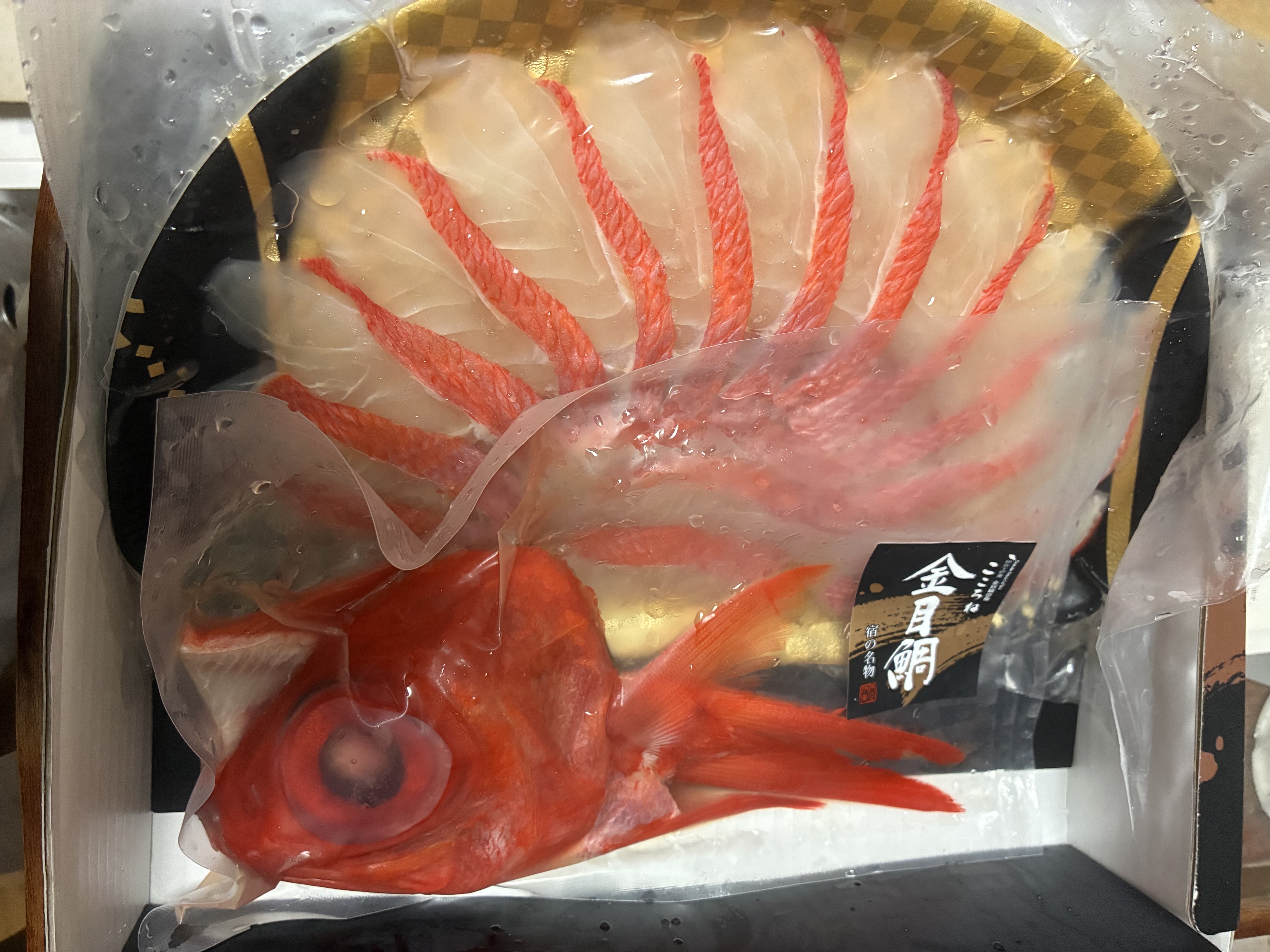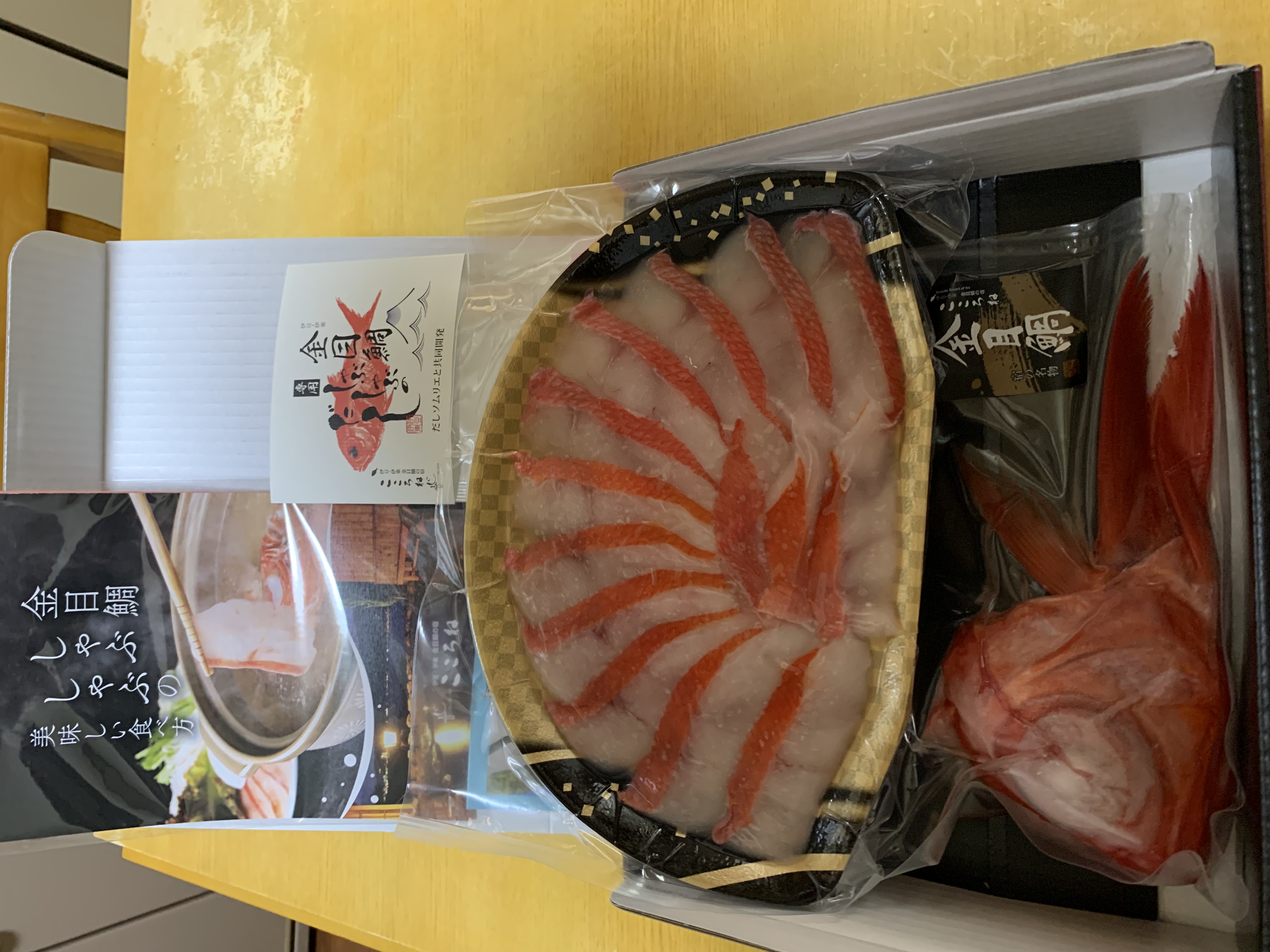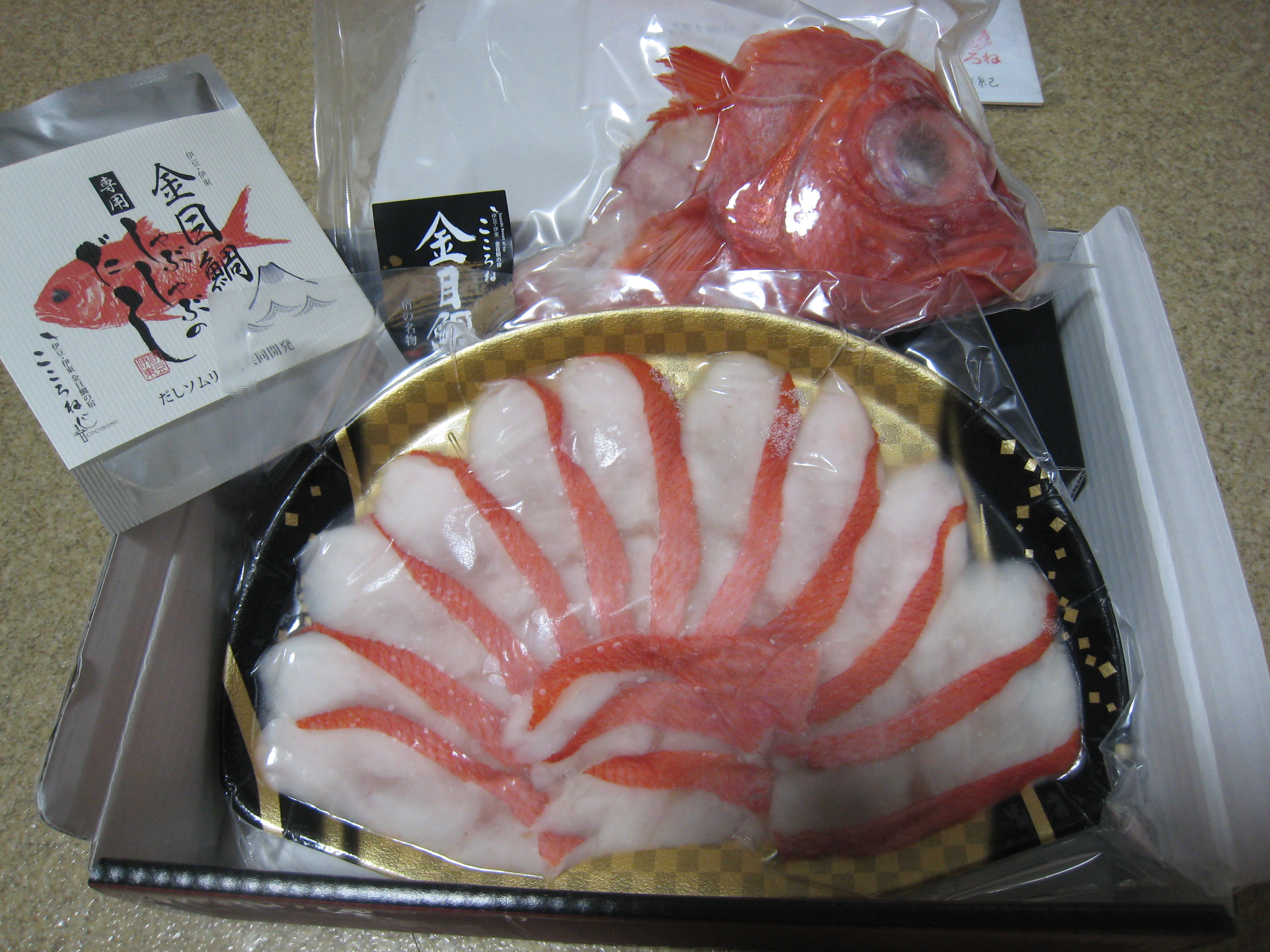 真空パックで届いたのはしゃぶしゃぶの金目鯛の切り身とお出汁用のあら、出汁のセットでしたが、鯛が赤く光り輝いていて開封するなりワクワクした気持ちに。これは贈答品としてもぴったりだと思います。