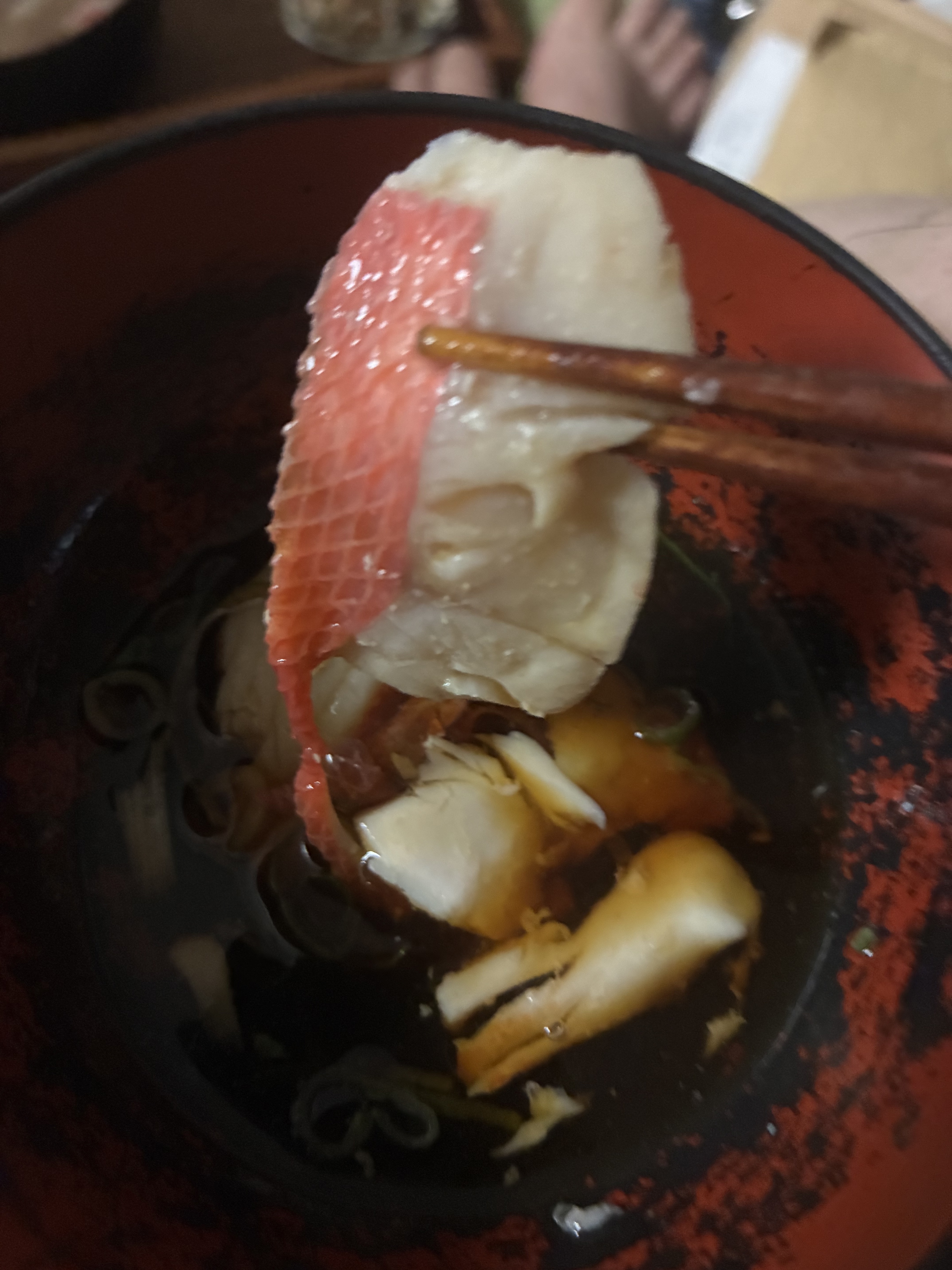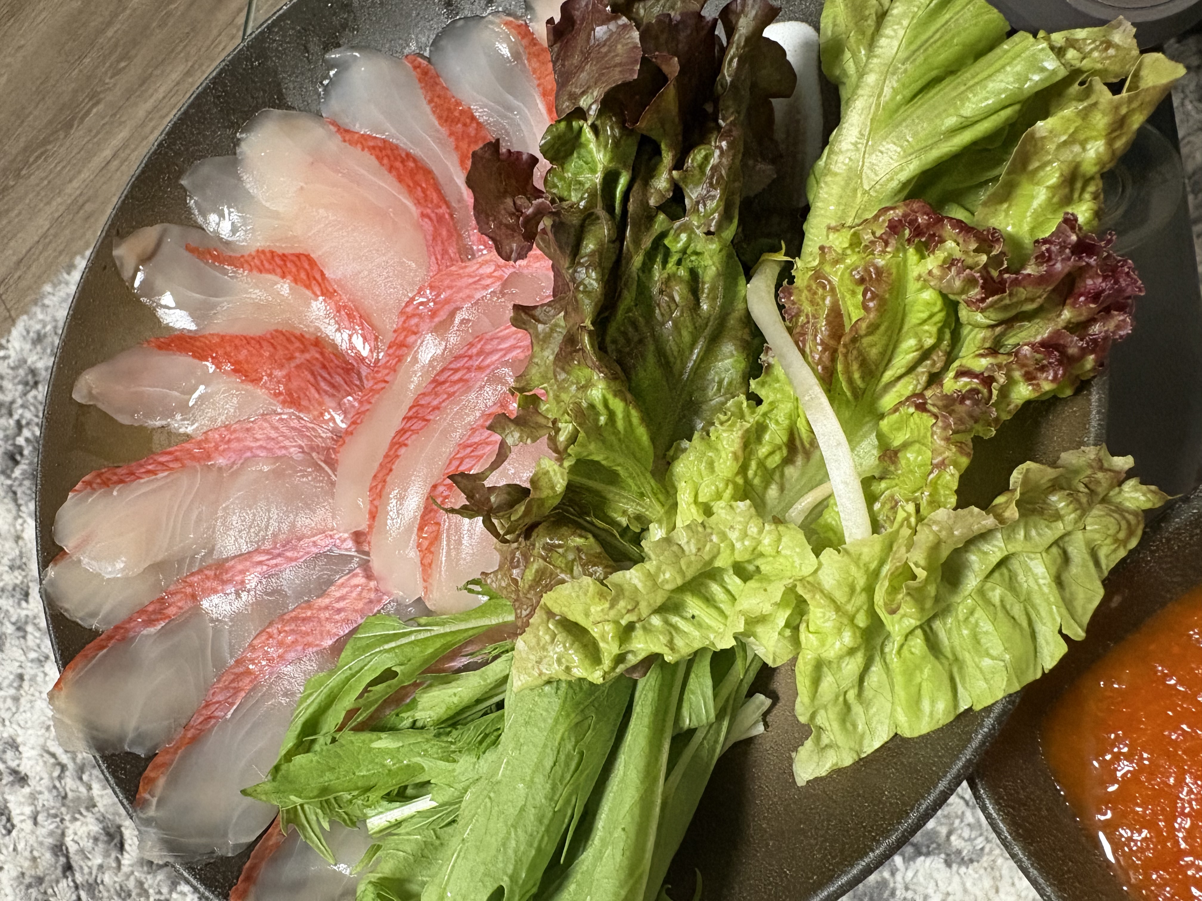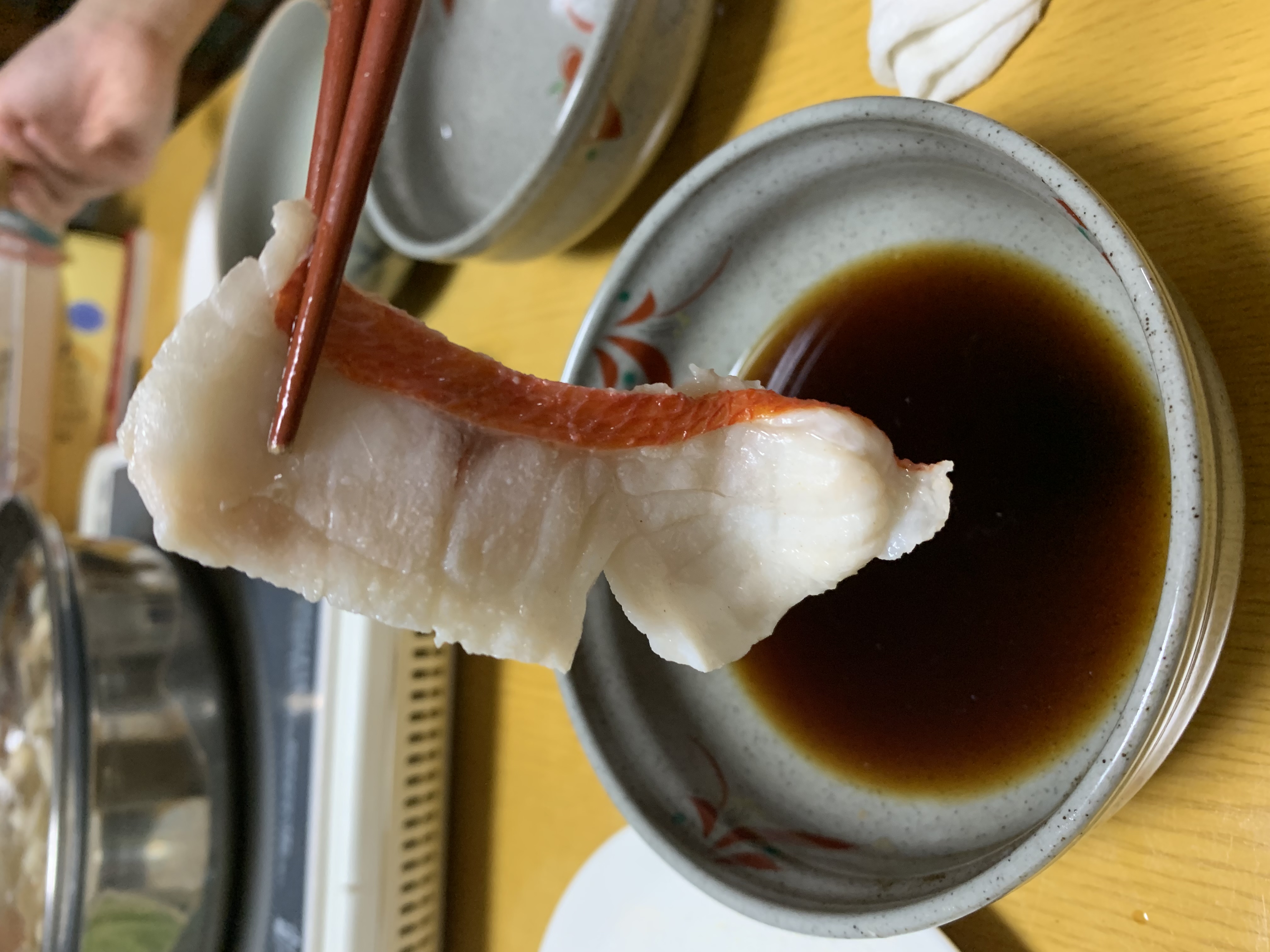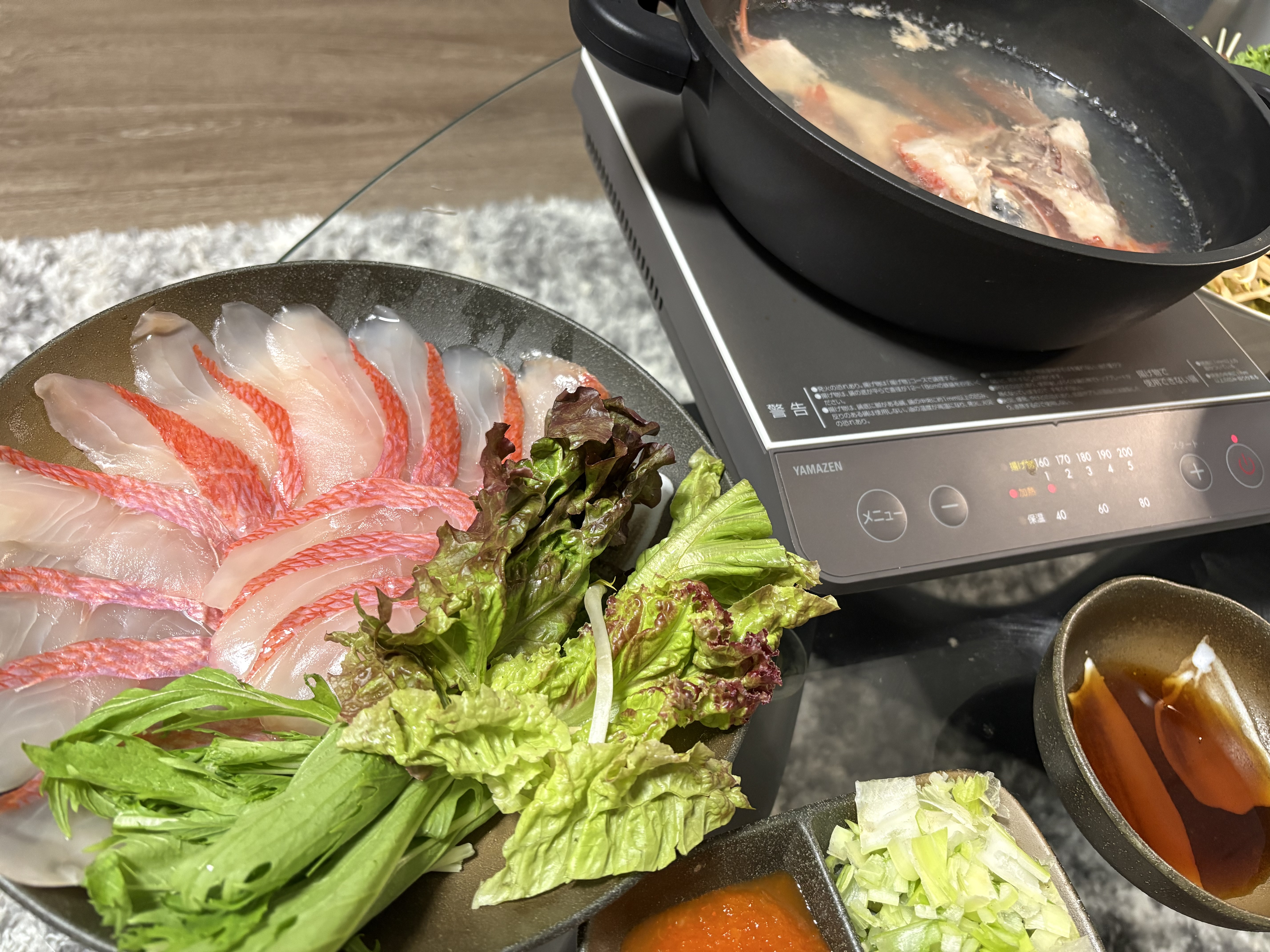 たっぷりのお野菜と一緒に人生初の金目鯛しゃぶしゃぶをいただきましたが、魚の味が引き締まっていて、かつふわっとした食感でとても美味しい…!生臭さも全くありませんでした。鯛本来の美味しさで上品な味わいでした。